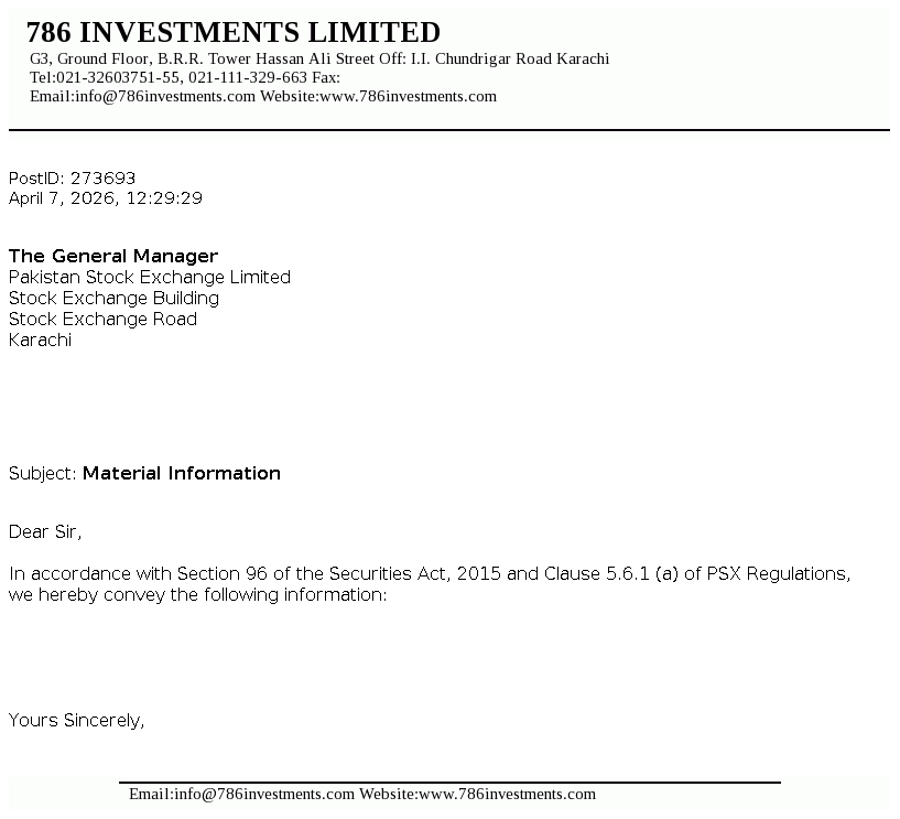 786 Investments Limited was incorporated on September 18, 1990 as a public limited Company in Pakistan. The company is registered as a Non-Banking Finance Company under the Non-Banking Finance Companies Rules, 2003. The Company has obtained the licenses to carry out investment advisory services and asset management services under the NBFC Rules and Non Banking Finance Companies and Notified Entities Regulations 2008.