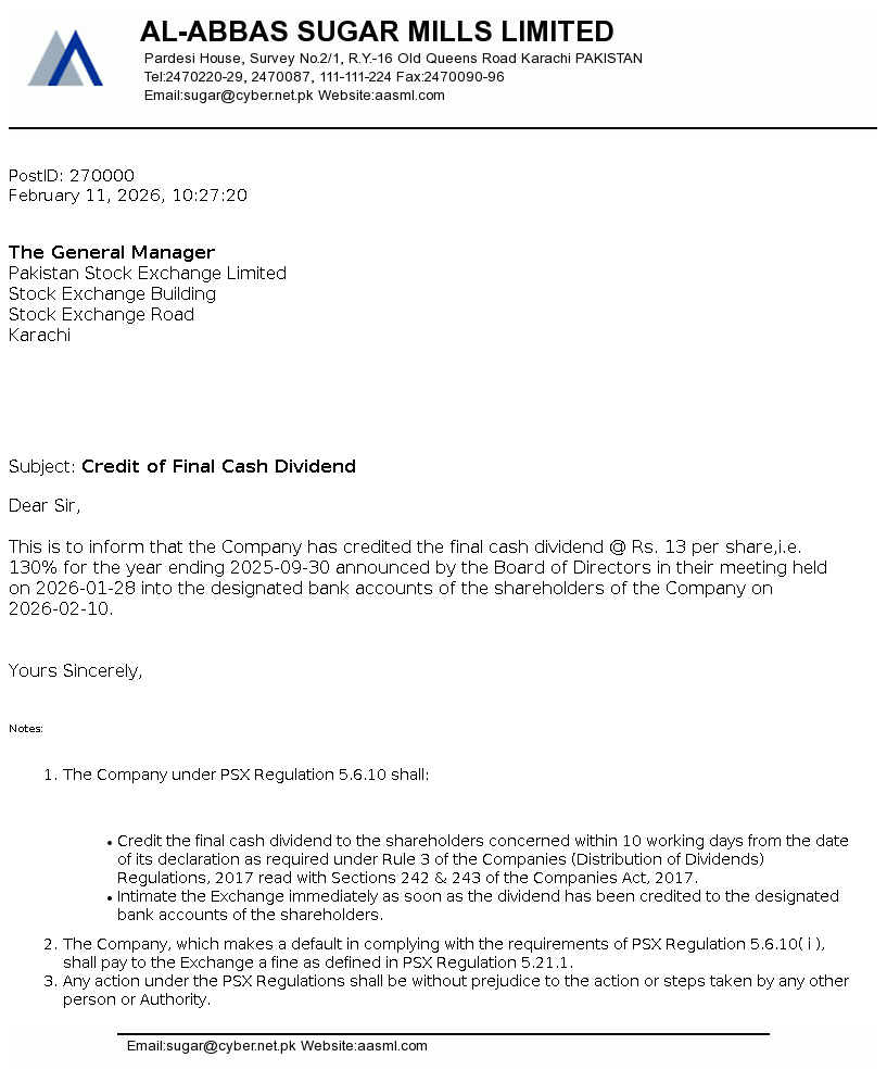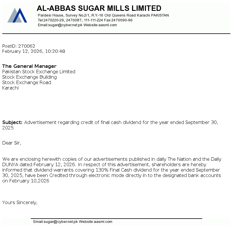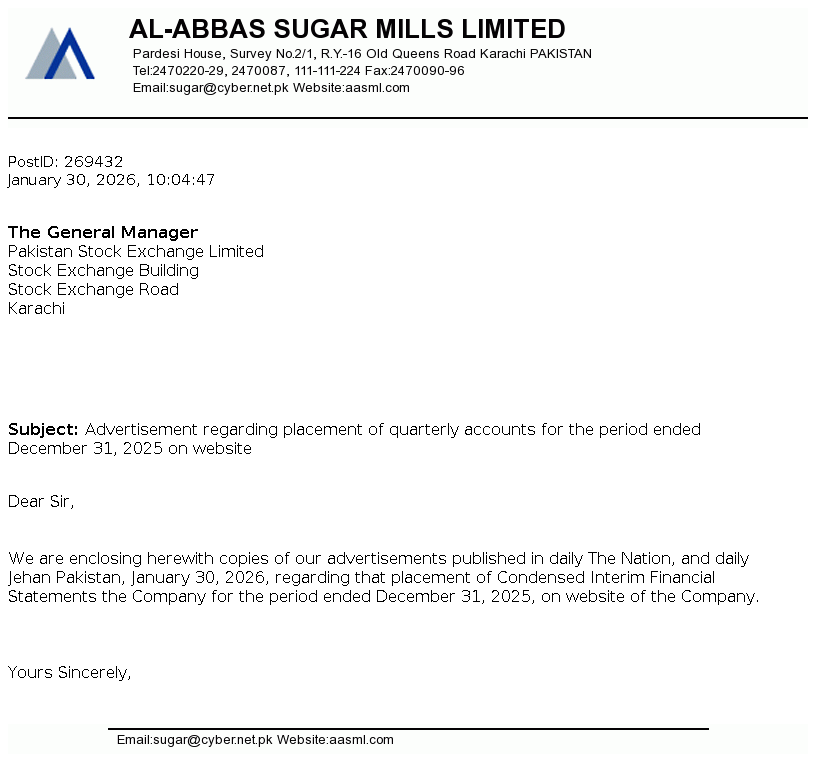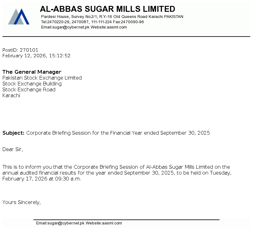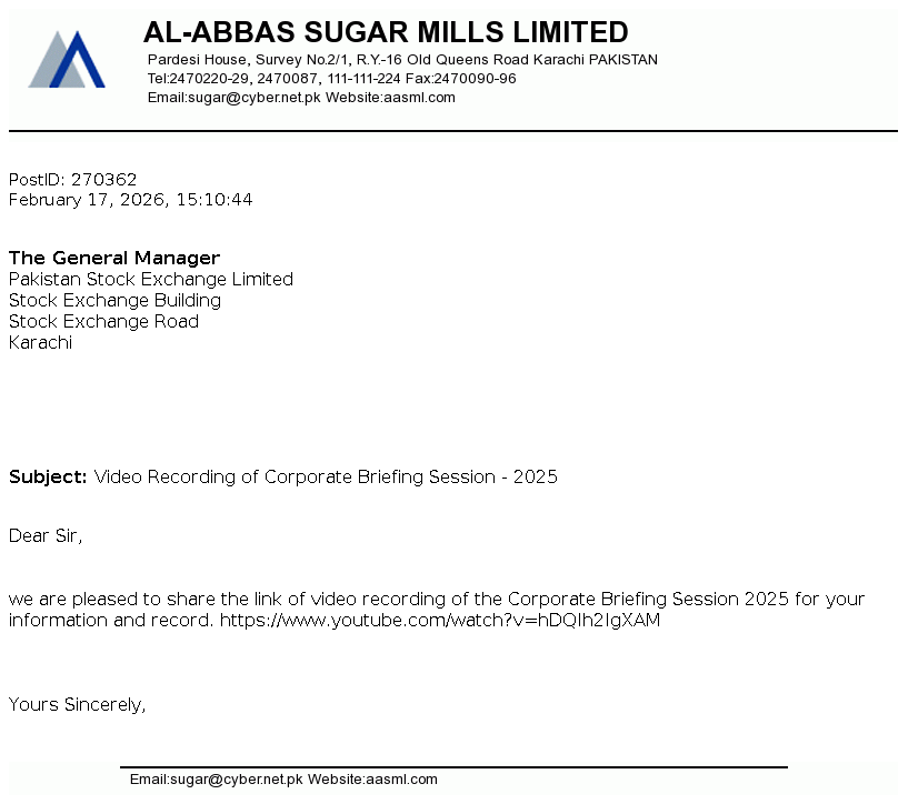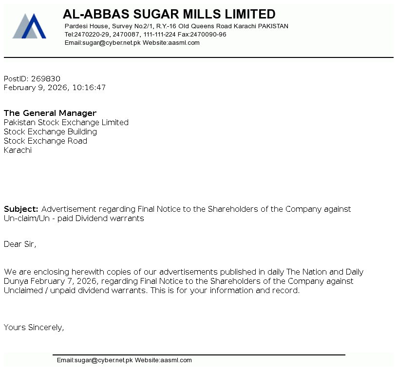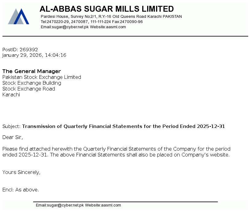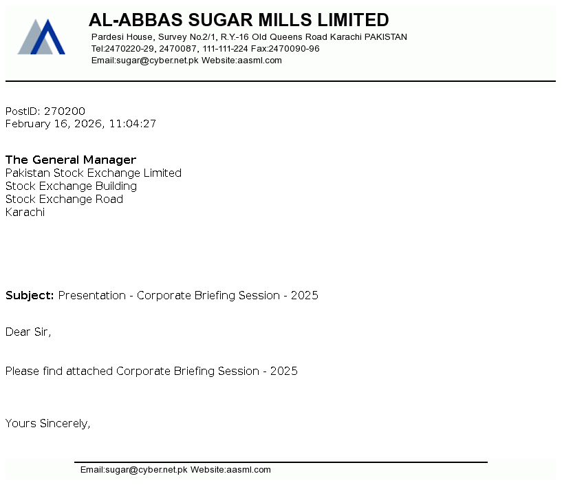 Al-Abbas Sugar Mills Limited was incorporated in Pakistan on May 2, 1991 as a public limited company under the repealed Companies Ordinance, 1984 (now the Companies Act, 2017). The principal activities of the Company under following business segments / divisions comprises of Sugar, Ethanol, Chemical and alloys and Power and Tank Terminal.