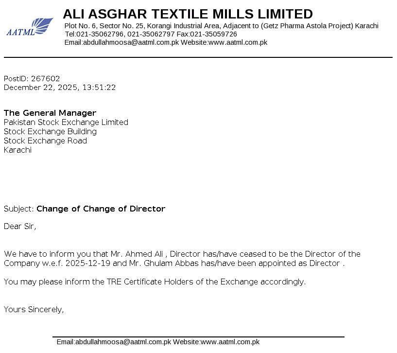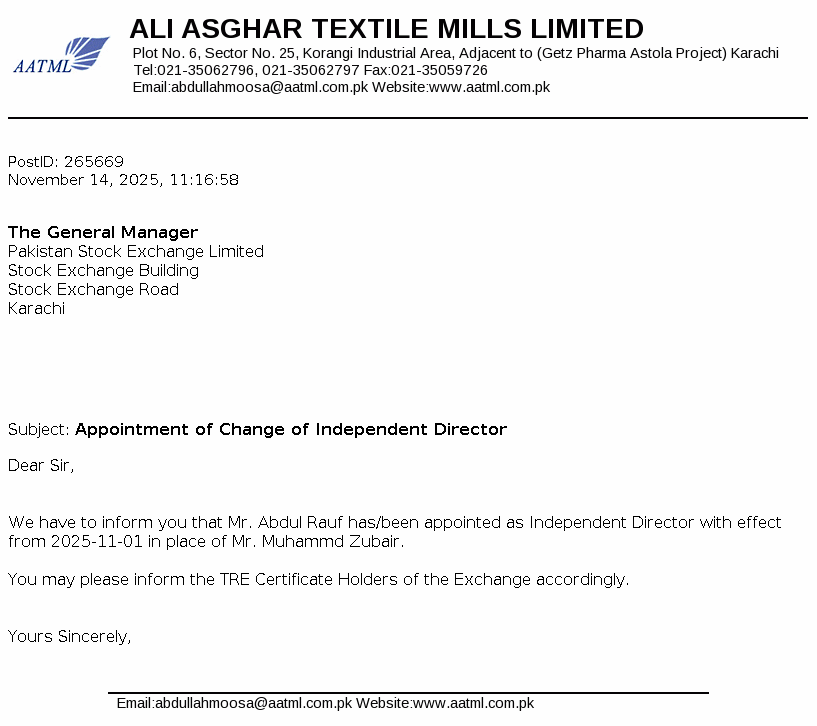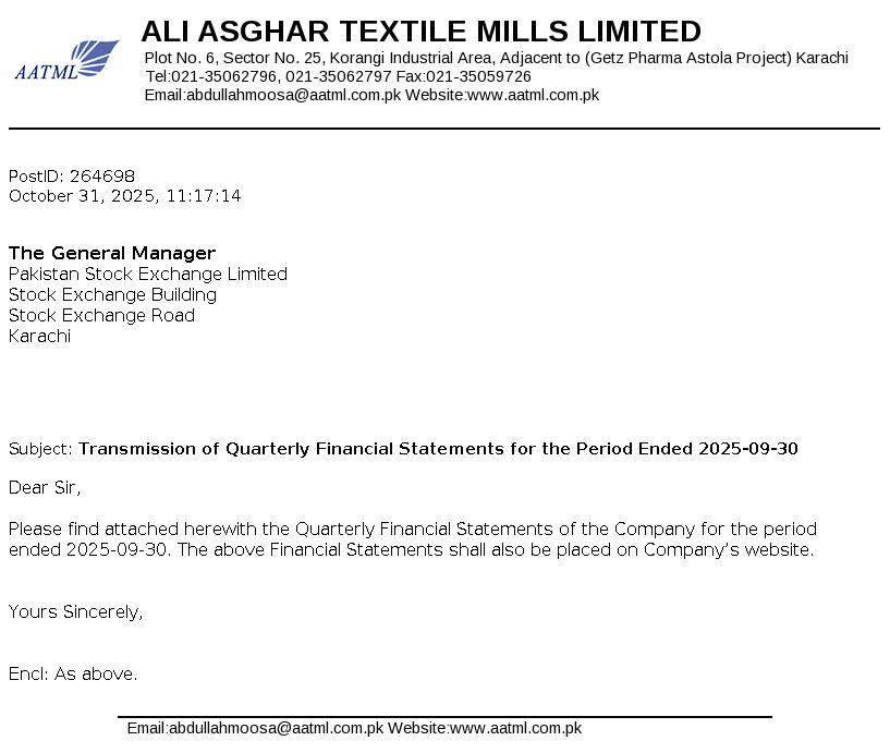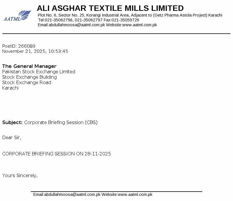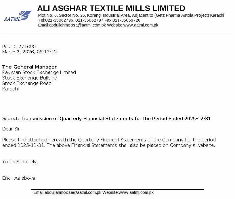 Ali Asghar Textile Mills Limited was incorporated in Pakistan on February 9, 1967 as a public limited companyunder the Companies Act, 1913. The principal line of business is to provide the services of logistics, warehouse, construction, rental and allied business.