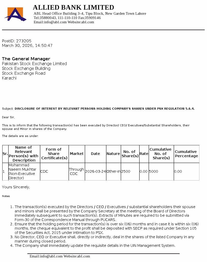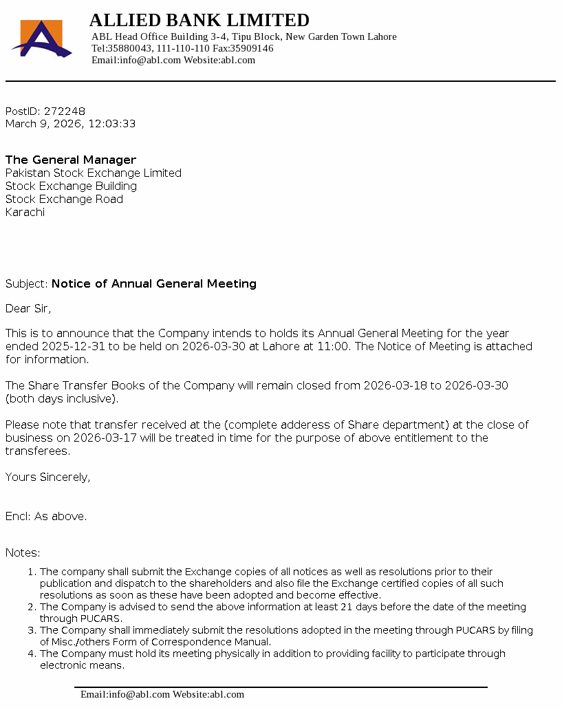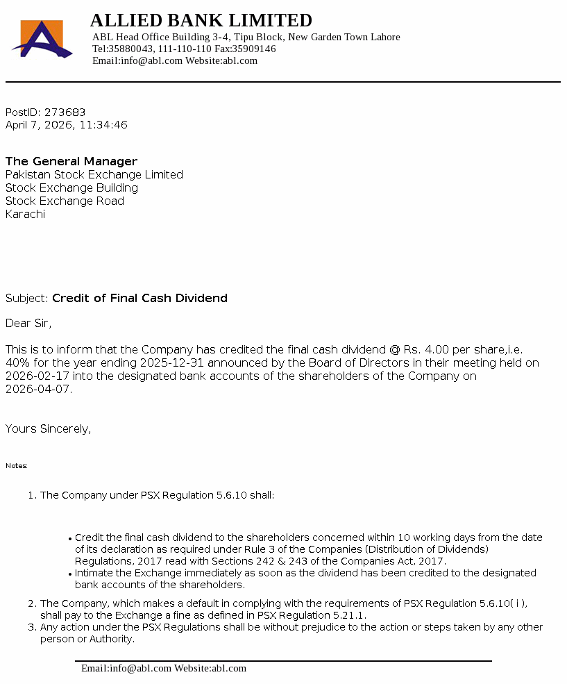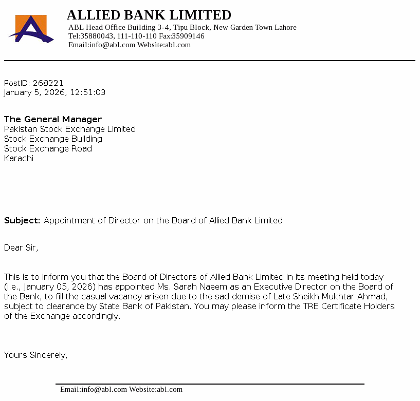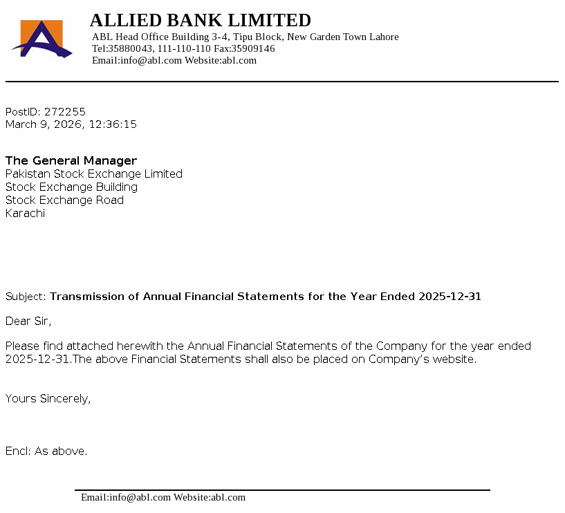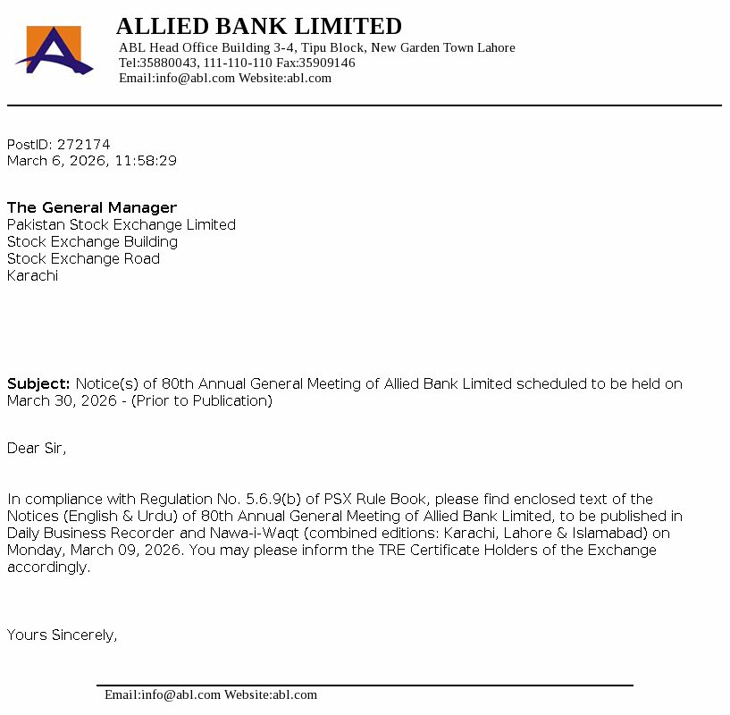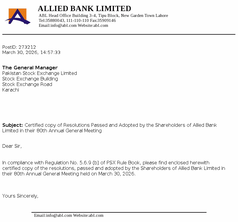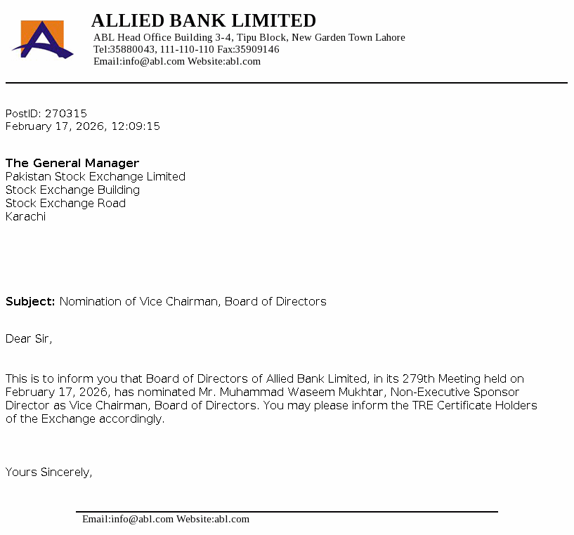 Allied Bank Limited, incorporated in Pakistan, is a scheduled Bank, engaged in commercial banking and related services. The long term credit rating of the Bank assigned by the Pakistan Credit Rating Agency Limited (PACRA) is ‘AAA’. Short term rating of the Bank is ‘A1+’. Ibrahim Holdings (Private) Limited is the parent company of the Bank and it’s registered office is in Pakistan. The Bank is the holding company of ABL Asset Management Company Limited.
