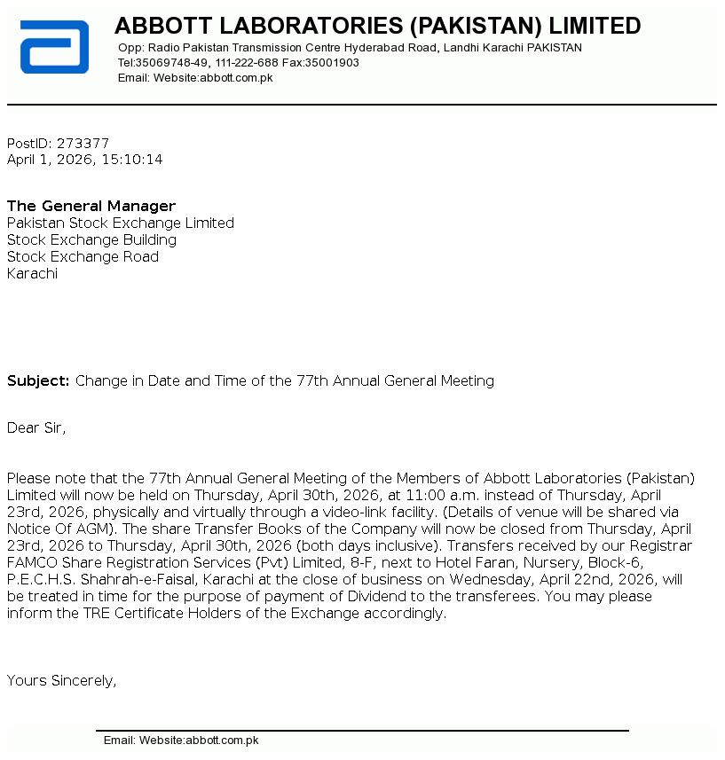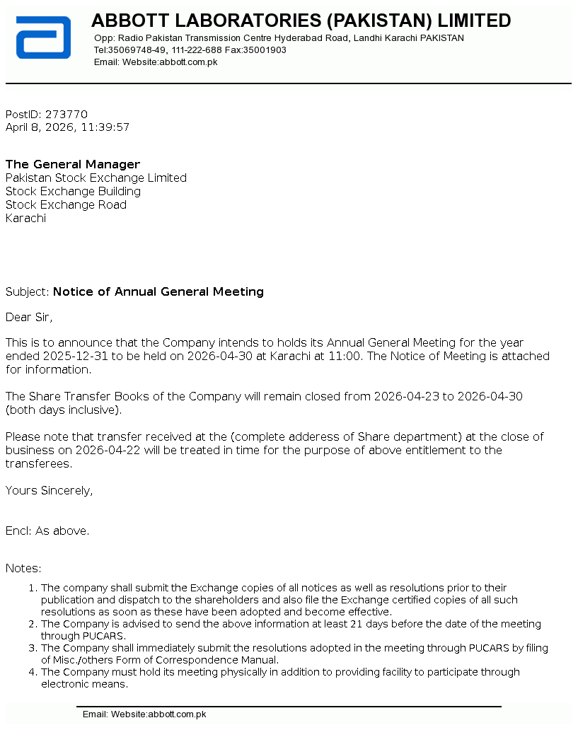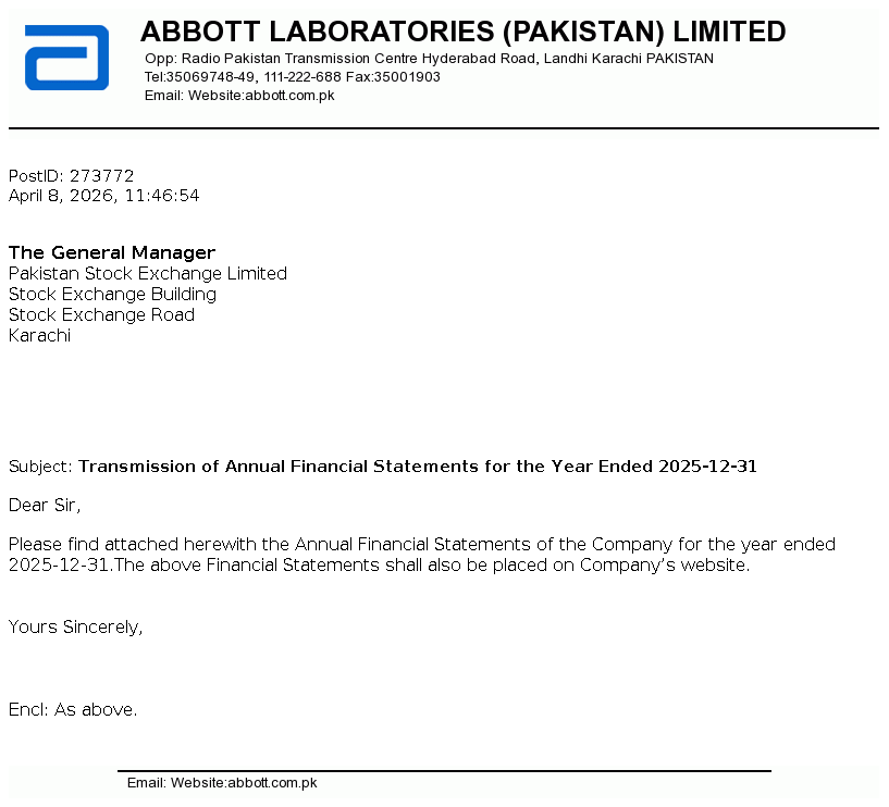 Abbott Laboratories (Pakistan) Limited is a public limited company incorporated in Pakistan on July 02, 1948. The Company is principally engaged in the manufacture, import and marketing of branded generic pharmaceutical, nutritional, diagnostic, diabetes care, molecular devices, hospital and consumer products.