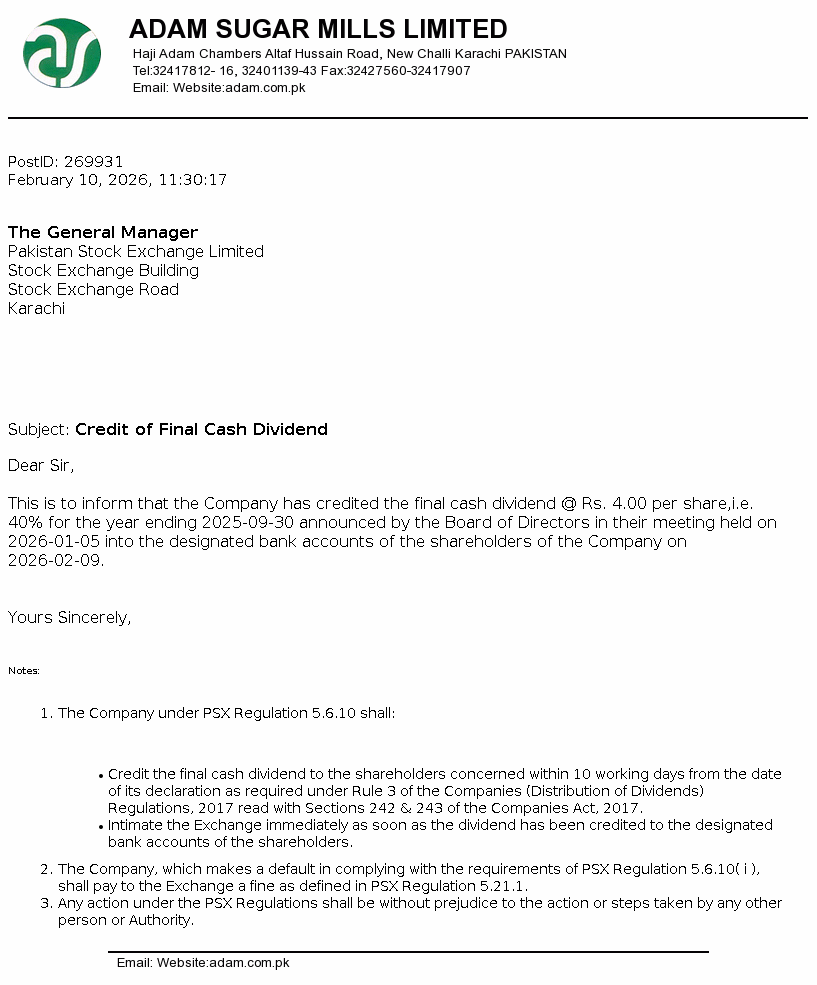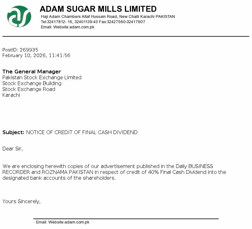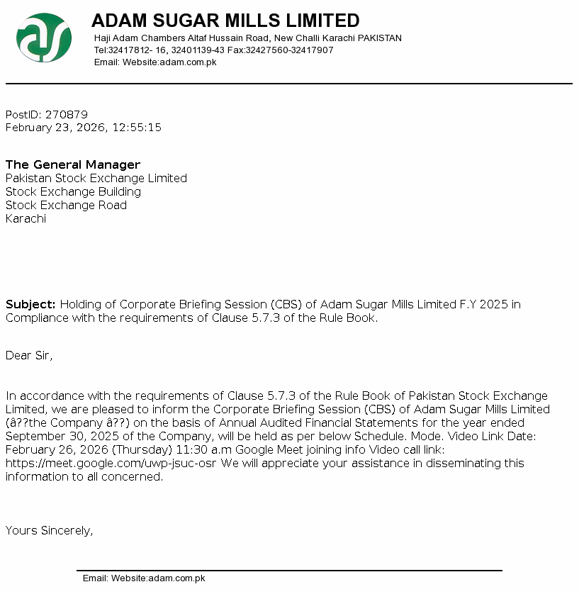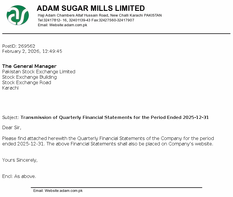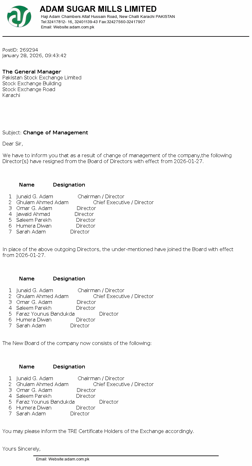 Adam Sugar Mills Limited was incorporated in Pakistan in 1965 in the name of Bahawalnagar Sugar Mills Limited as a public limited company under provisions of the companies Act, 1913 (repealed with the enactment of the Companies Ordinance, 1984 and subsequently, the Companies Act, 2017. In 1985, the name of the Company was changed to Adam Sugar Mills Limited. The Company is principally engaged in the manufacturing and sale of white sugar.