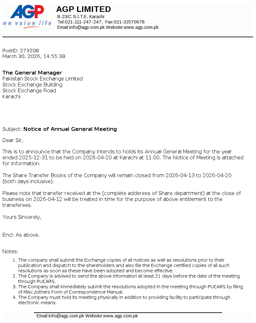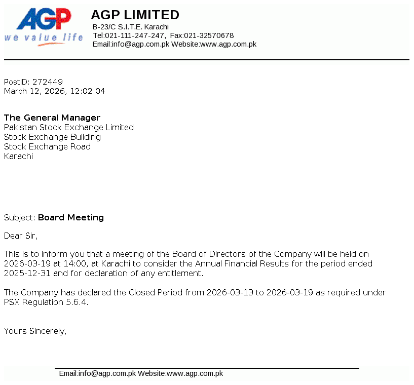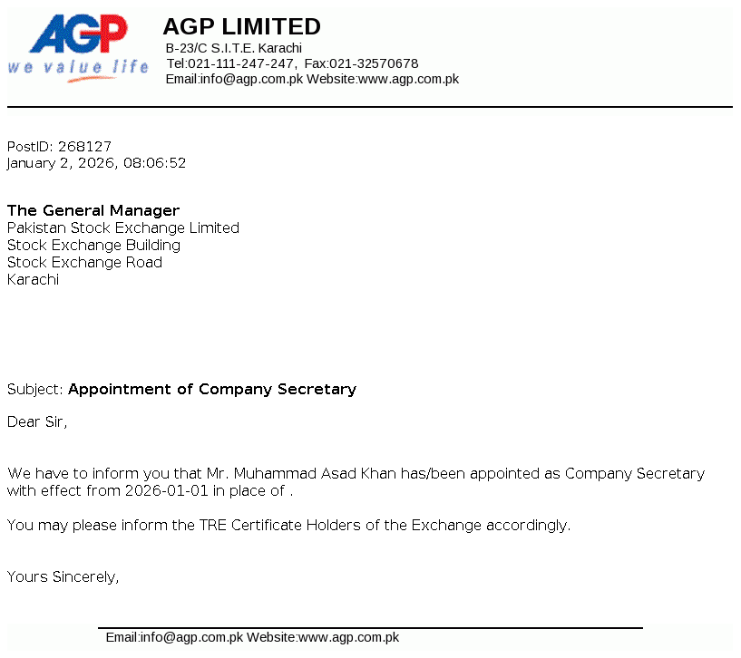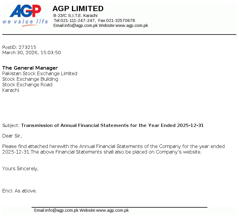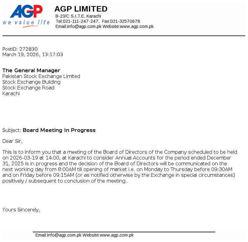 AGP Limited was incorporated as a public limited company in May 2014 under the repealed Companies Ordinance, 1984 (now Companies Act, 2017). The Company got listed on Pakistan Stock Exchange Limited on 05 March 2018. The principal activities of the Company include import, marketing, export, dealership, distribution, wholesale and manufacturing of all kinds of pharmaceutical products. Aitkenstuart Pakistan (Private) Limited (parent company) holds 55.80% of the share capital of the Company and West End 16 Pte Limited, Singapore is the ultimate parent company.
