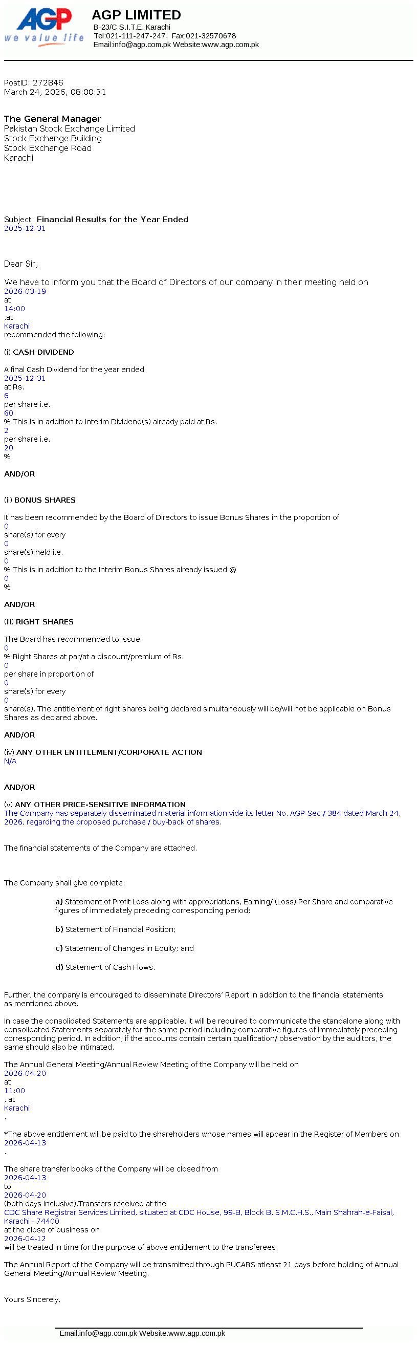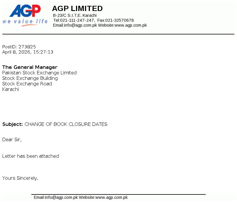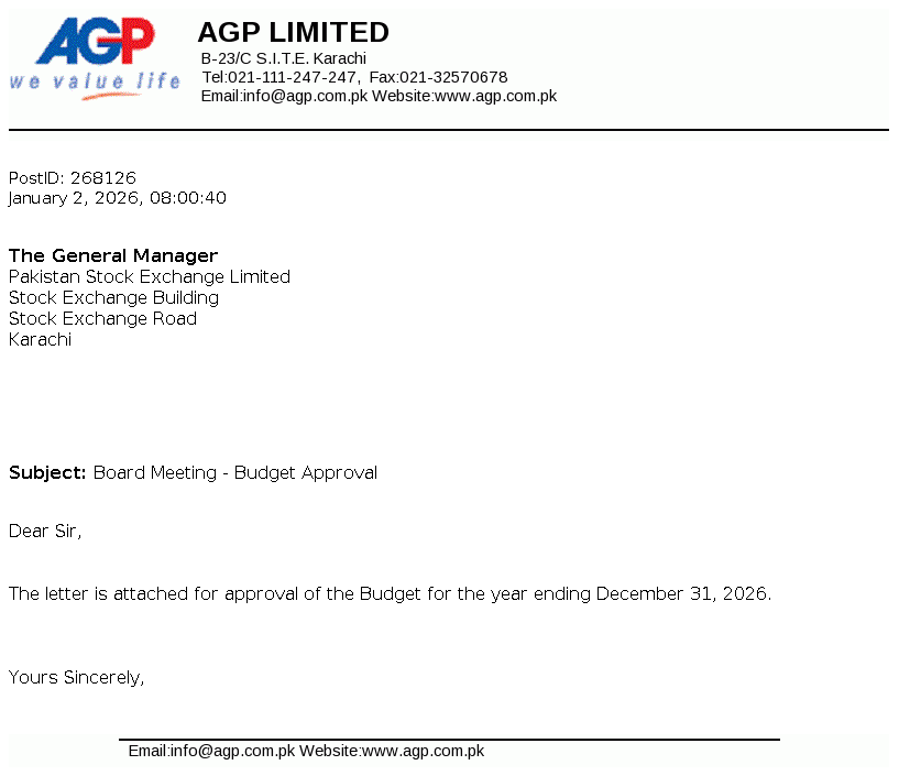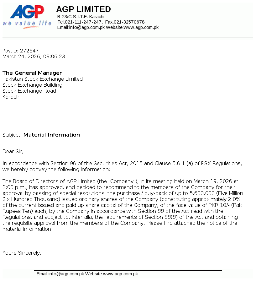 AGP Limited was incorporated as a public limited company in May 2014 under the repealed Companies Ordinance, 1984 (now Companies Act, 2017). The Company got listed on Pakistan Stock Exchange Limited on 05 March 2018. The principal activities of the Company include import, marketing, export, dealership, distribution, wholesale and manufacturing of all kinds of pharmaceutical products. Aitkenstuart Pakistan (Private) Limited (parent company) holds 55.80% of the share capital of the Company and West End 16 Pte Limited, Singapore is the ultimate parent company.