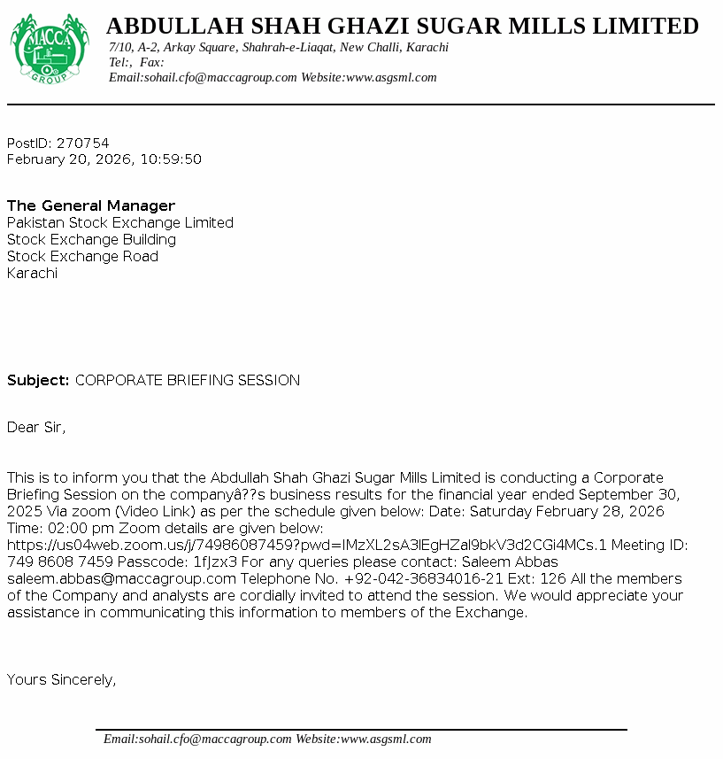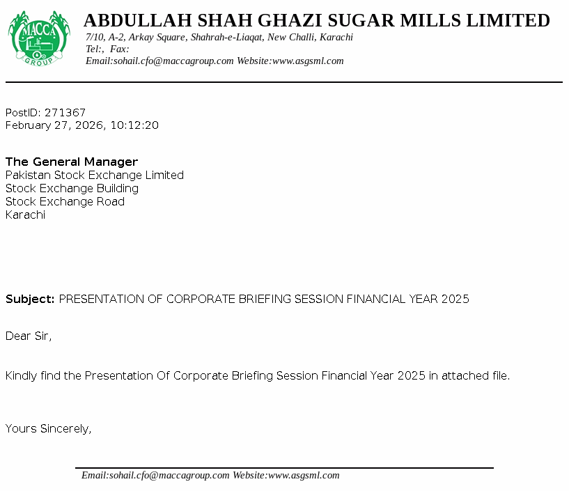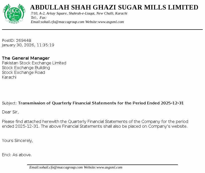 Abdullah Shah Ghazi Sugar Mills Limited was incorporated in Pakistan on February 25, 1984 as a Private Limited Company and was subsequently converted into a Public Limited Company on February 11, 1990. The principal business of the company is manufacturing and selling of refined sugar and by products.