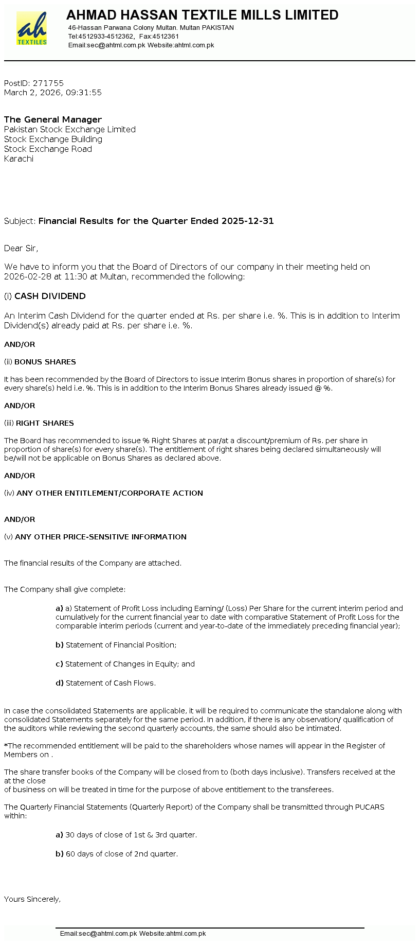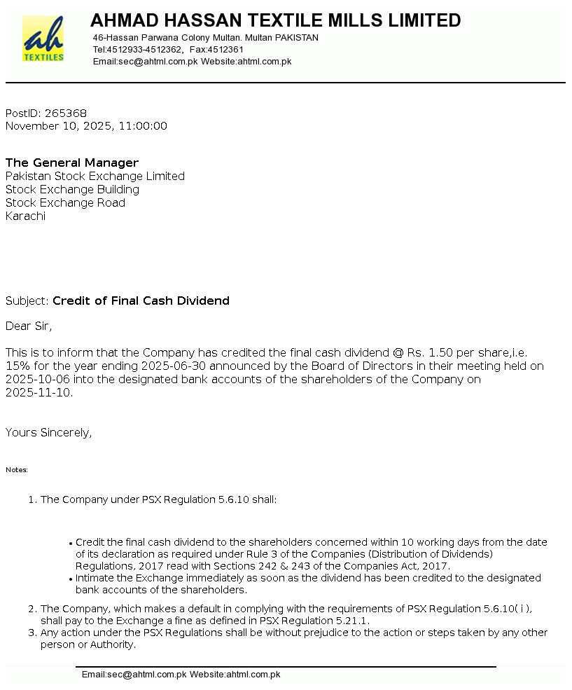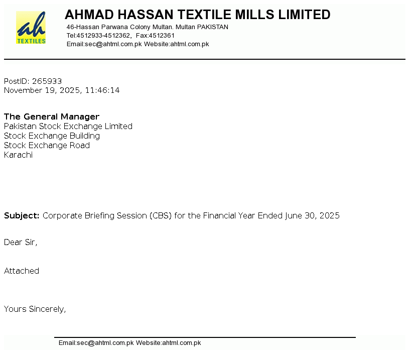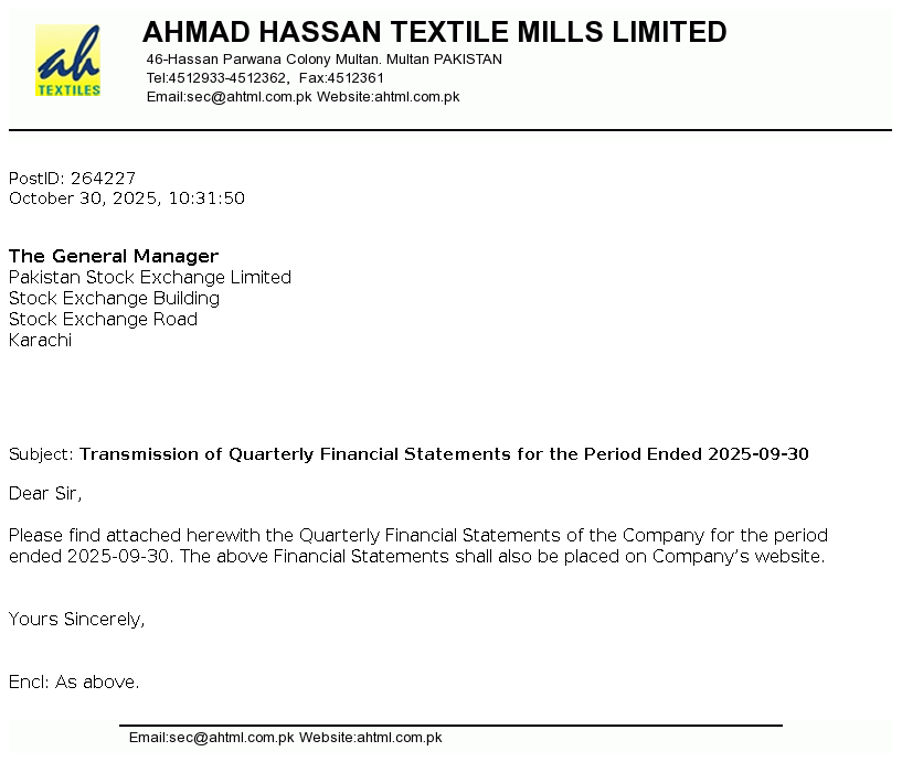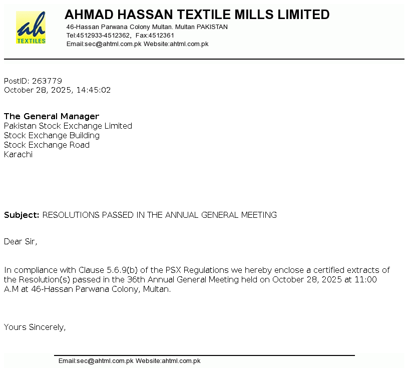 Ahmad Hassan Textile Mills Limited was incorporated in Pakistan on December 03, 1989 as a Public Limited Company under the Companies Ordinance, 1984. It is principally engaged in the manufacturing and sale of yarn and fabric. The Company also started cotton ginning business by taking ginning factory on lease from its associated undertaking.