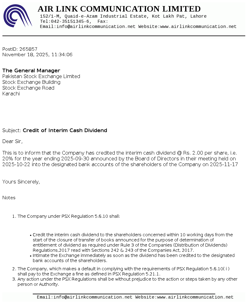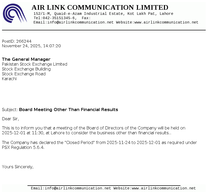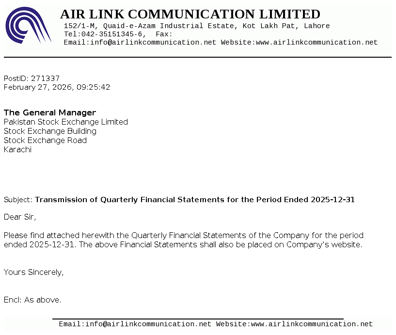 Air Link Communication (Pvt.) Limited was incorporated in January 02, 2014 as a private limited company under the repealed Companies Ordinance, 1984 (now Companies Act, 2017) and was converted into a public limited company w.e.f. April 24, 2019. The Company imports, export distribution, identing, wholesale, retail of communication and IT related products and services including cellular mobile/smart phones, tablets, laptops accessories and allied products.
