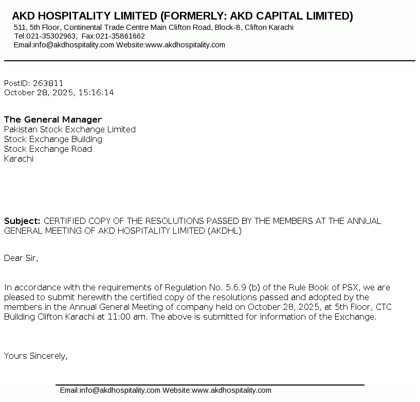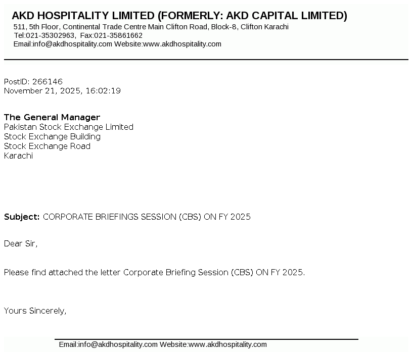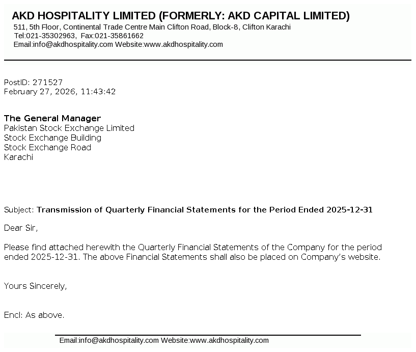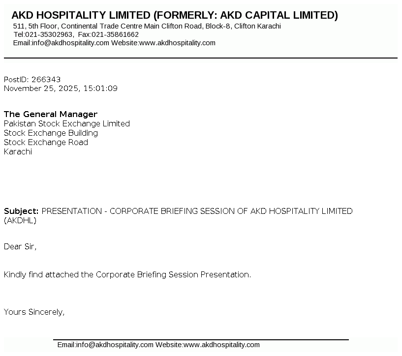 AKD Hospitality Limited, formerly AKD Capital Limited, was incorporated as a Public Limited Company in the year 1936 under Companies Act, 1913 (Now the Companies Act, 2017). . The Company is engaged in the business of real estate / providing consultancy, projects financing and management, investment in listed securities and to engage in leasing business including hospitality business, motel, destination management services, developing and building tourism attractions and to undertake all ancillary business activities to provide end to end service solutions"