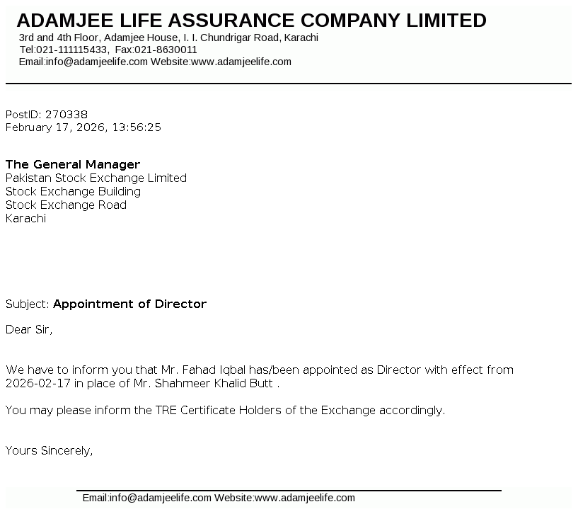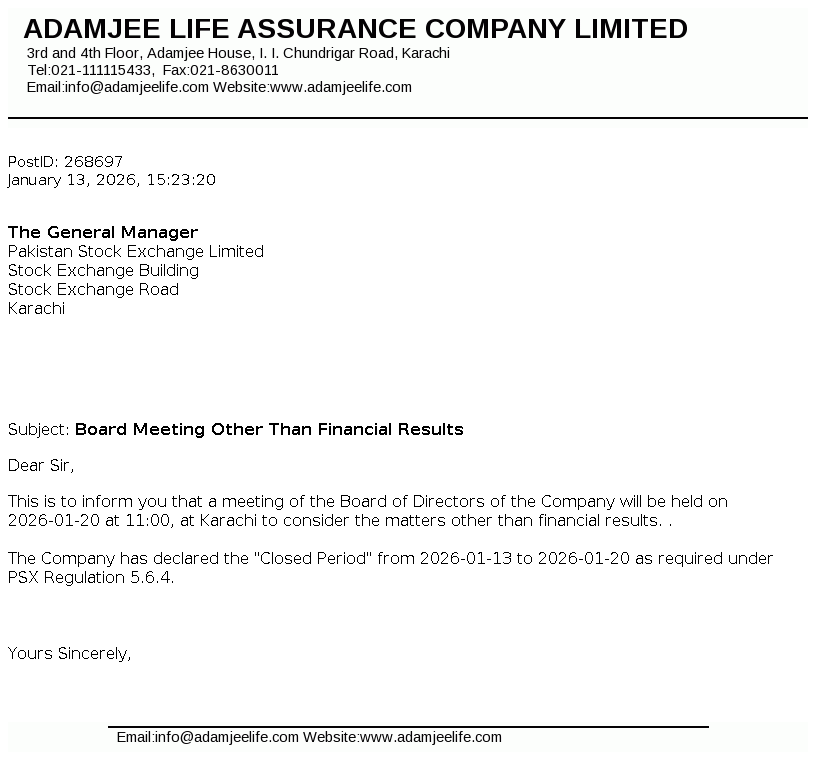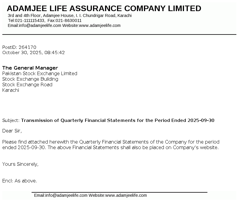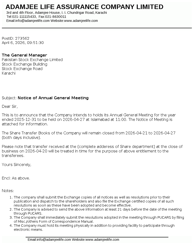 Adamjee Life Assurance Company Limited was incorporated in Pakistan on August 04, 2008 as a public unlisted company under the Companies Ordinance, 1984 (repealed Companies Act, 2017). The Company is engaged in life insurance business carrying on non-participating business only.
