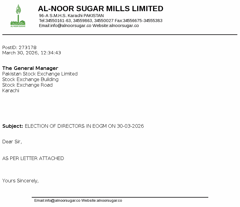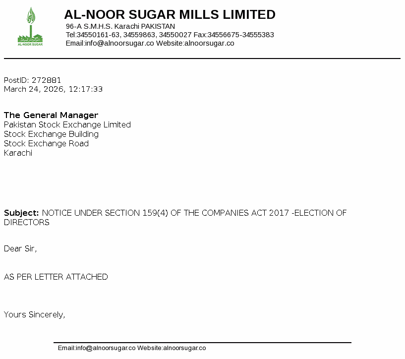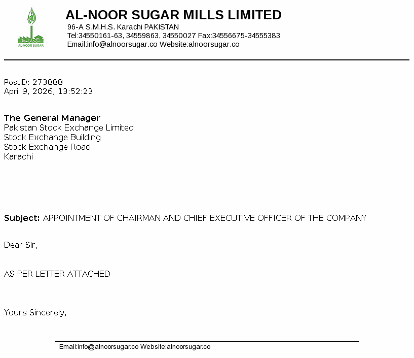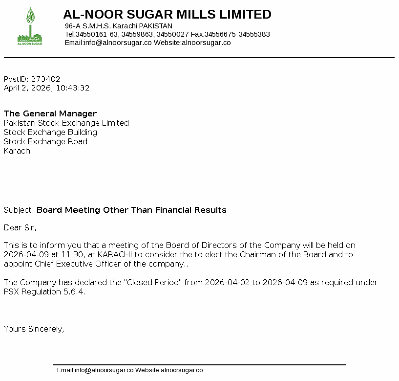 Al-Noor Sugar Mills Limited was incorporated in Pakistan as a public limited company on August 08, 1969. The Company owns and operates sugar, medium density fiber (MDF) board and generation of power units.