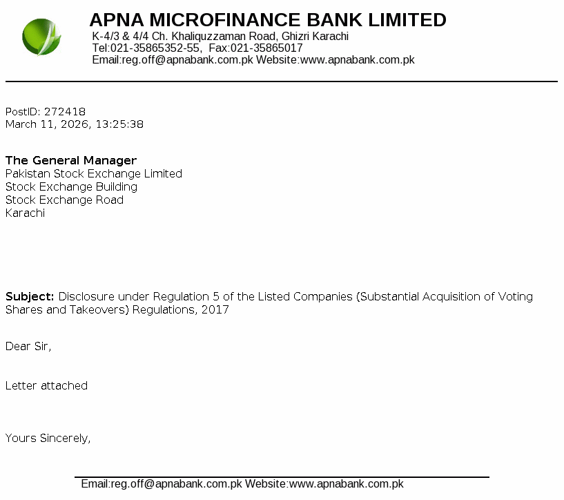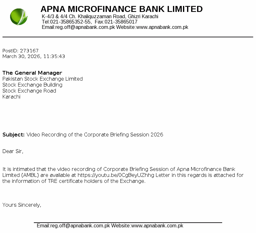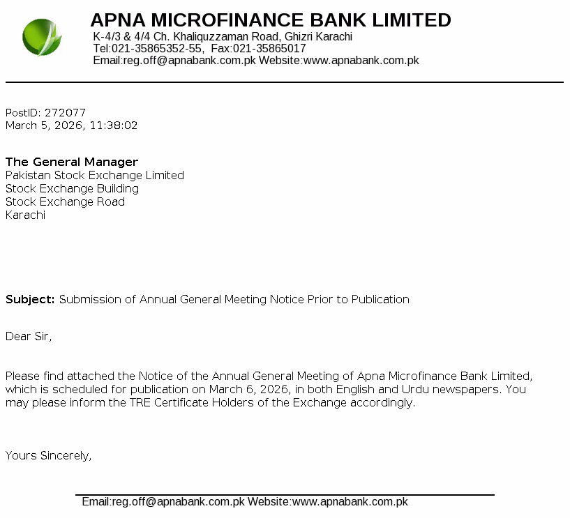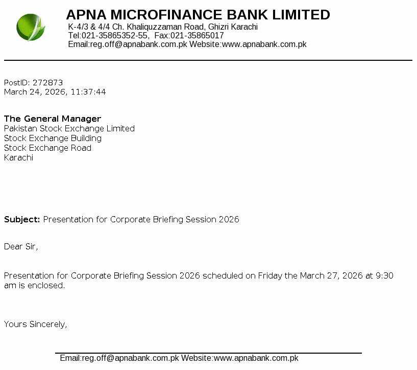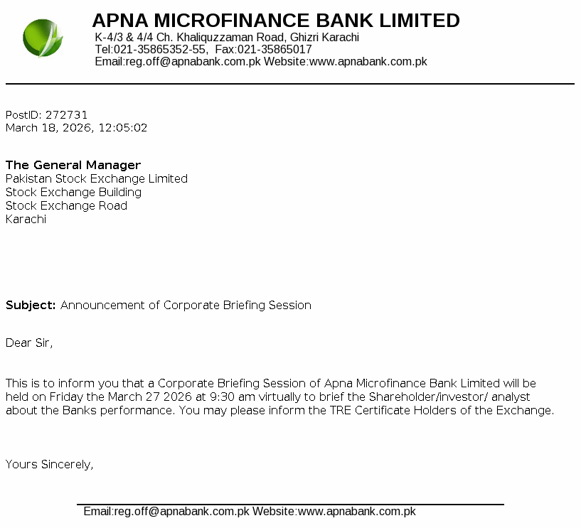 Apna Microfinance Bank Limited was incorporated on May 08, 2003 as a public limited Bank under the repealed Companies Ordinance, 1984 now the "Companies Act, 2017" (the Companies Act). The Bank was granted certificate of commencement of business on December 28, 2004 and started its operations on January 01, 2005. The Bank’s principal business is to provide microfinance services to the poor and underserved segment of the society as envisaged under the Microfinance Institutions Ordinance, 2001.