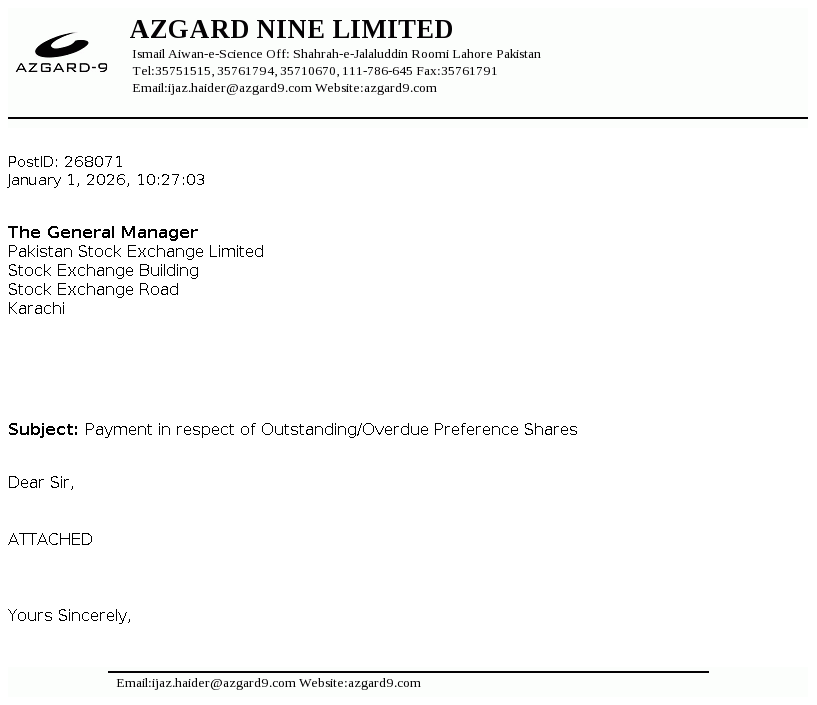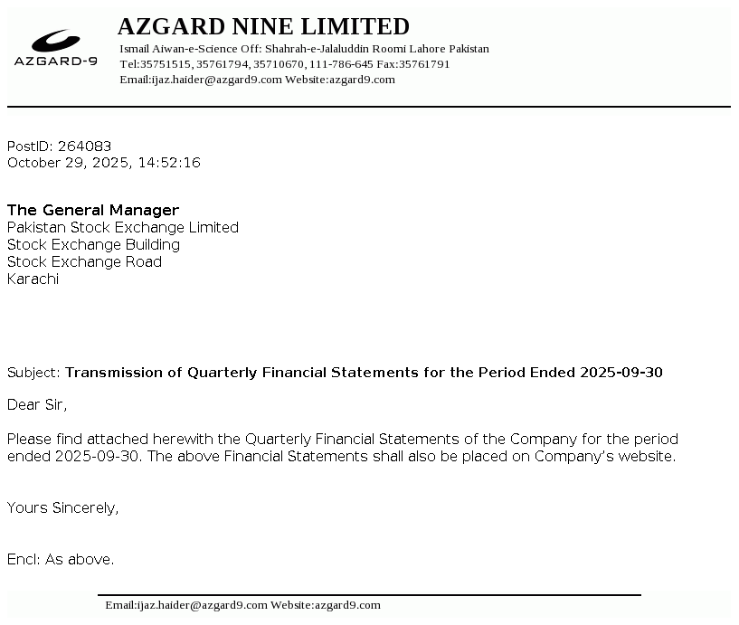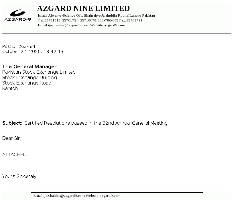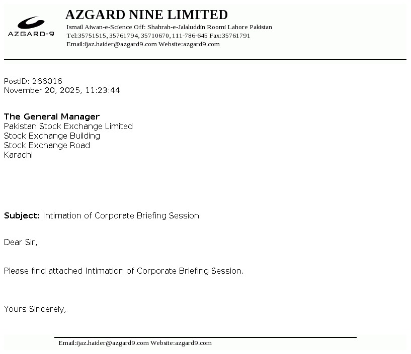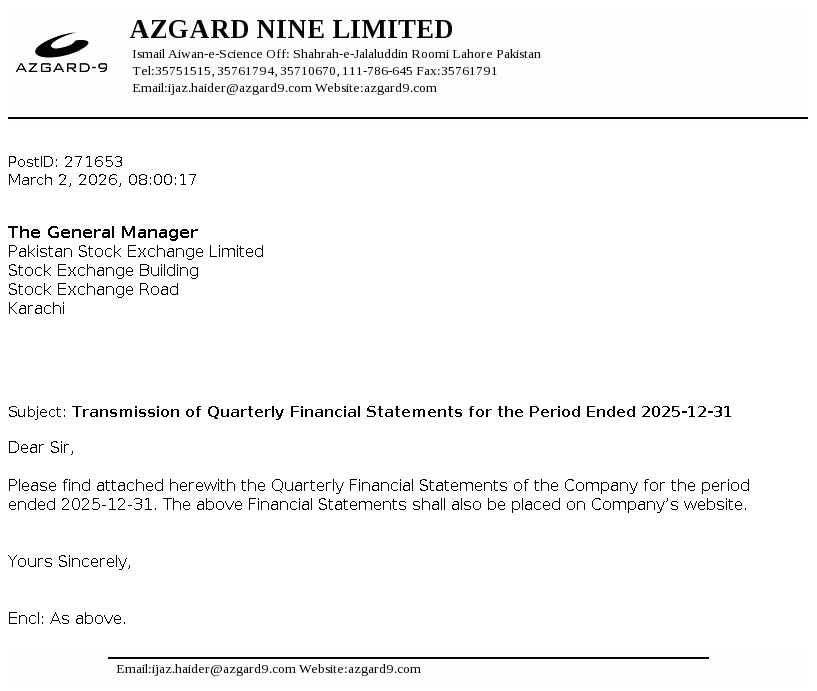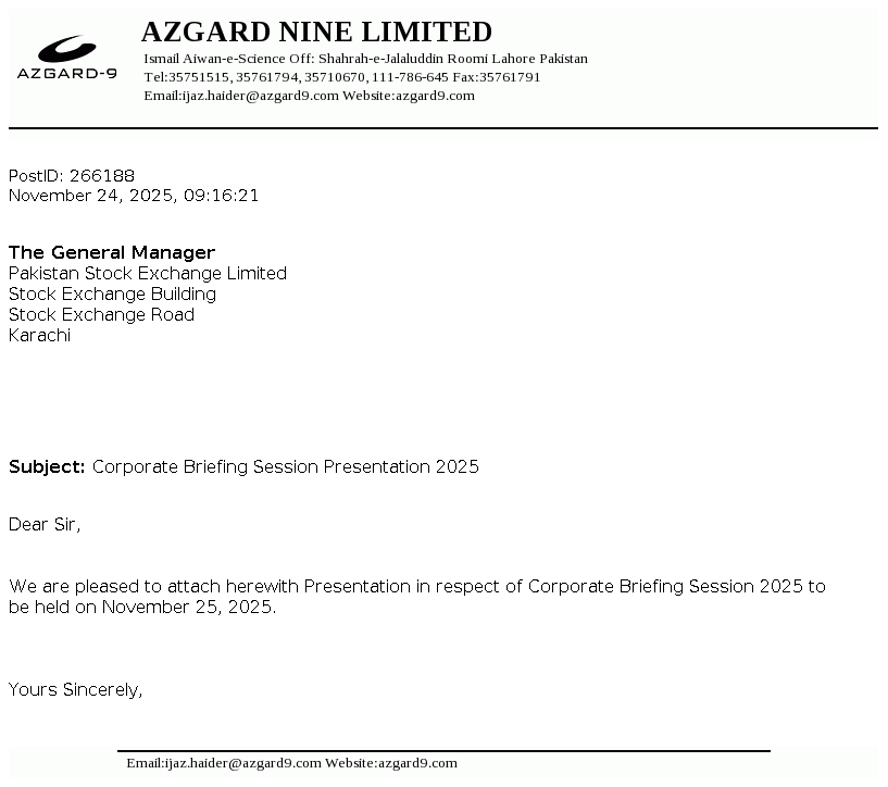 Azgard Nine Limited is incorporated in Pakistan as a public limited company. The Company is a composite spinning, weaving, dyeing and stitching unit engaged in the manufacturing of yarn, denim and denim products.