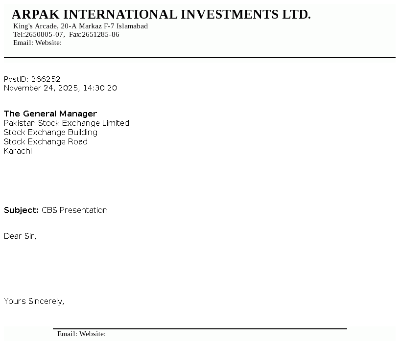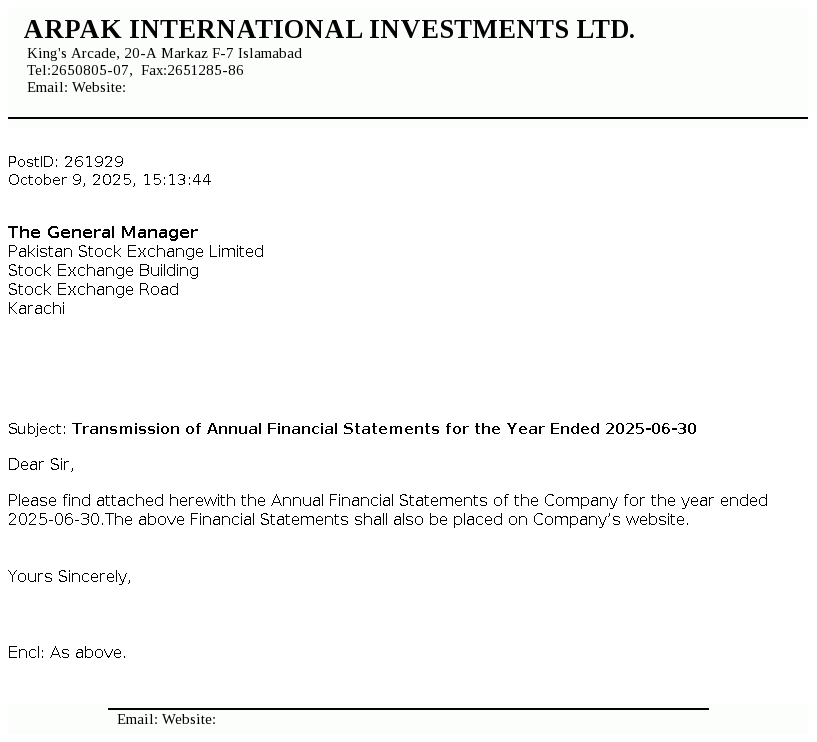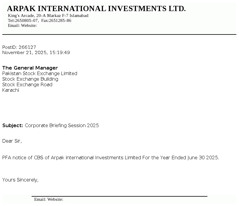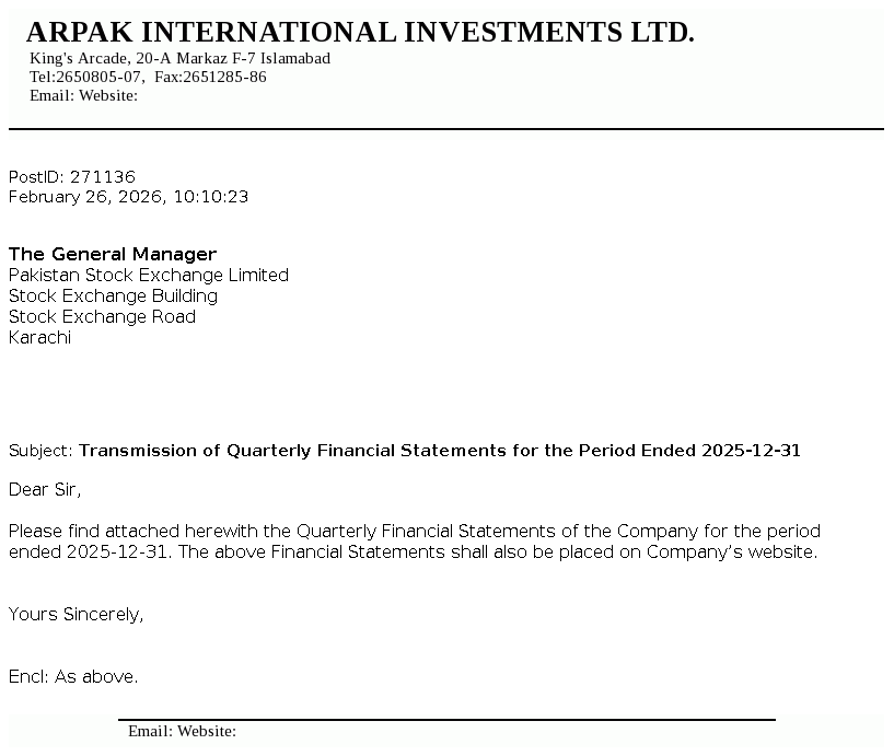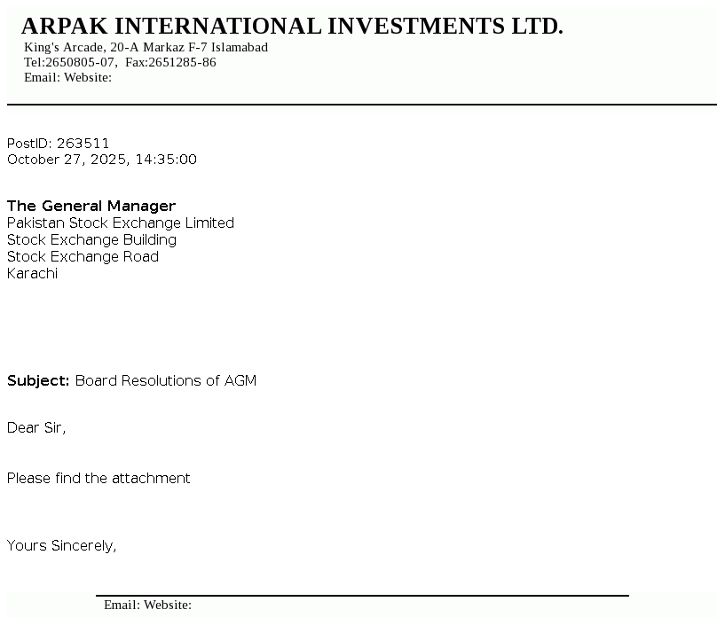 Arpak International Investments Limited (the Company) was incorporated in Pakistan on 26 July, 1977 as a Public Listed Company. The company is principally engaged in investment business of various forms.