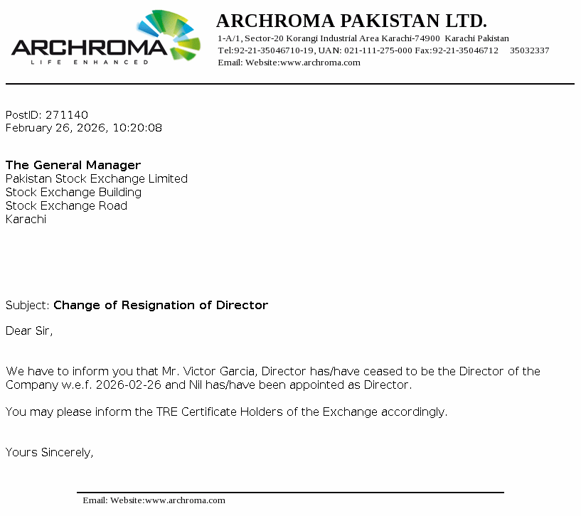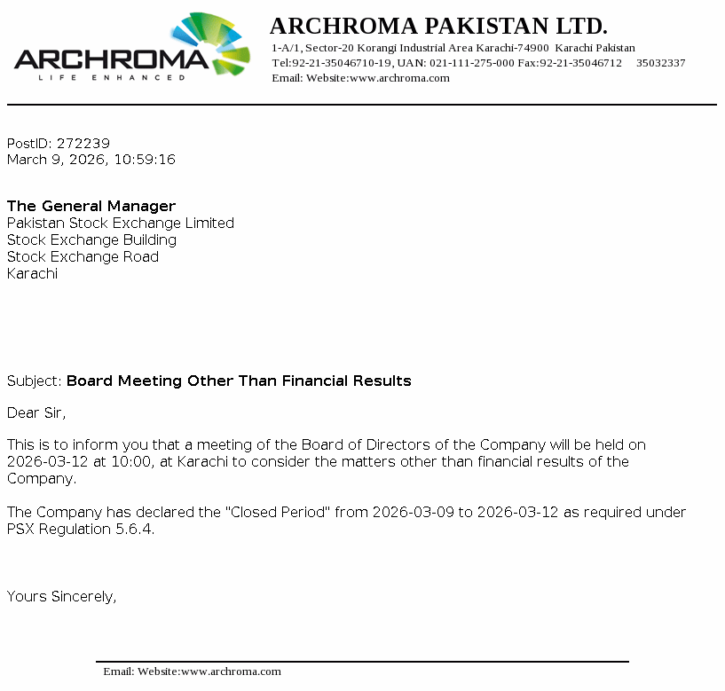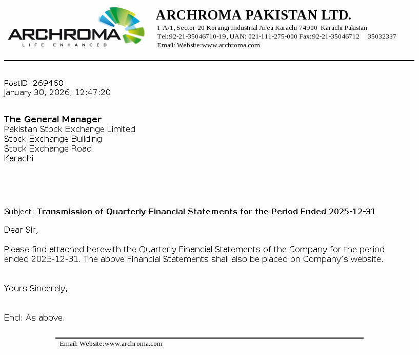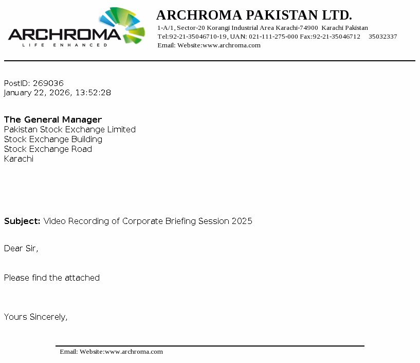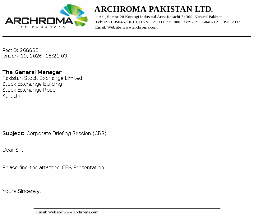 Archroma Pakistan Limited is a limited liability company and is primarily engaged in the manufacture, import and sale of chemicals, dyestuffs and coating, adhesive and sealants. It also acts as an indenting agent. The company is a subsidiary of Archorma Textiles Gmbh, registered and having headquarter in Reinach, Switzerland.