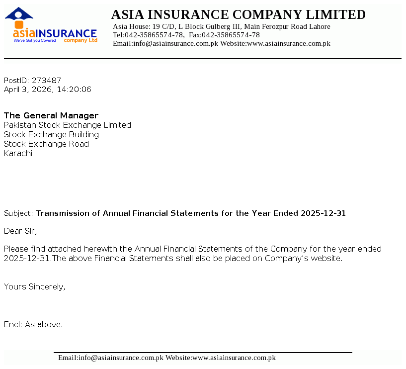 Asia Insurance Company Limited is a quoted public limited company which was incorporated in Pakistan on December 06, 1979 under the repealed Companies Act, 1913 (now the Companies Act, 2017). The Company is engaged in non-life insurance business mainly comprising of fire, marine, motor, bond and suretyship, agriculture and allied and miscellaneous.