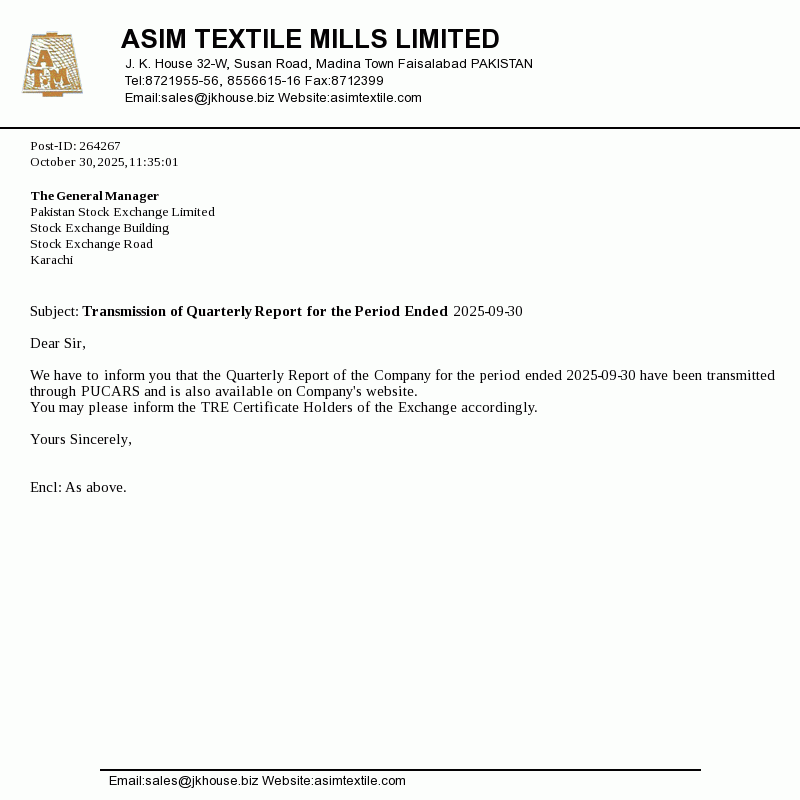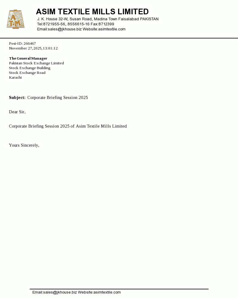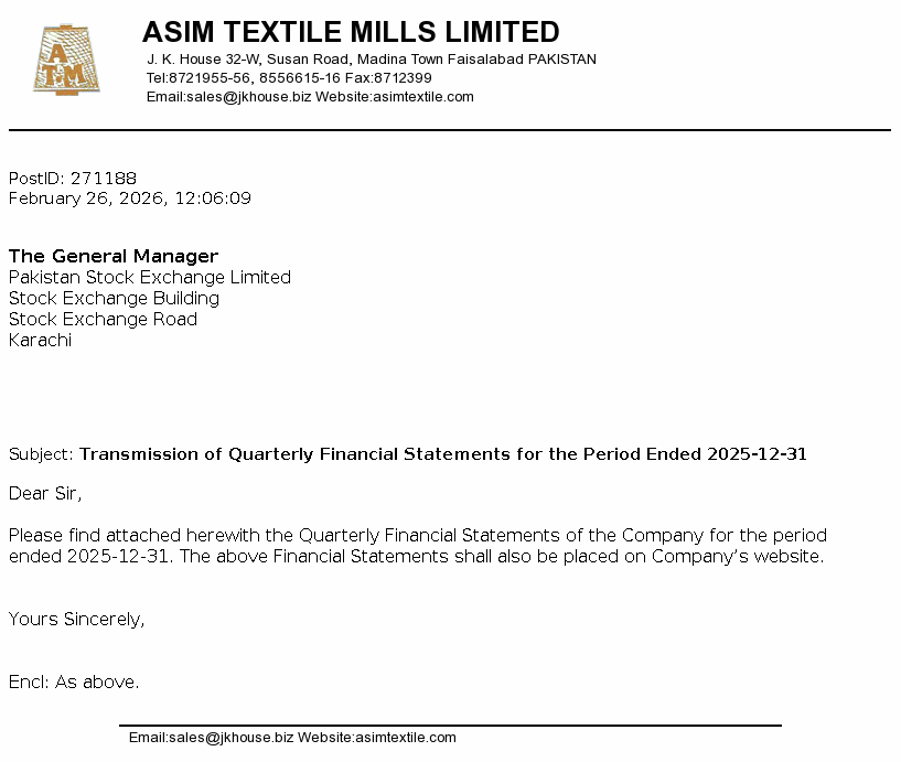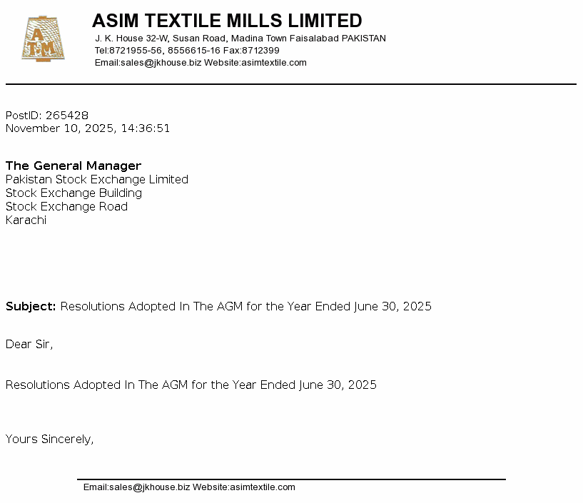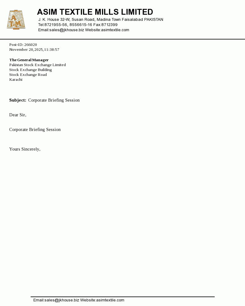 Asim Textile Limited was incorporated in Pakistan under the Companies Ordinance, 1984. The company is engaged in manufacture and sale of yarn.