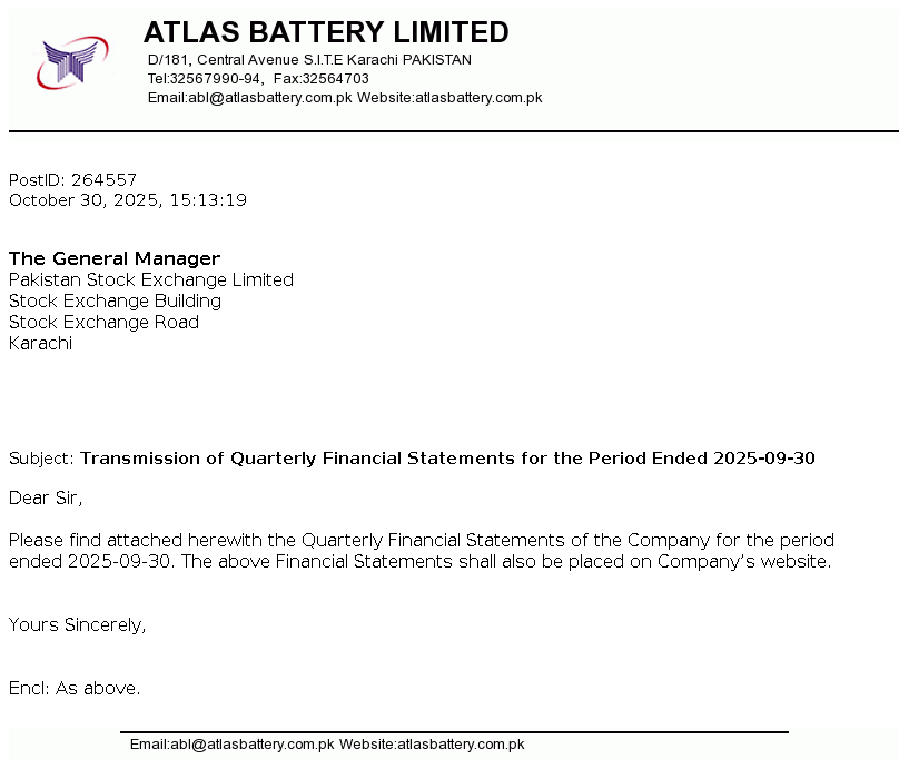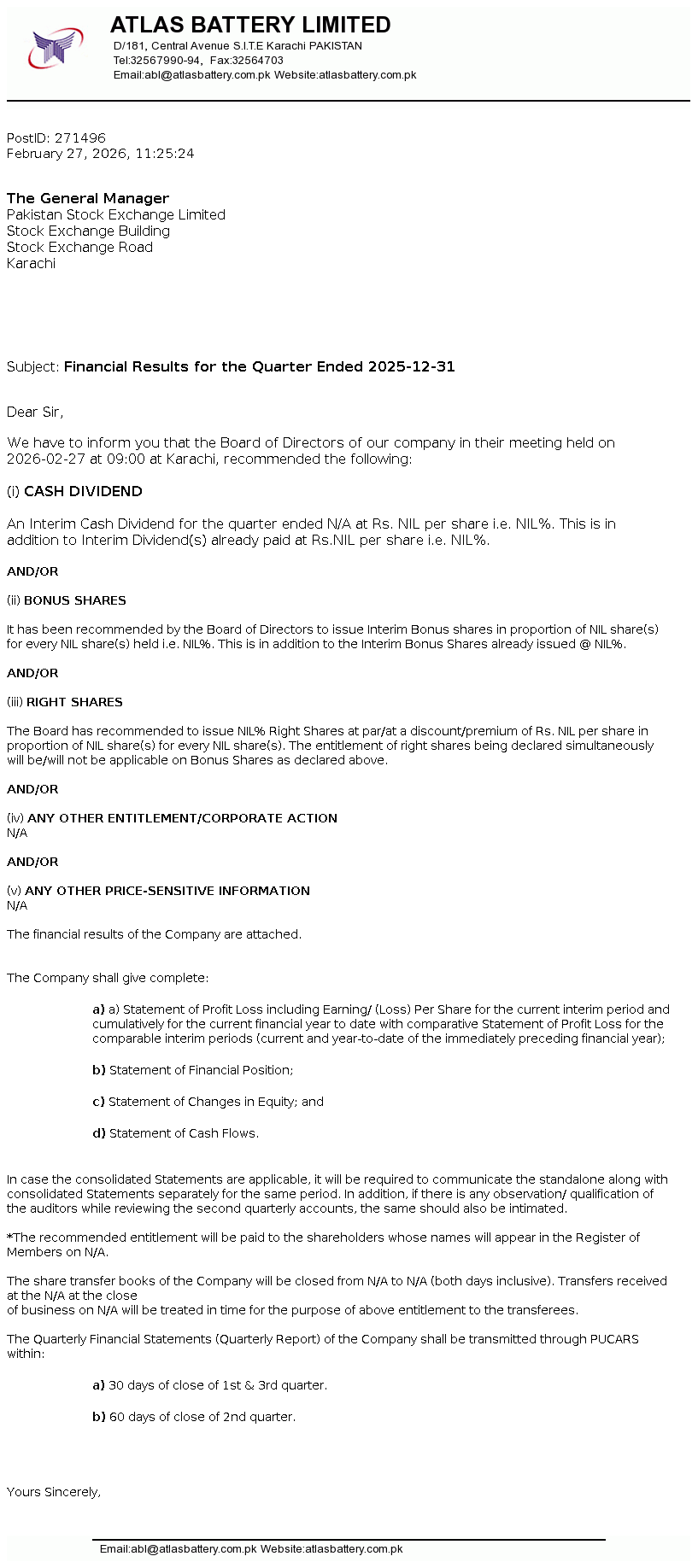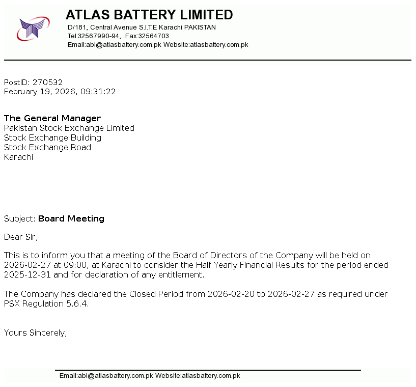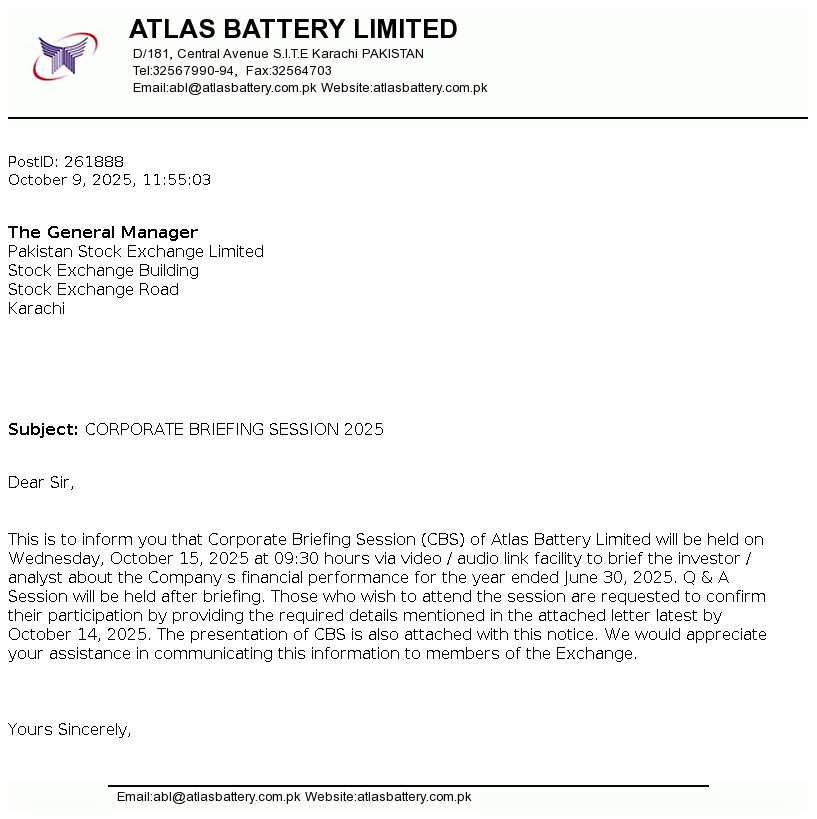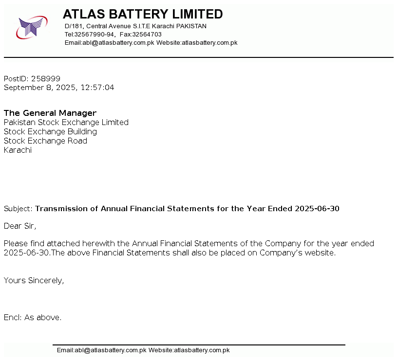 Atlas Battery Limited was incorporated as a public limited company on October 19, 1966. The Company is engaged in manufacturing and sale of automotive and motorcycle batteries & allied products. The Company is a subsidiary of Shirazi Investments (Private) Limited, which holds 58.86% of issued, subscribed and paid-up capital of the Company as at June 30, 2020.