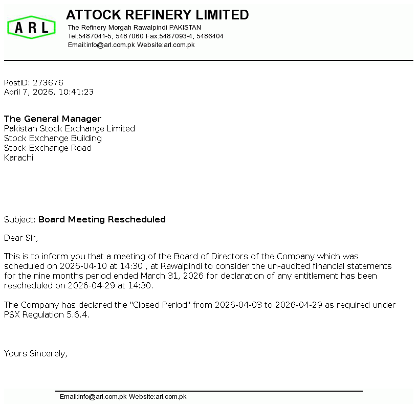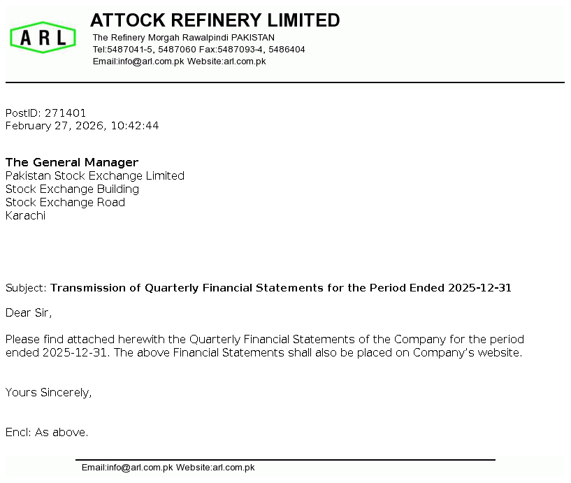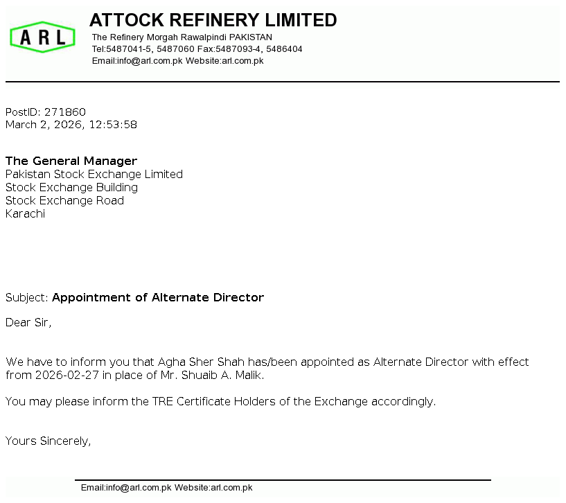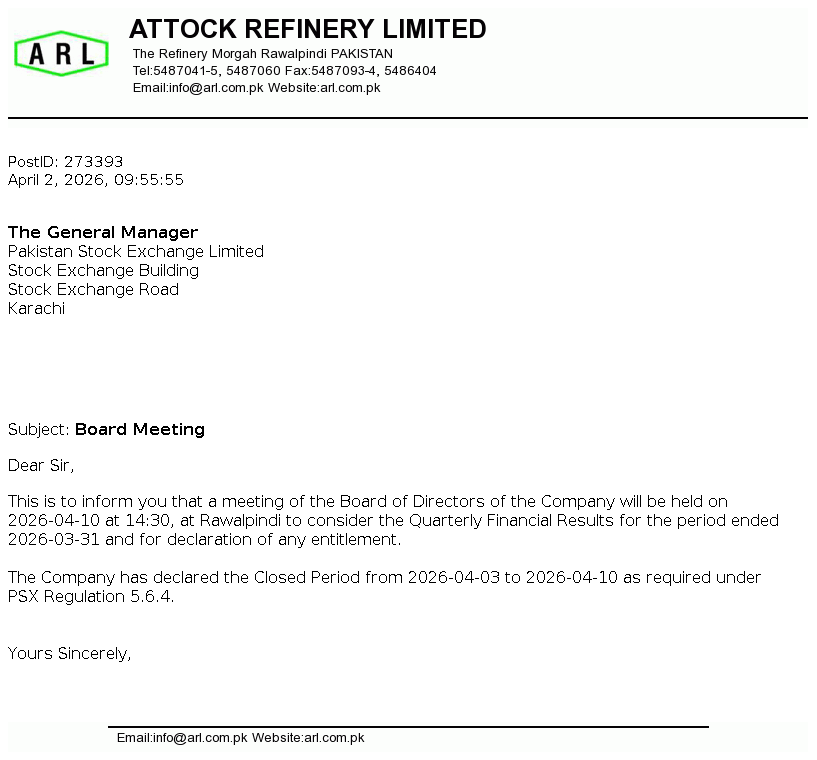 Attock Refinery Limited was incorporated in Pakistan on November 8, 1978 as a private limited company and was converted into a public company on June 26, 1979. It is principally engaged in the refining of crude oil. The Company is subsidiary of The Attock Oil Company Limited, England and its ultimate parent is Coral Holding Limited (a private limited company incorporated in Malta).