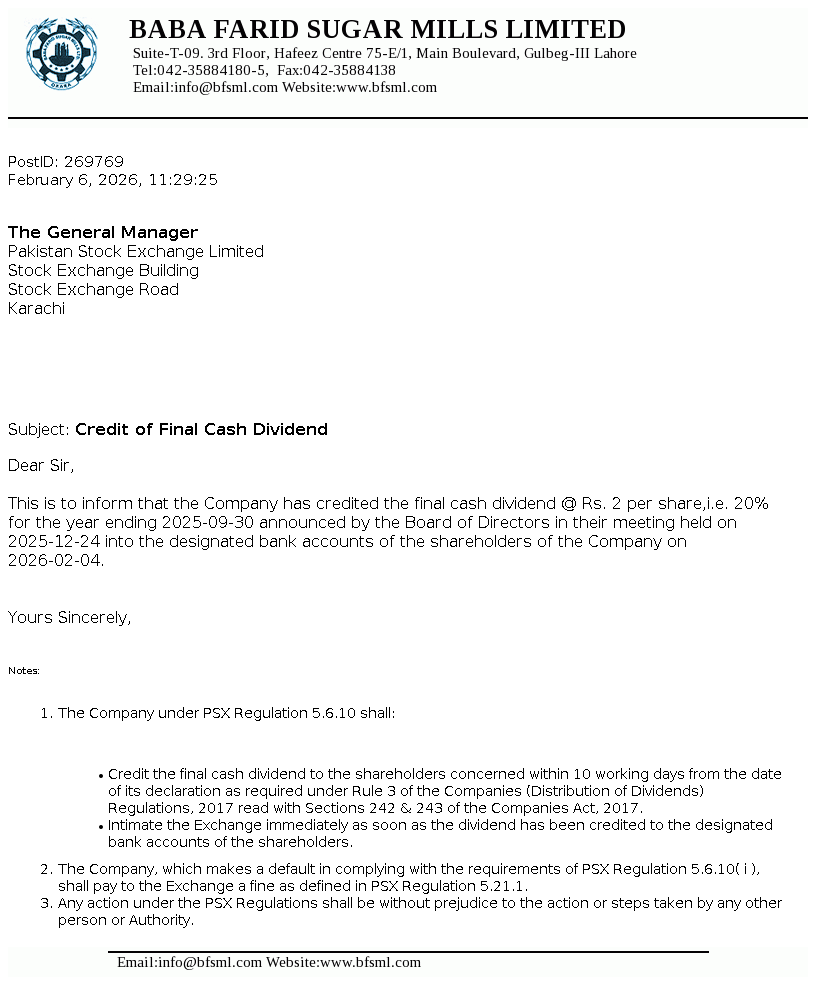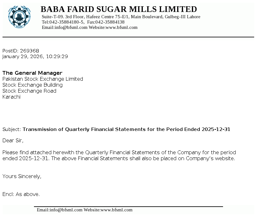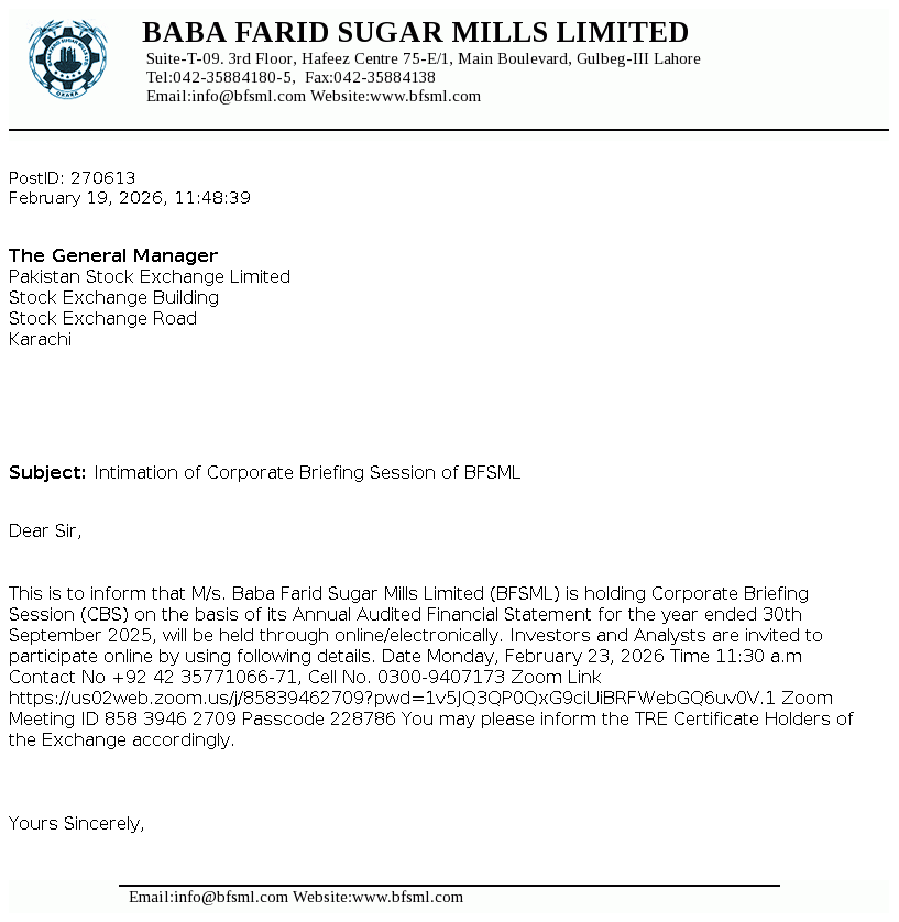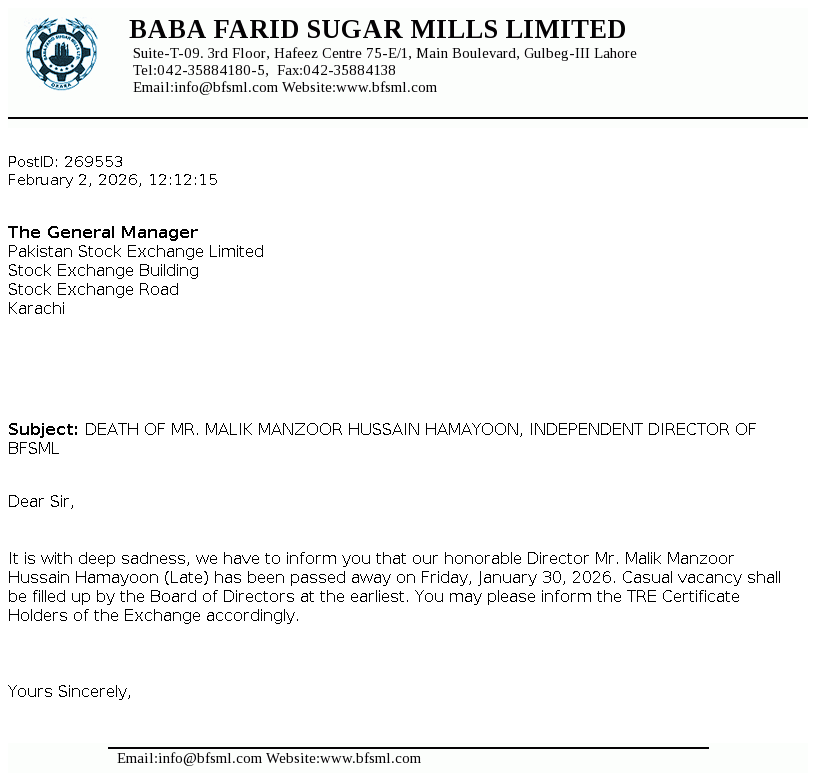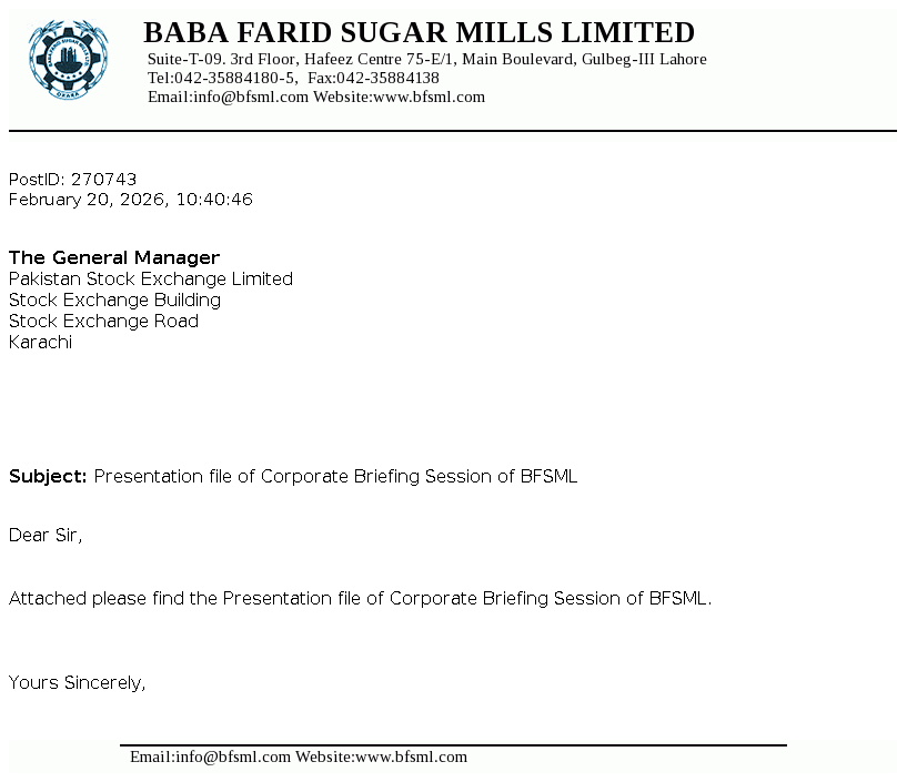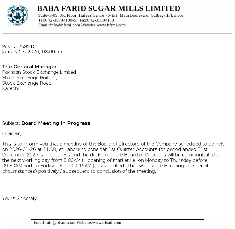 Baba Farid Sugar Mills Limited was incorporated in 1978 under the Companies Act 1913 (now Companies Act, 2017). It is principally engaged in the manufacturing and sale of sugar including its by-products i.e. molasses and V.Filter cake.