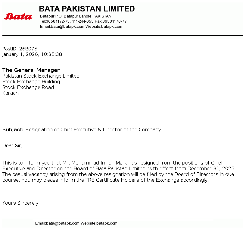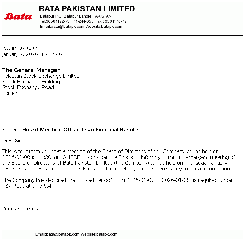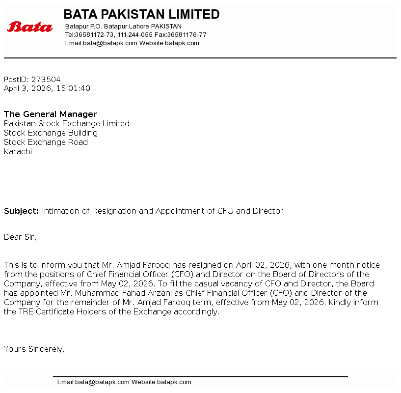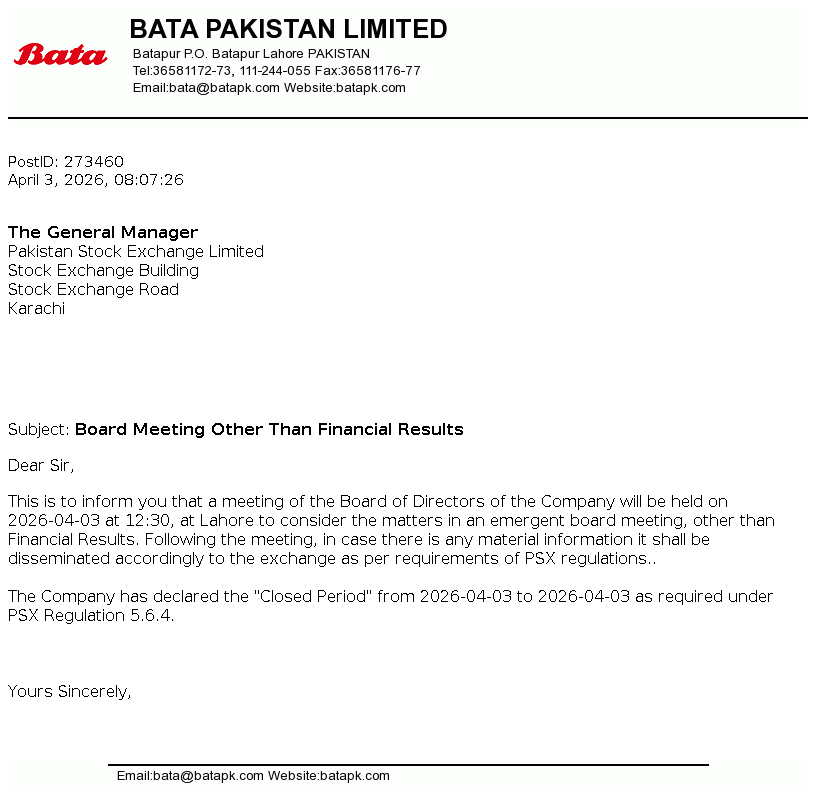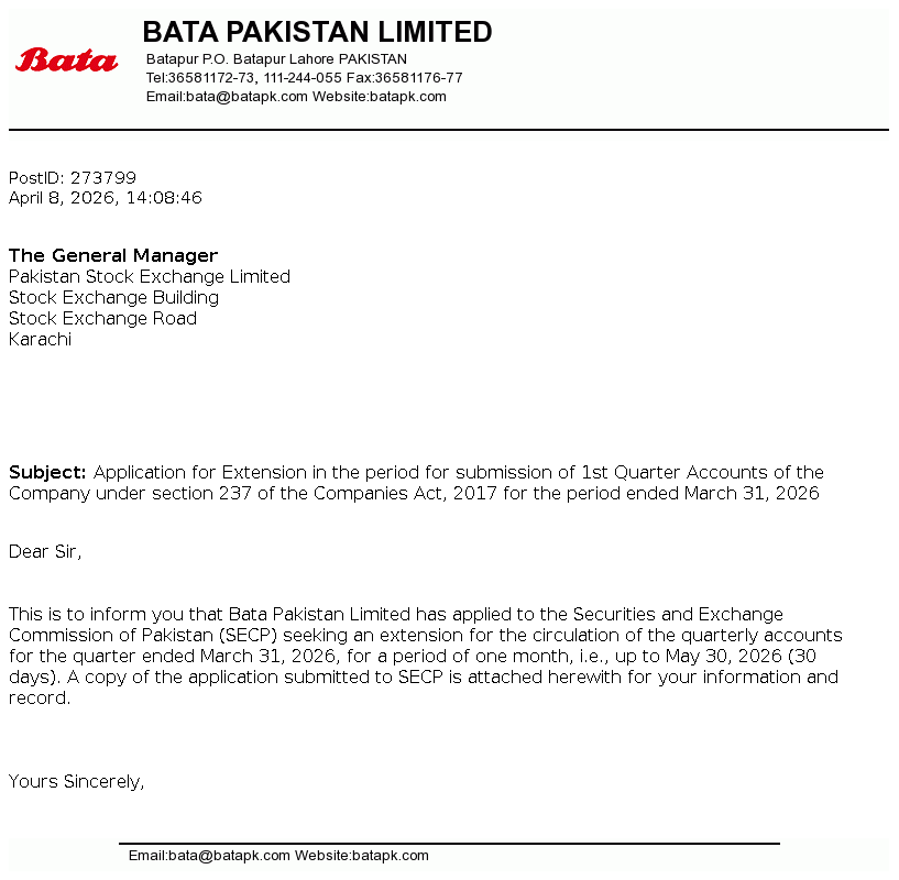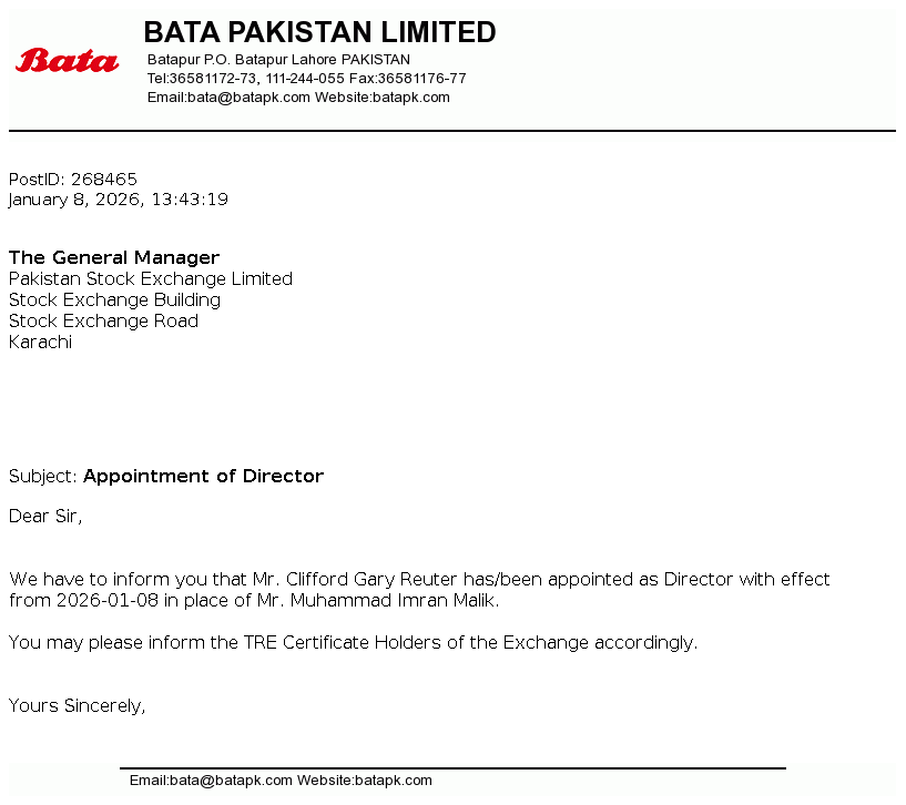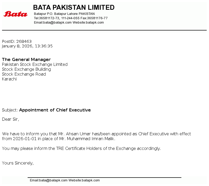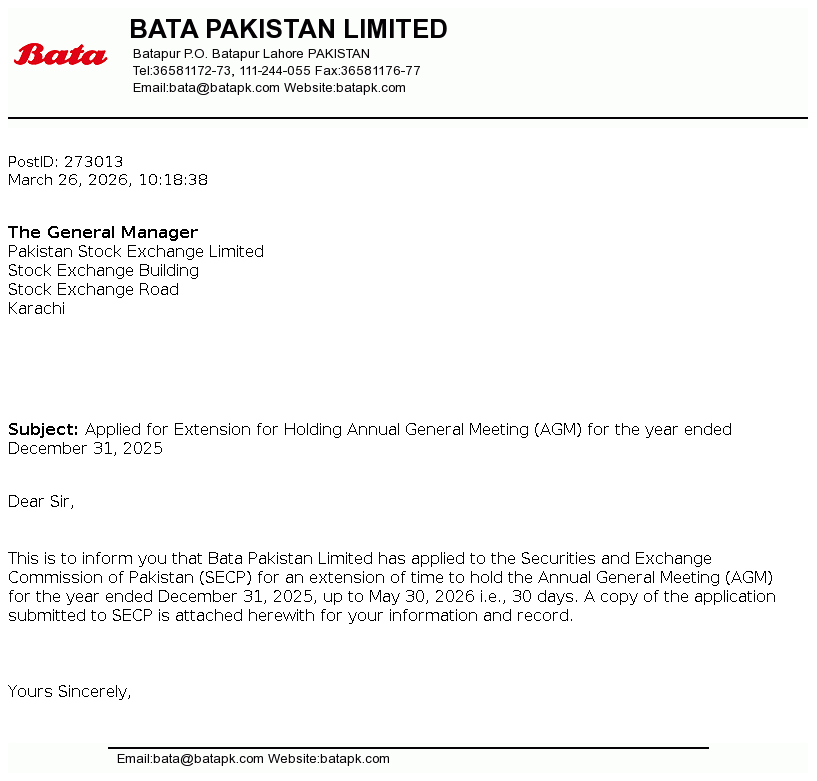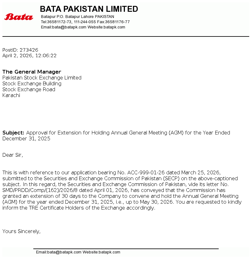 Bata Pakistan Limited was incorporated in Pakistan as a public limited company. The principal activity of the Company is manufacturing and sale of footwear of all kinds along with sale of accessories and hosiery items. The parent company of Bata Pakistan Limited is Bafin B.V. (Nederland), whereas the ultimate parent is Compass Limited, Bermuda.