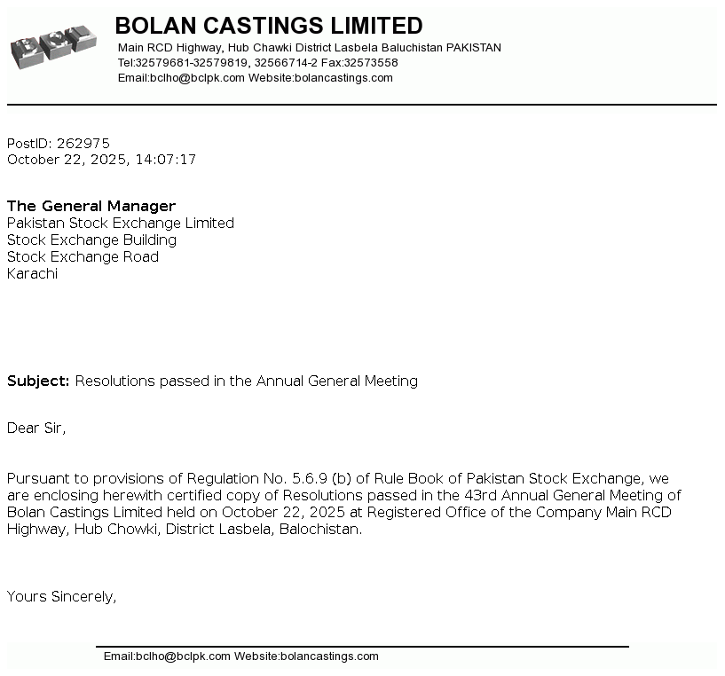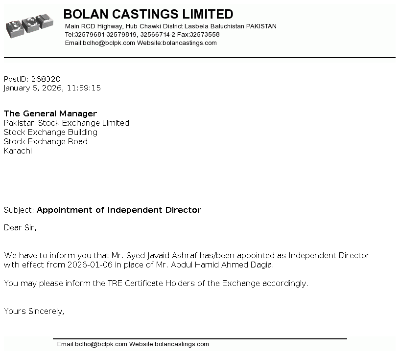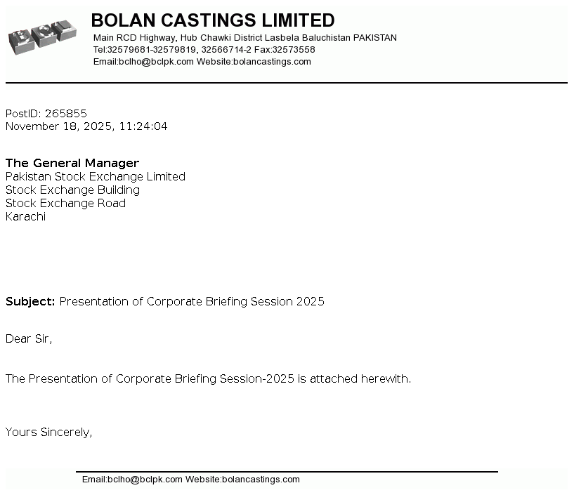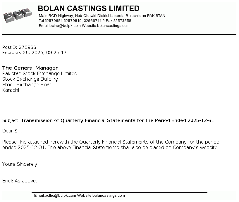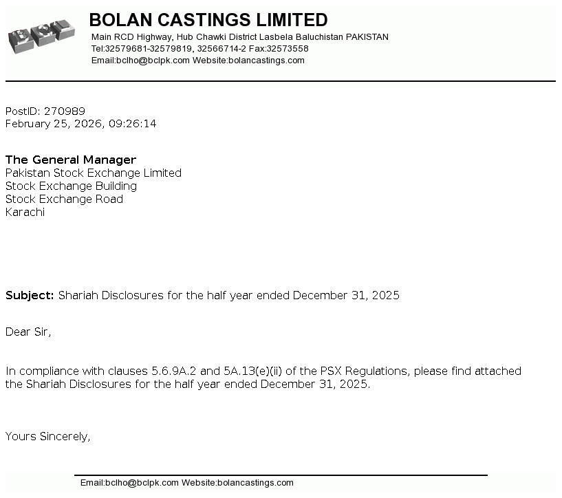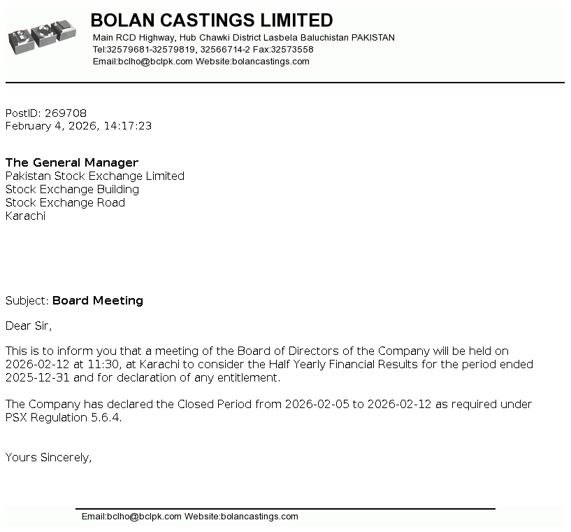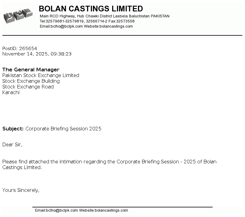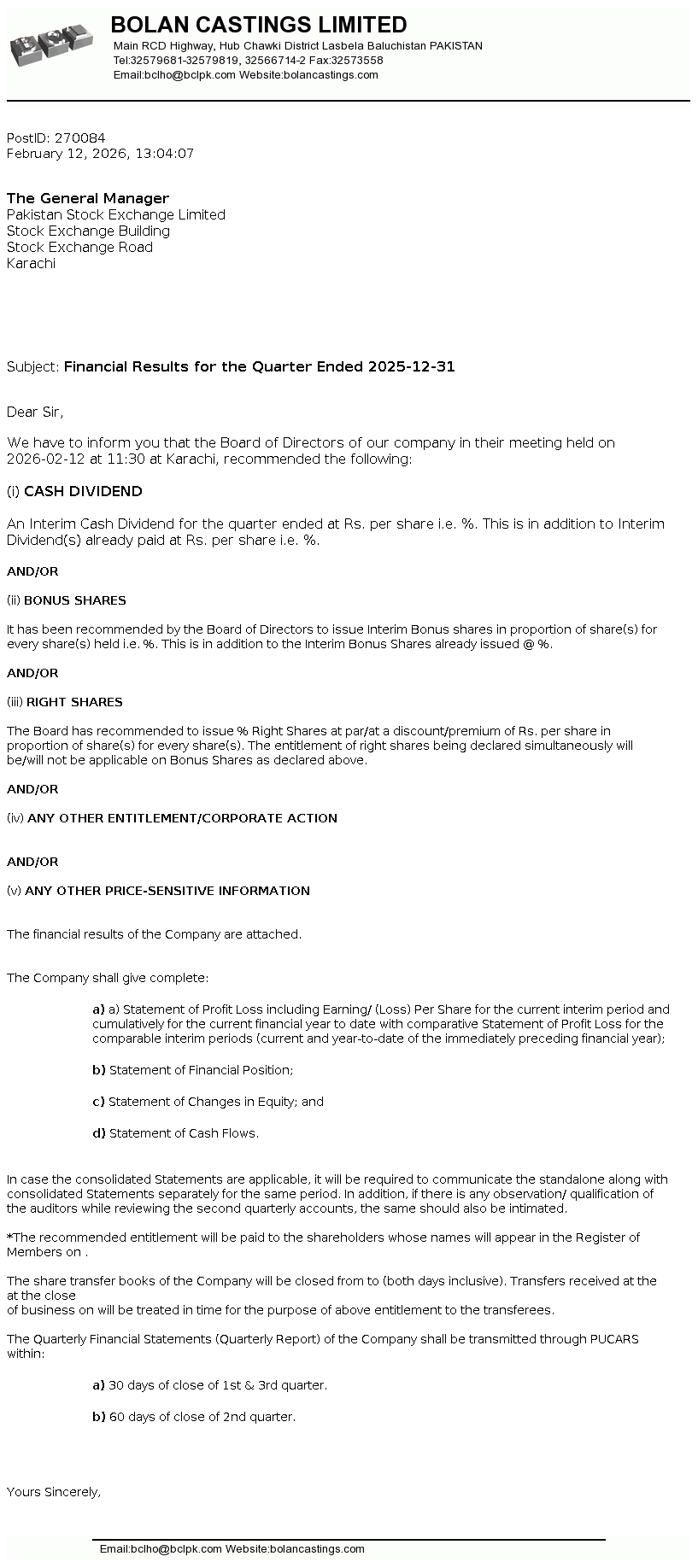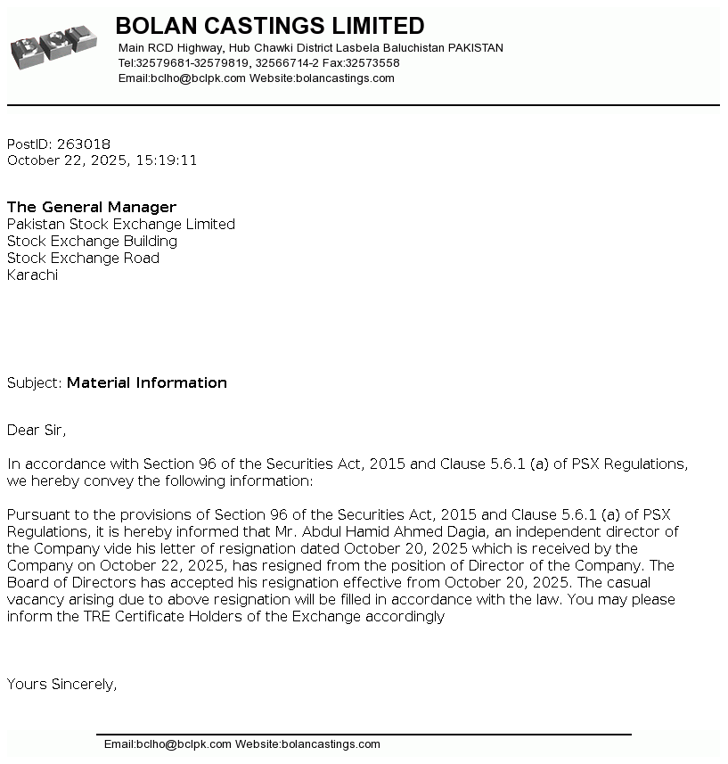 Bolan casting Limited is a public listed company incorporated in Pakistan on July 15, 1982 under the Companies Act, 1913 (now the Companies Act, 2017). The company manufactures and sells casting for tractors and automotive parts. The company is a subsidiary of Millat Tractors Limited.