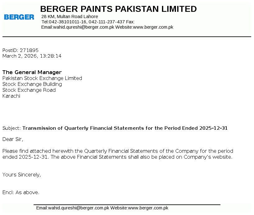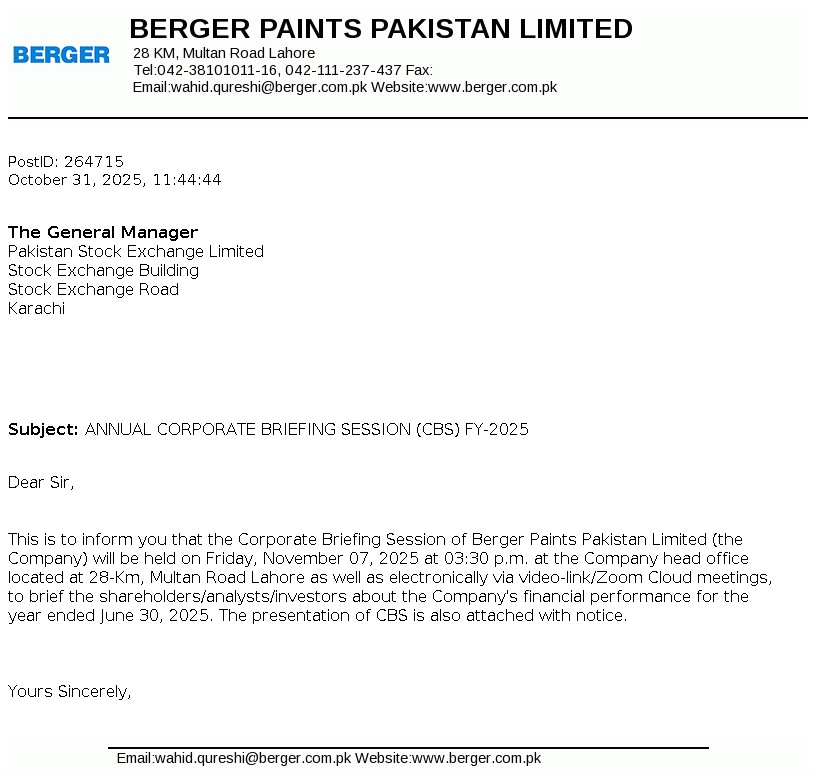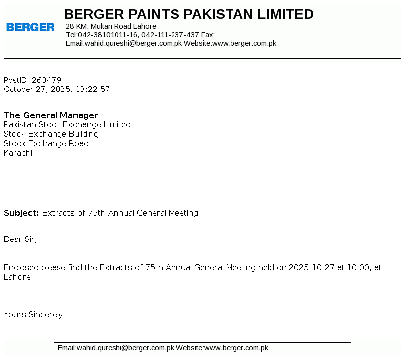 Berger Paints Pakistan Limited was incorporated in Pakistan on 25 March 1950 as a Private Limited Company under the Companies Act 1913 (now Companies Act, 2017) and was subsequently converted into a Public Limited Company. The principle business activity of the Company is manufacturing and trading of paints, varnishes and other related items. Slotrapid Limited, based in British Virgin Island is the Holding Company.