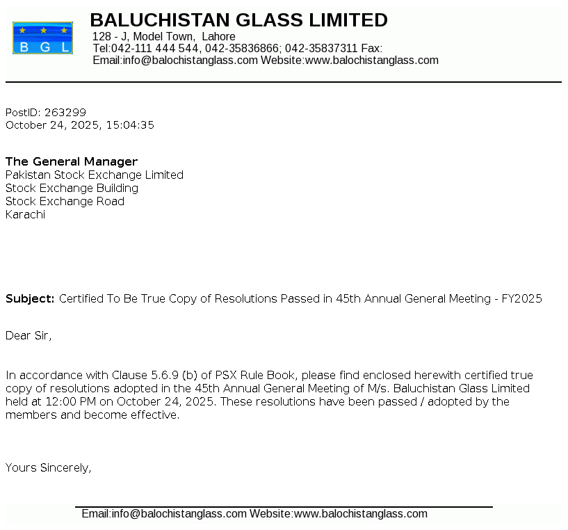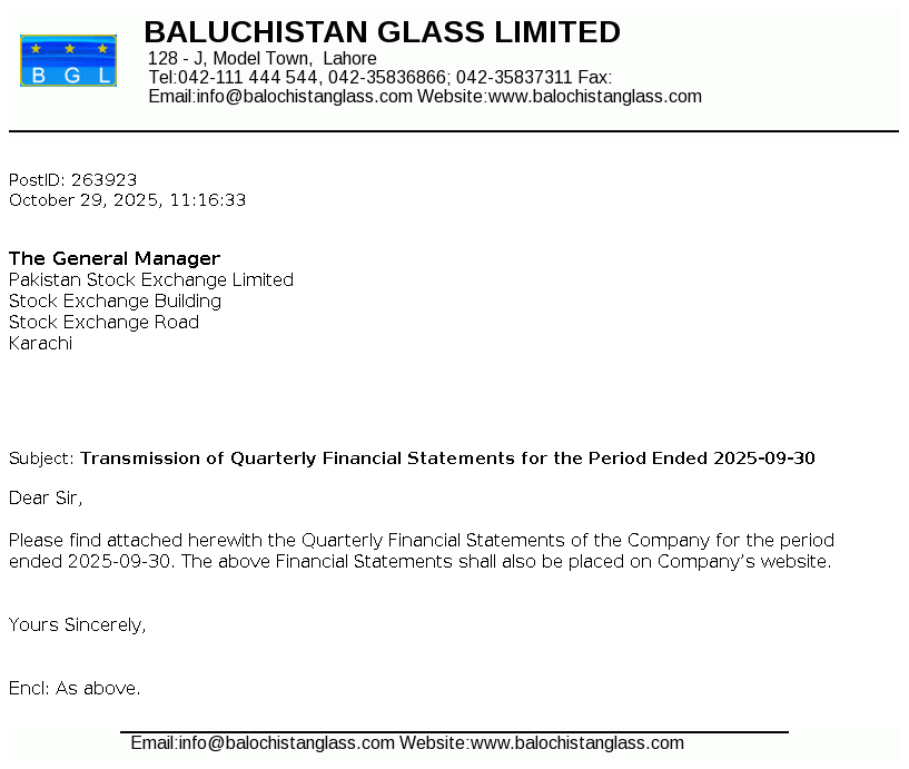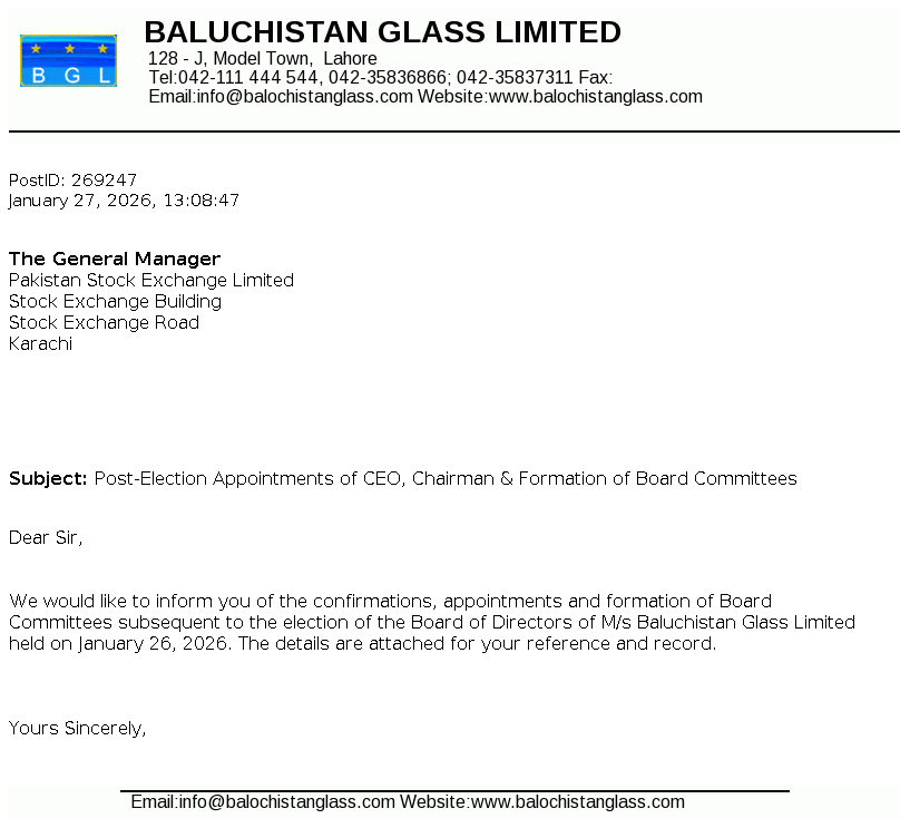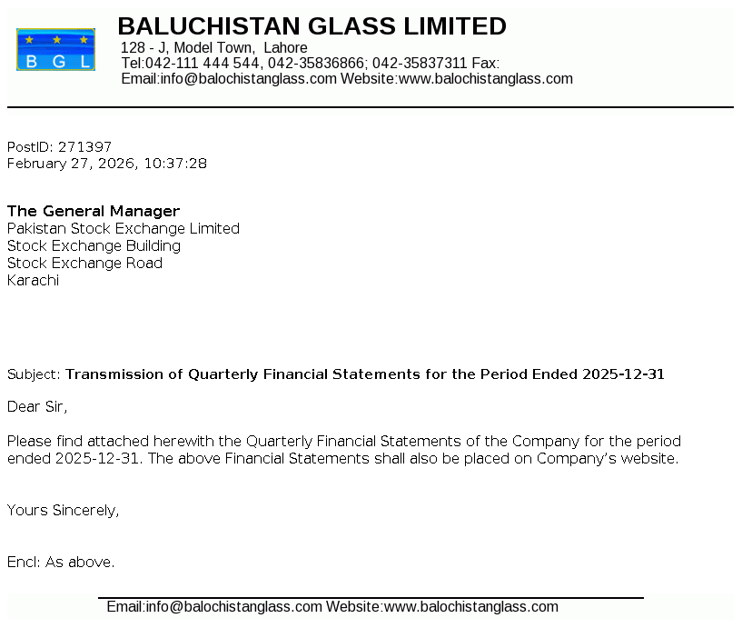 Balochistan Glass Limited was incorporated in Pakistan as a public limited company in 1980 under the repealed Companies Act, 1913 (now the Companies Act, 2017). The Company is engaged in manufacturing and sale of glass containers, glass table wares and plastic shells.