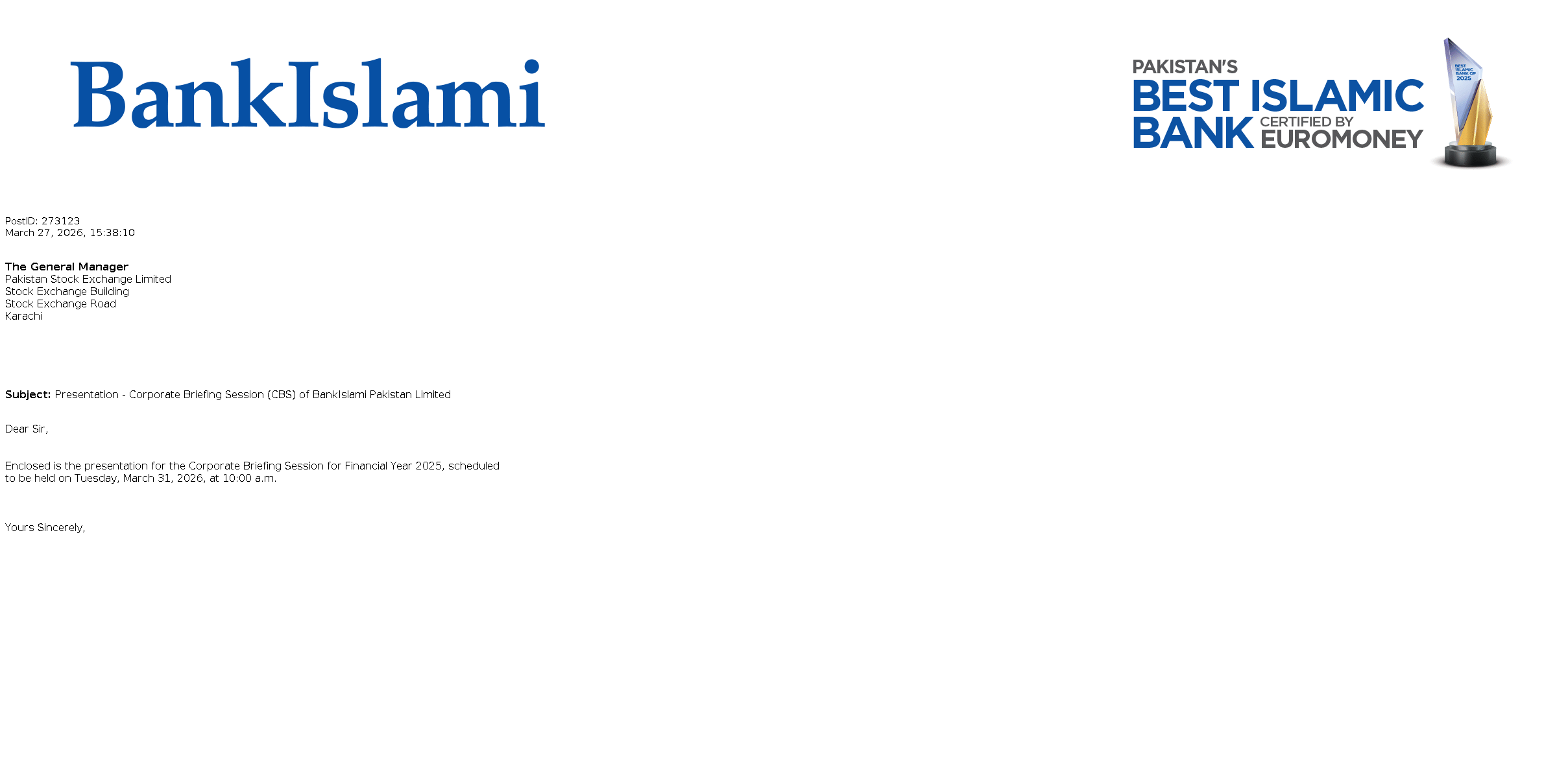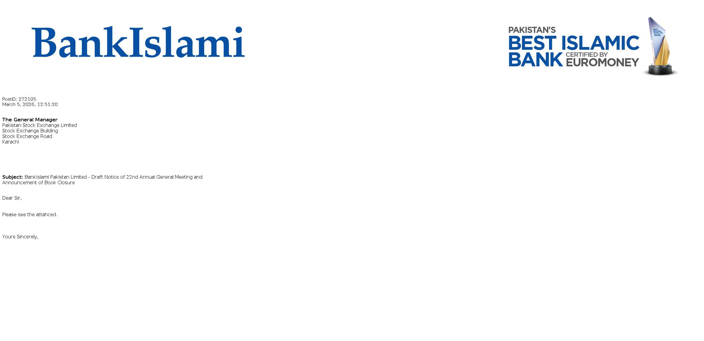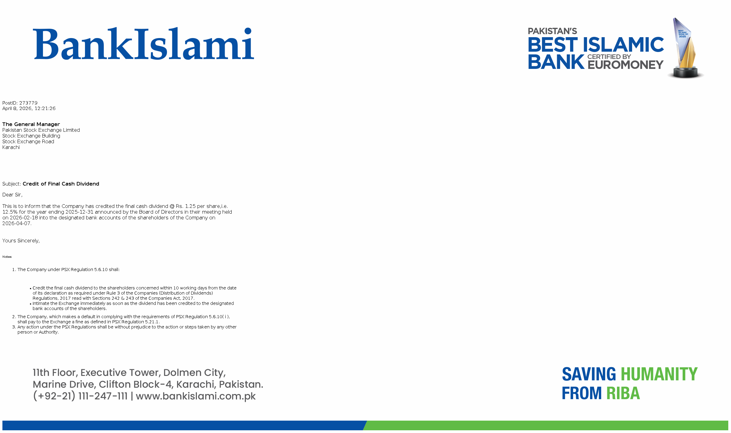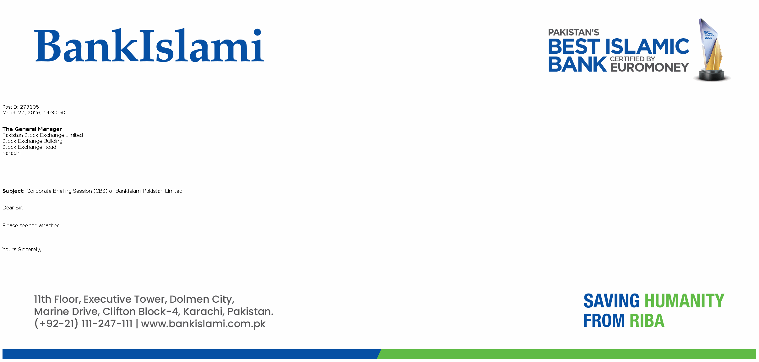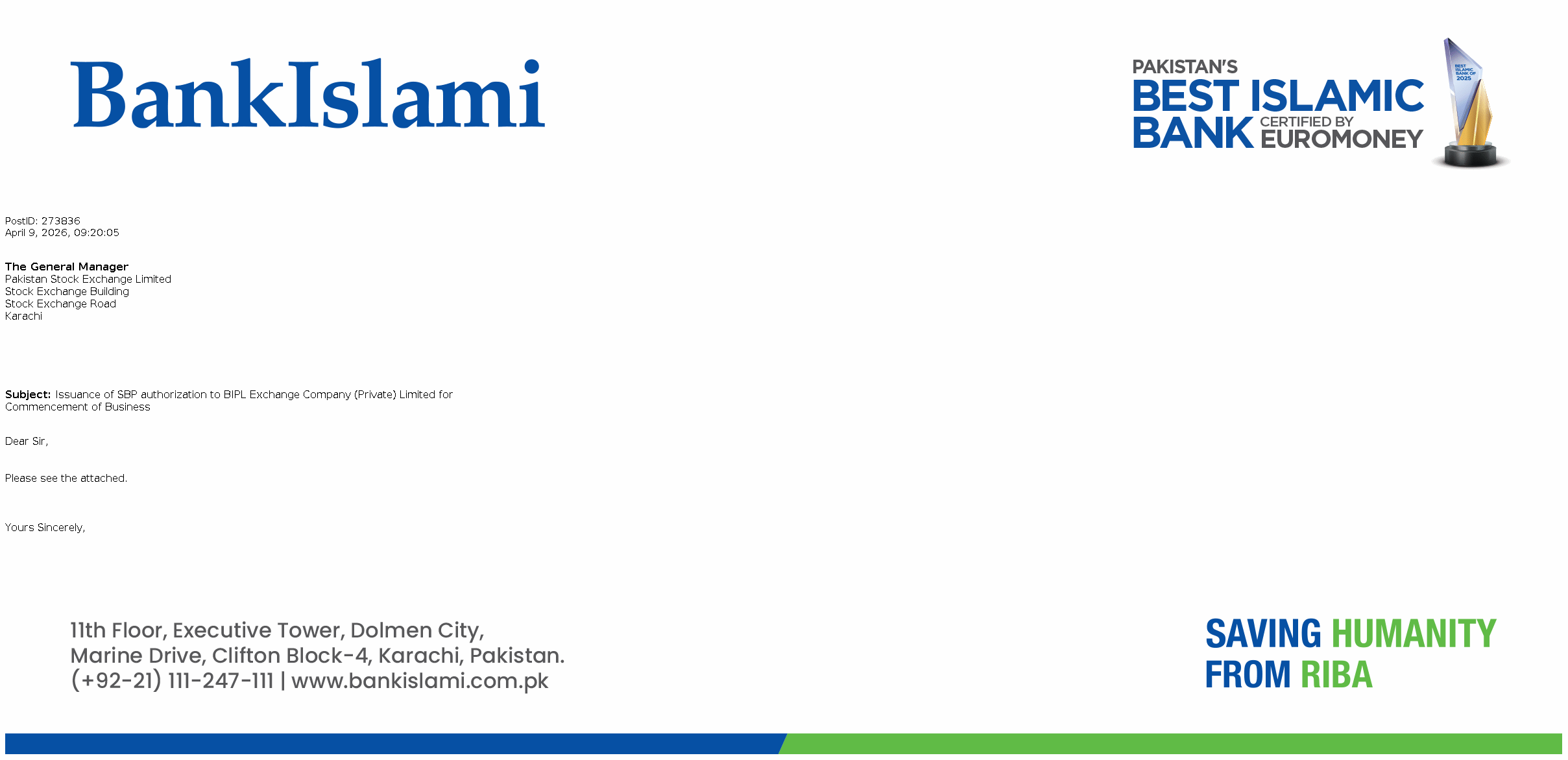 BankIslami Pakistan Limited was incorporated in Pakistan on October 18, 2004 as a public limited company to carry out the business of an Islamic Commercial Bank in accordance with the principles of Islamic Shariah. The State Bank of Pakistan (SBP) granted a ‘Scheduled Islamic Commercial Bank’ license to the Bank on March 18, 2005. The Bank is principally engaged in corporate, commercial, consumer, retail banking and investment activities.