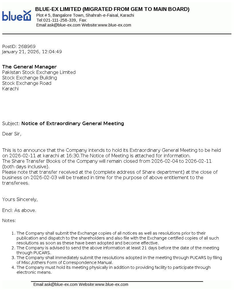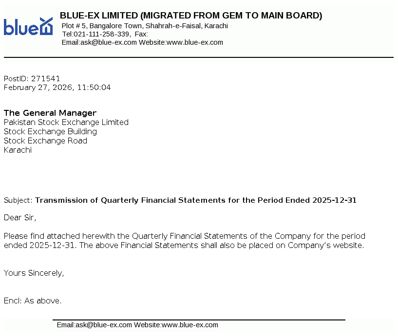Blue-Ex Limited was incorporated as a private limited company in Pakistan on December 12, 2005 under the repealed Companies Ordinance, 1984 (now Companies Act, 2017), The Principal activities of the company are to act as a cargo forwarder, provide domestic and international courier and allied services.
