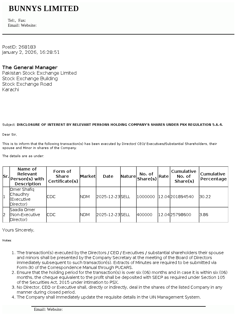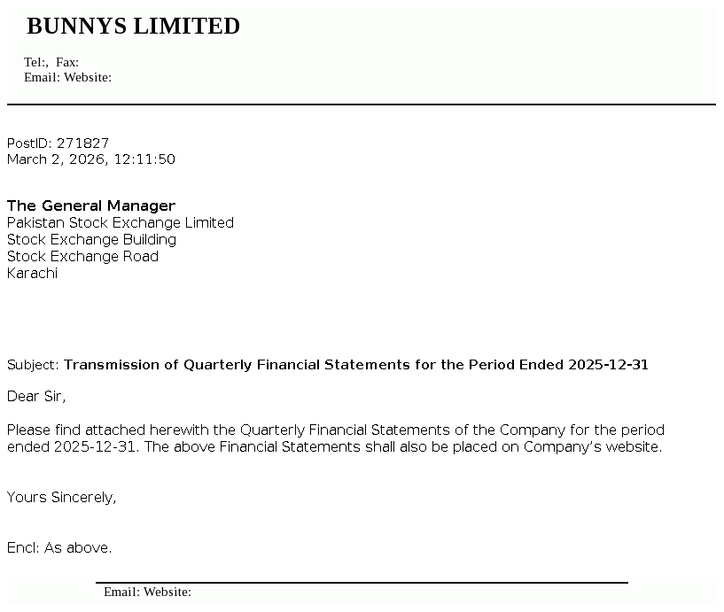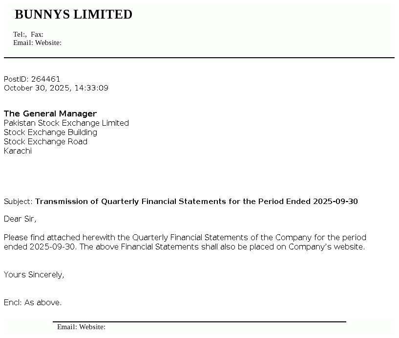 Bunny's Limited was incorporated in Pakistan as a private limited company on October 22, 1980 under the repealed Companies Act 1913, and was later converted into Public Limited Company. The company is principally engaged in manufacturing of bakery and other food products.