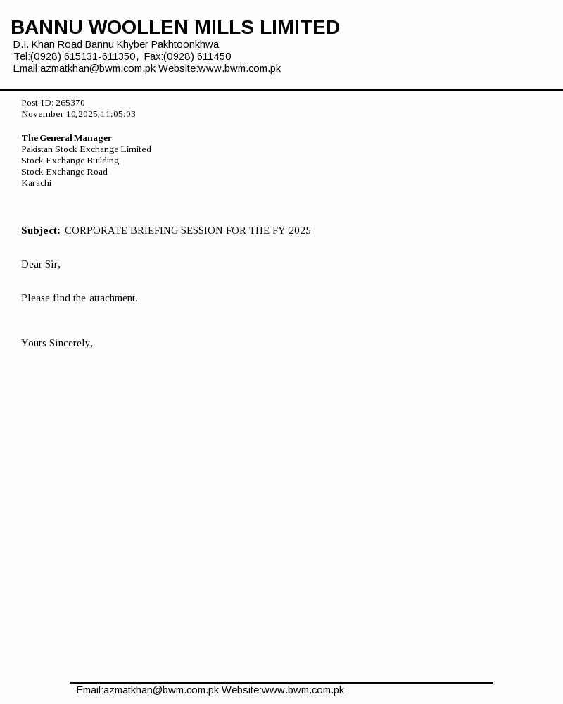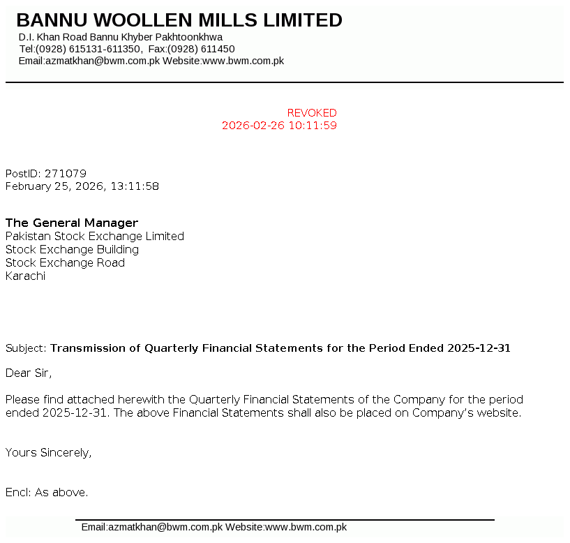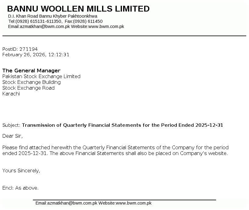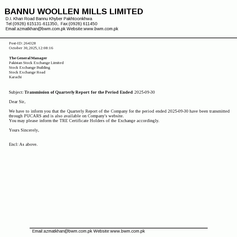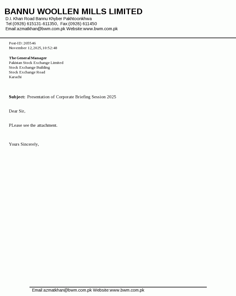Bannu Woollen Mills Ltd D.I.Khan Road, Bannu