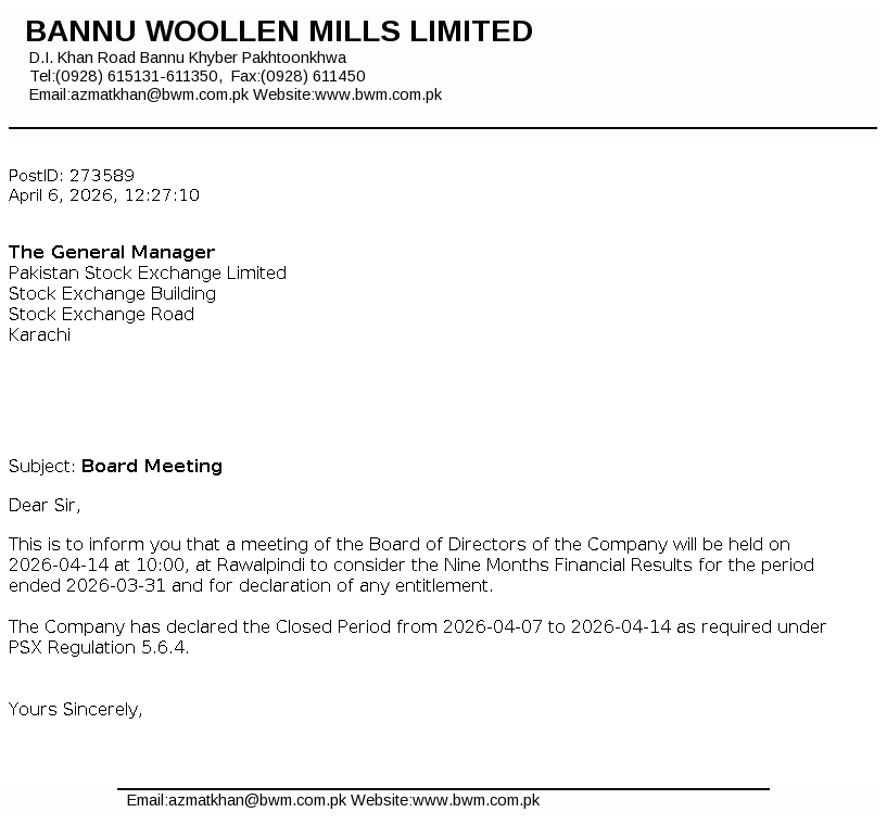 Bannu Woollen Mills Limited was incorporated in Pakistan as a Public Company in the year 1960 under the Companies Act, 1913 (now the Companies Ordinance, 1984). The Company is principally engaged in manufacture and sale of woollen yarn, cloth and blankets.