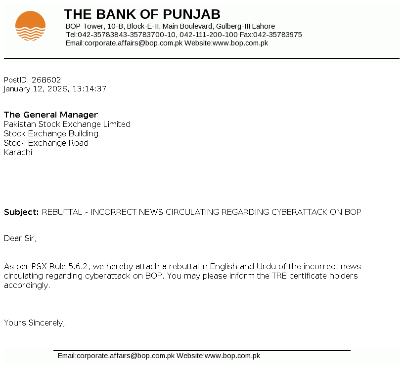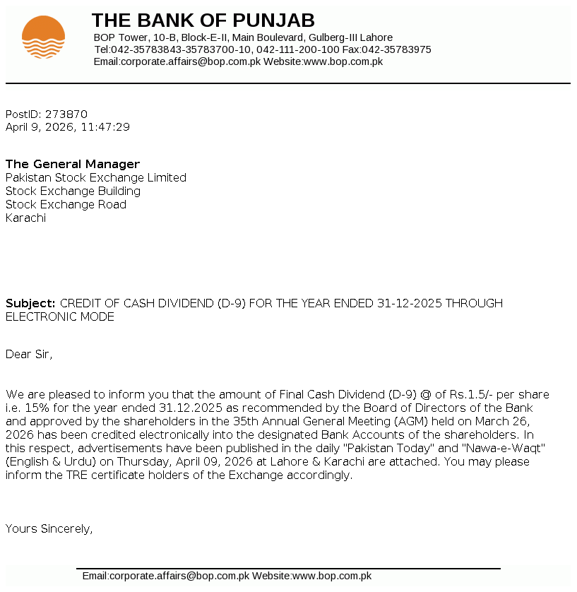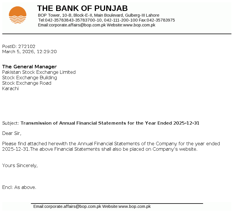 The Bank of Punjab was constituted pursuant to The Bank of Punjab Act, 1989. It was given the status of a scheduled bank by the State Bank of Pakistan (SBP) on September 19, 1994. It is principally engaged in commercial banking and related services. The majority shares of the Bank are held by Government of the Punjab (GoPb).