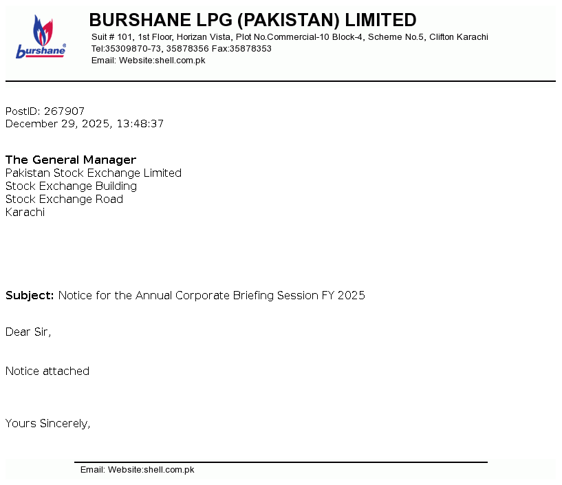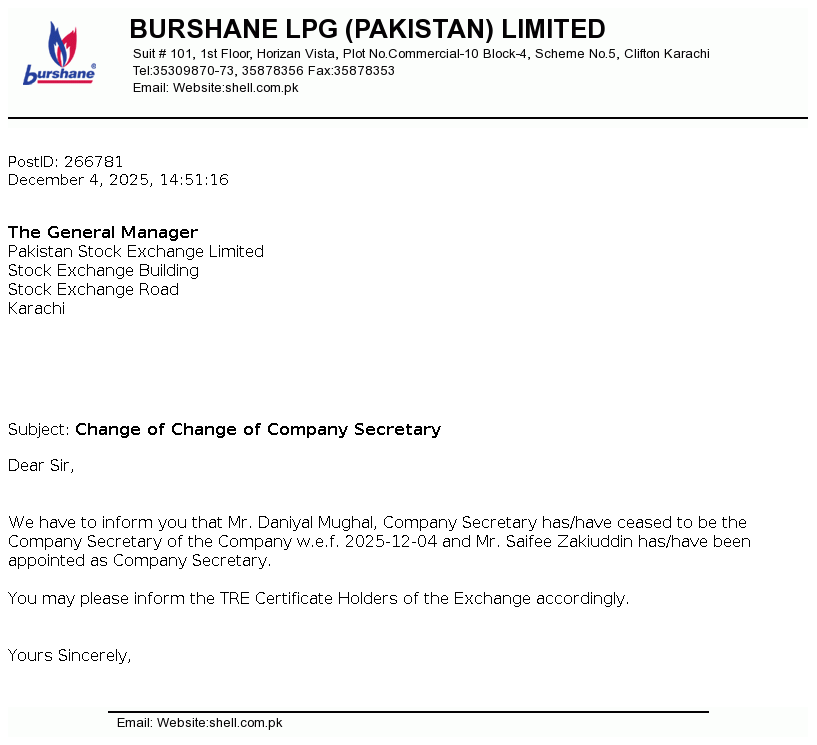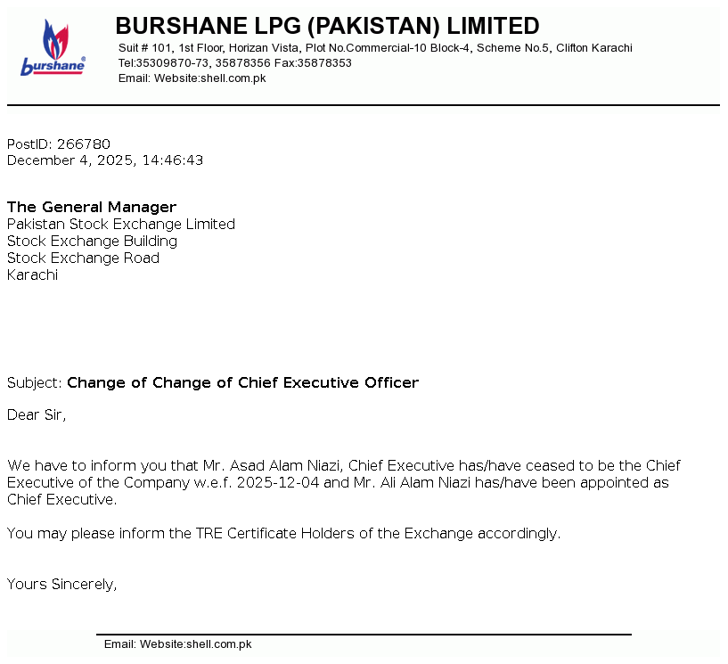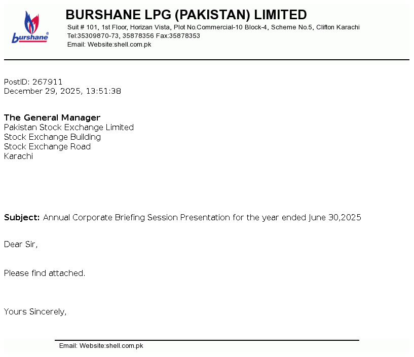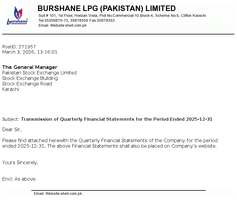 Burshane LPG (Pakistan) Limited is a limited liability company incorporated in Pakistan. The principal activity of the Company is storing, marketing and trading of Liquefied Petroleum Gas (LPG) throughout Pakistan and trading of Low Pressure Regulators (LPR).