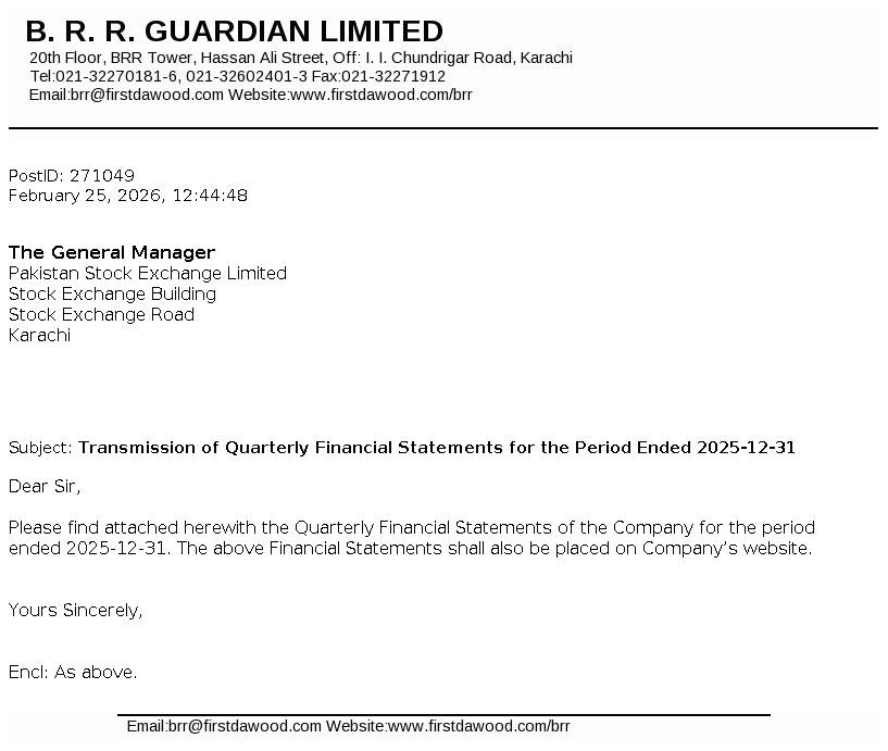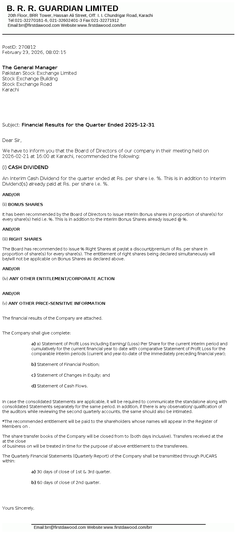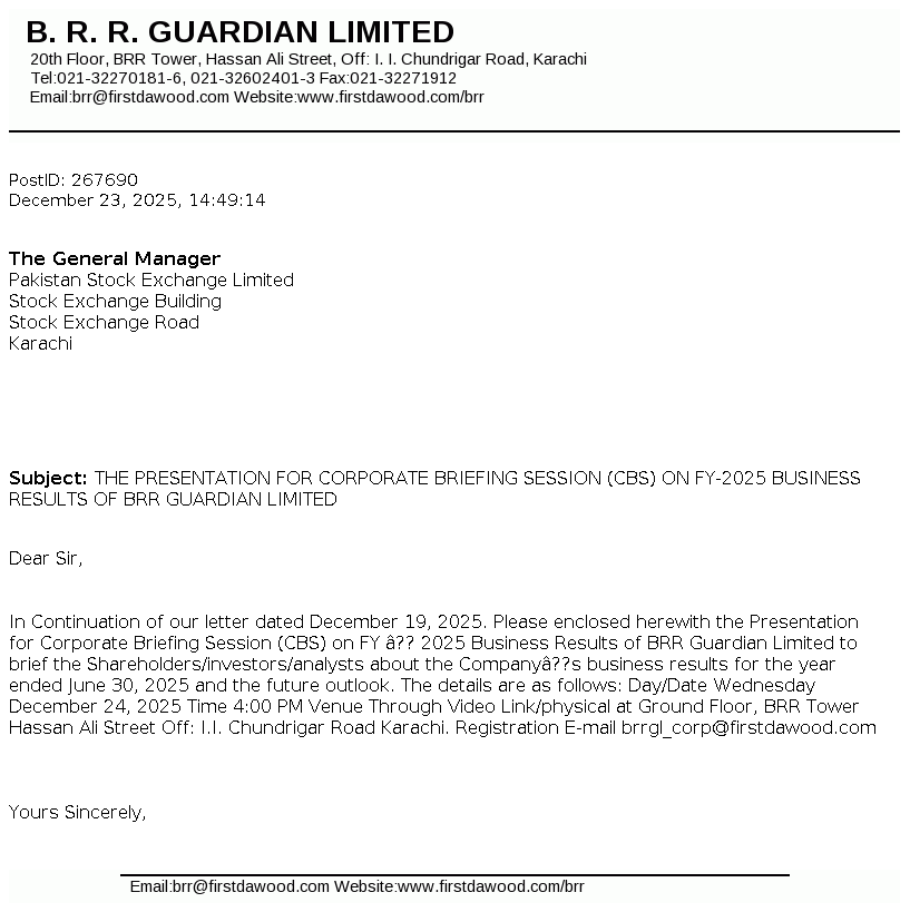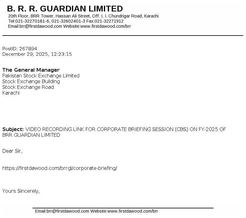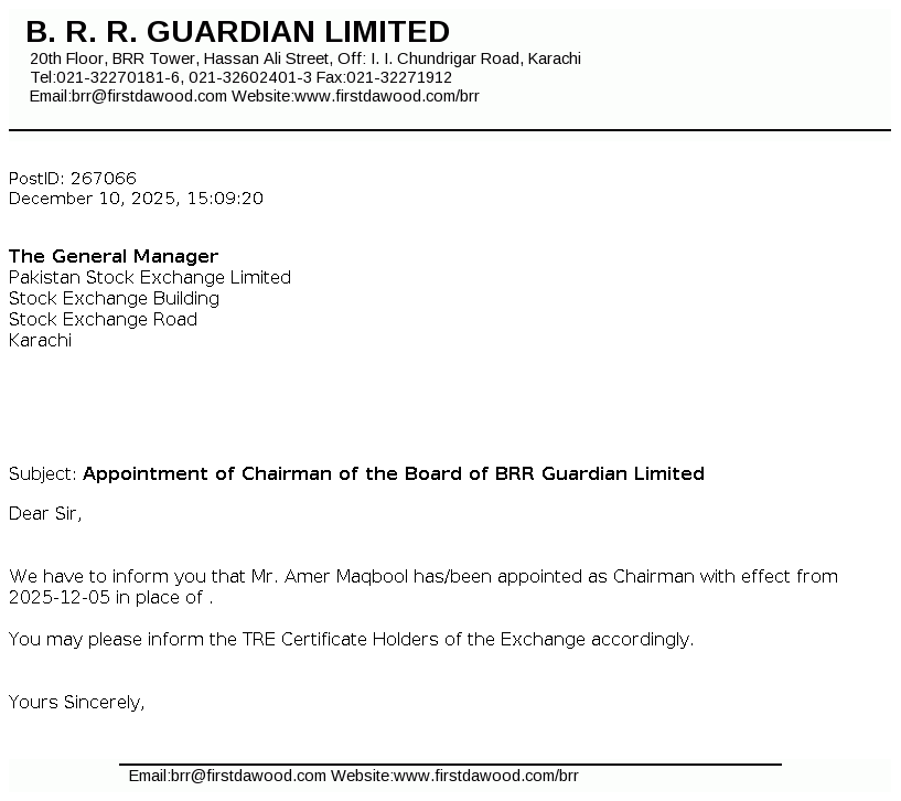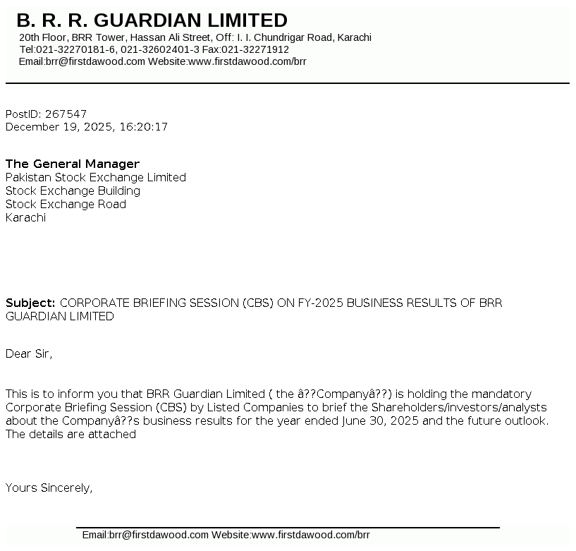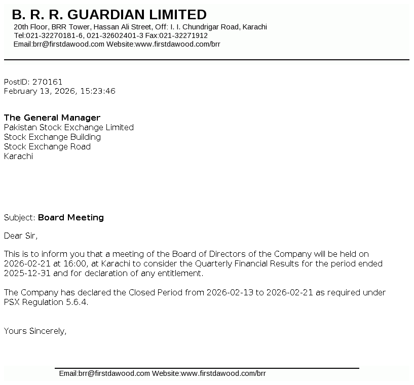 BRR Guardian Limited also known as BRRG is a real estate development and marketing company. The principle line of business of the company shall be marketing and development of all type of real estate including developed or undeveloped land, housing or commercial projects including commercial markets or multistoried building (for commercial or residential purposes), shopping centers, restaurants, hotels, recreational facilities etc. with the permission of concerned authorities and compliance with applicable laws and regulations.