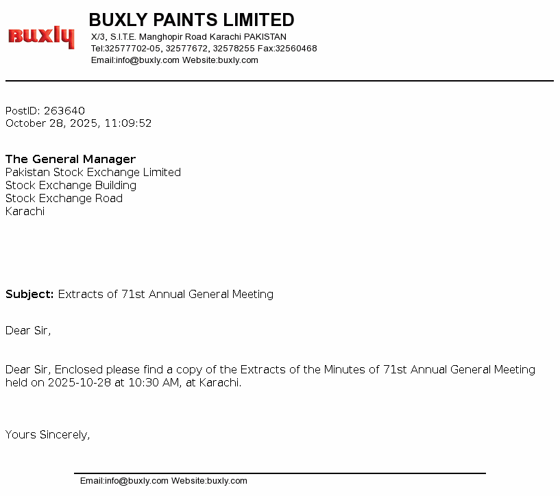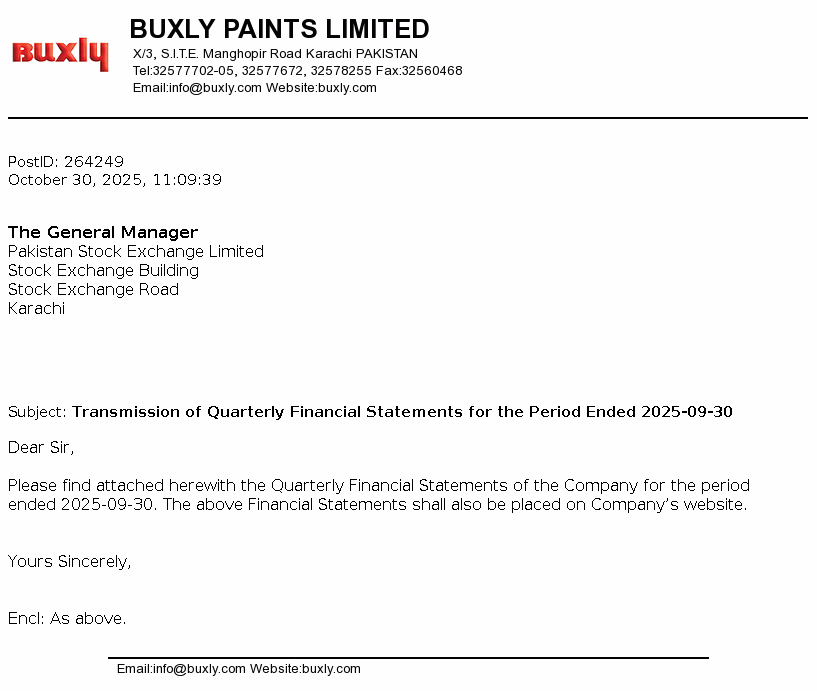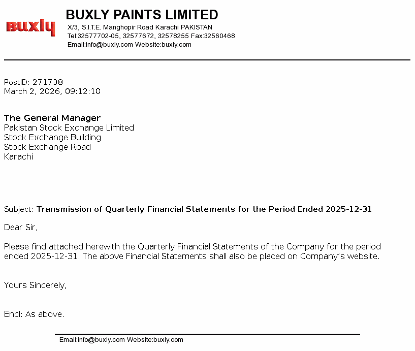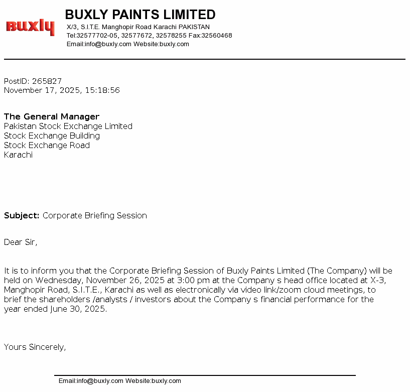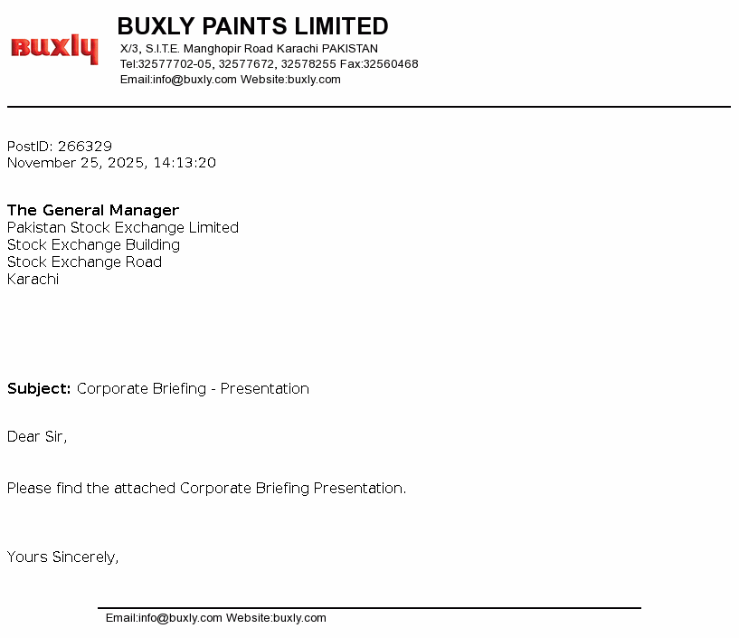 Buxly Paints Limited was incorporated in Pakistan in April 1954 as a private limited company under the Companies Act, 1913 (now the Companies Act, 2017) and subsequently converted into a public limited company in May 1985. The principal activity of the Company is manufacturing and sale of paints, pigments, protective surface coating, varnishes and other related products under a toll manufacturing agreement with Berger Paints Pakistan Limited, at a specified toll manufacturing fees.