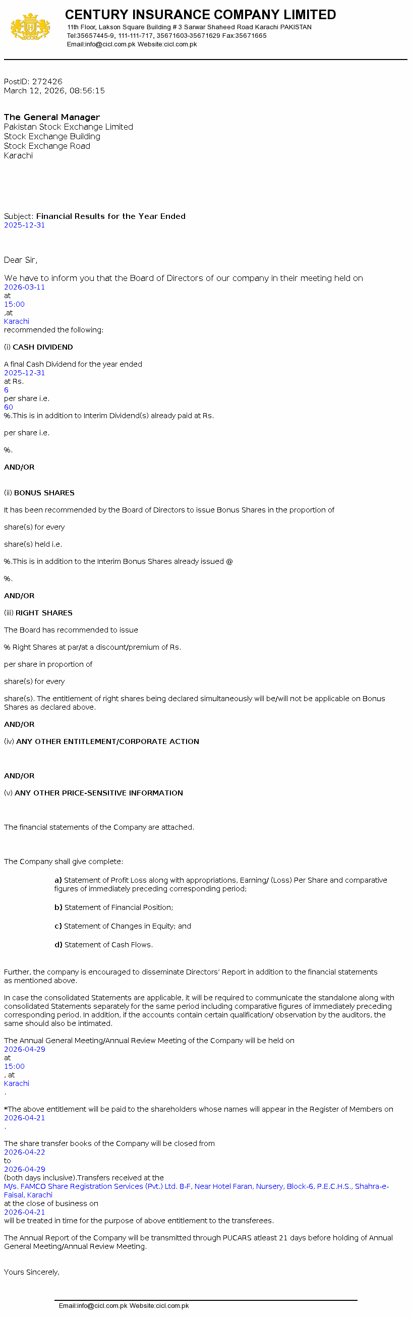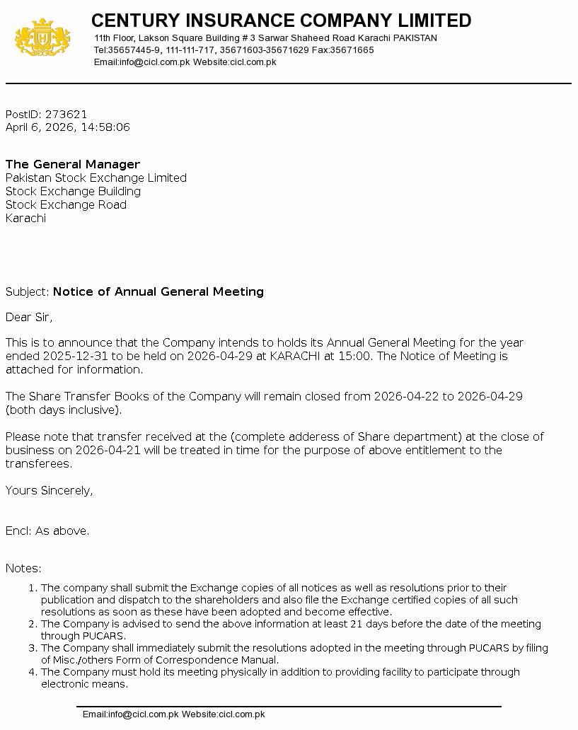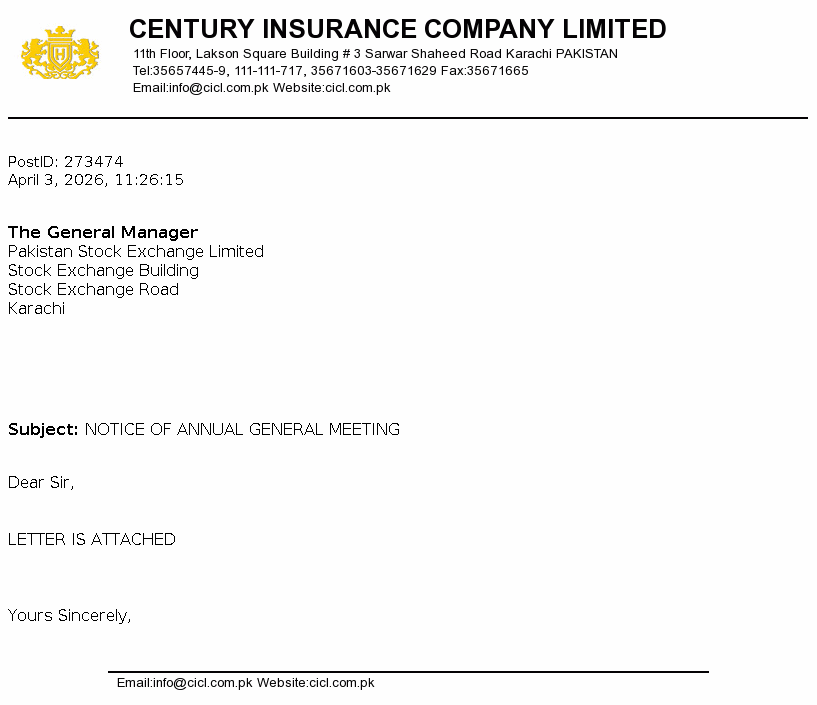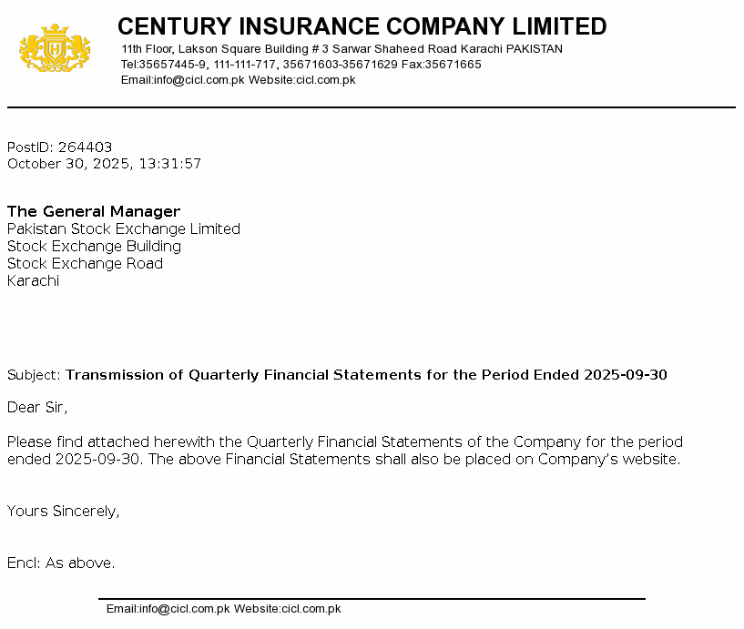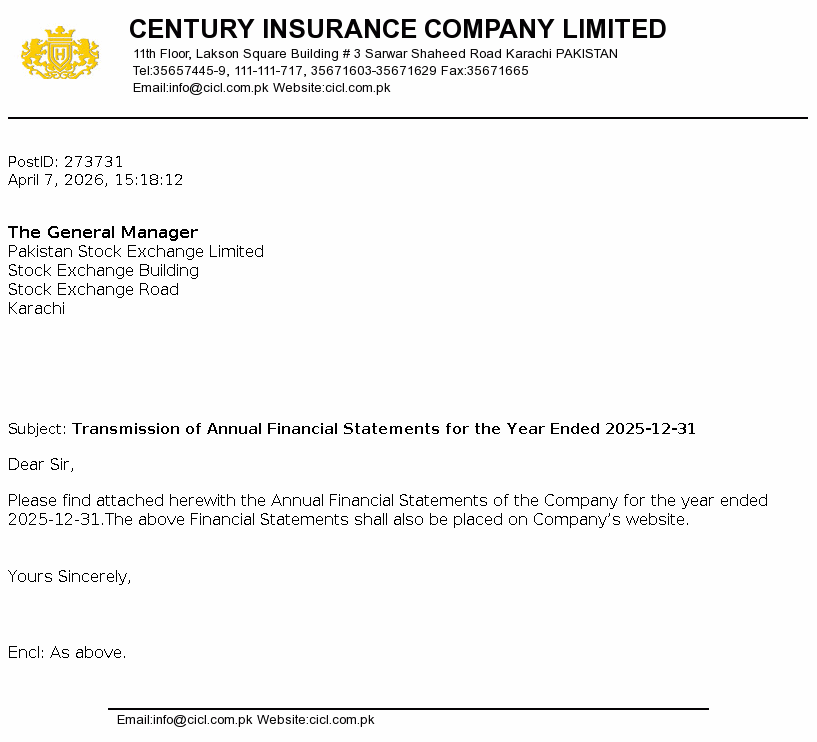 Century Insurance Company Limited is a public limited company incorporated in Pakistan on October 10, 1985 under the Companies Act 2017. The Company is engaged in general insurance business. The Company was granted authorization on August 07, 2017 under Rule 6 of the Takaful Rules, 2012 to undertake Window Takaful Operations by Securities and Exchange Commission of Pakistan (SECP) and under Takaful Rules, 2012 to carry on general takaful operations in Pakistan.