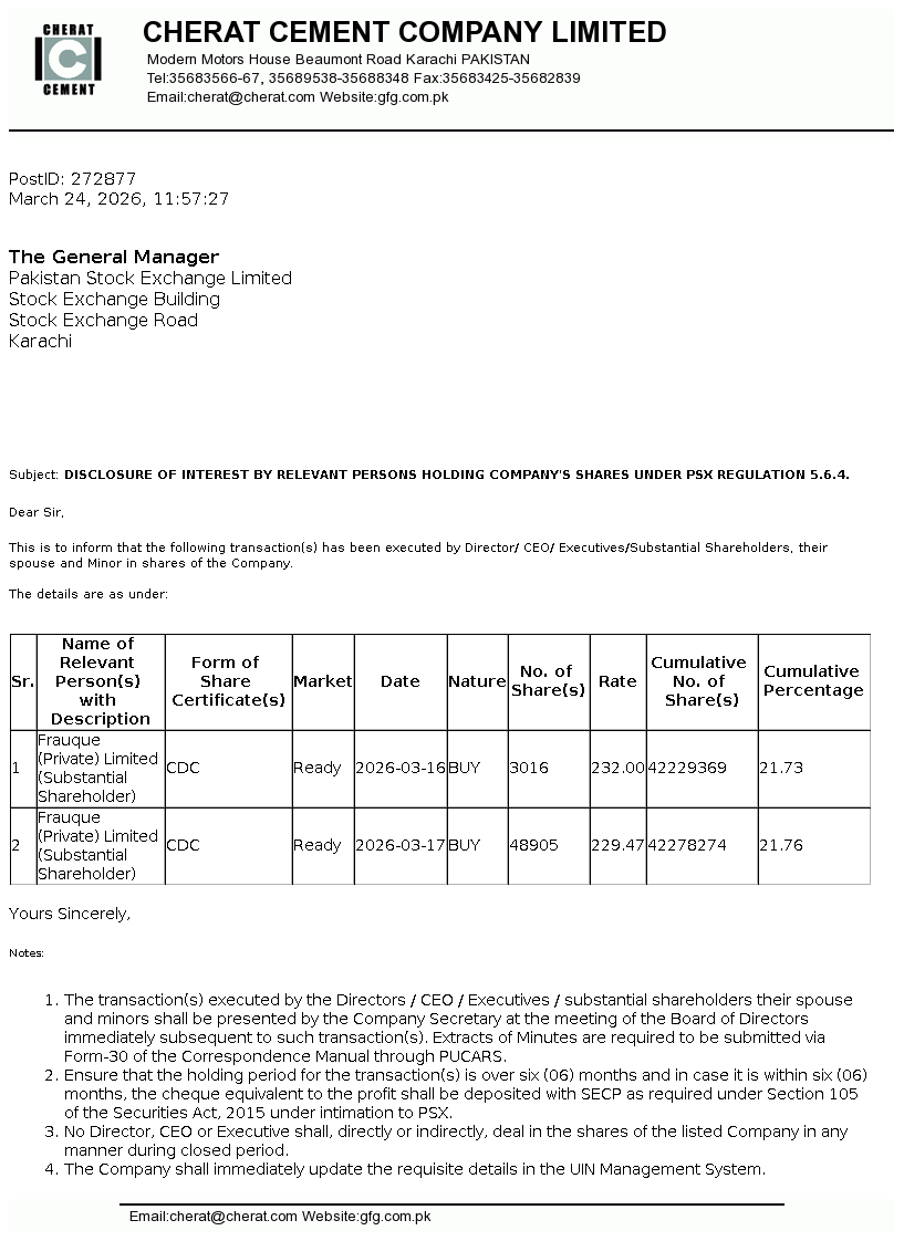 Cherat Cement Company Limited was incorporated in Pakistan as a public company limited by shares in the year 1981. Its main business activity is manufacturing, marketing and sale of cement.
