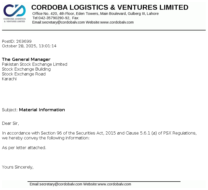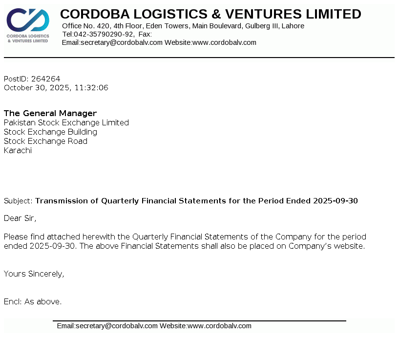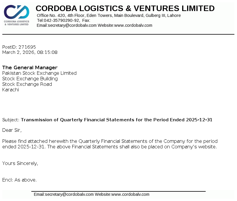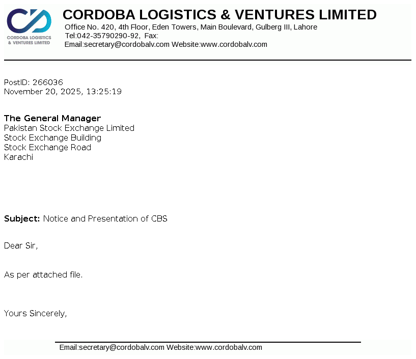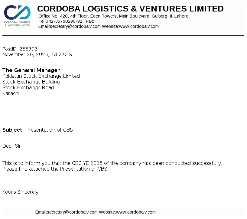 Cordoba Logistics & Ventures Limited was incorporated in Pakistan on December 01, 1986 as a Public Limited Company under the Companies Ordinance, 1984. The Company is principally engaged in the business of logistics and other ventures.