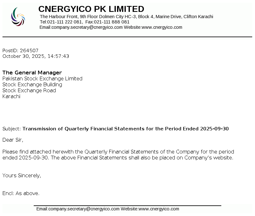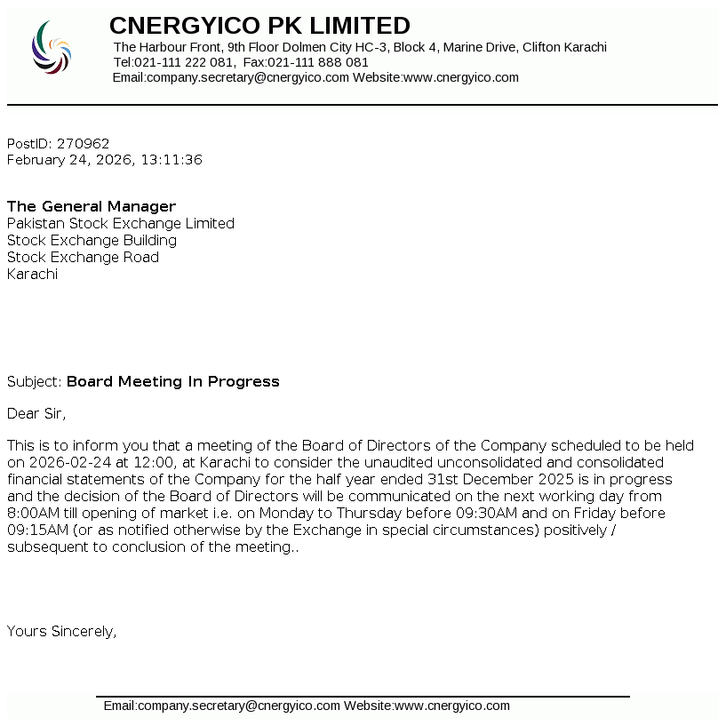 Cnergyico Pk Limited was incorporated in Pakistan as a public limited company on 09 January 1995 under the repealed Companies Ordinance, 1984. The Company currently operates two business segments namely Oil Refinery Business and Petroleum Marketing Business. Petroleum Marketing Business was formally launched in 2007.