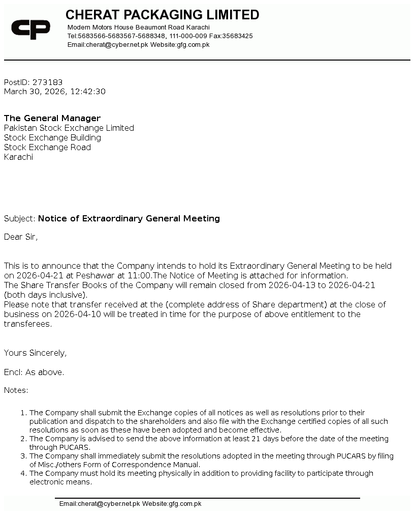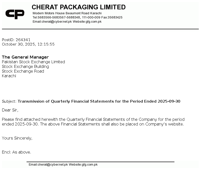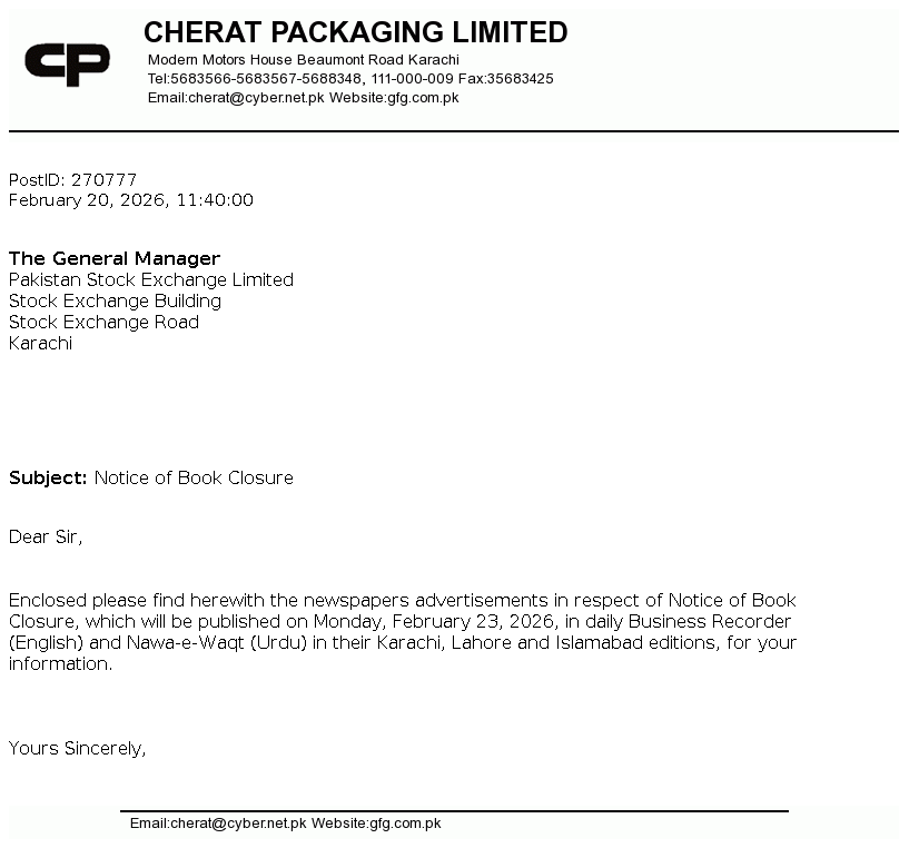 Cherat Packaging Limited was incorporated in Pakistan as a public company limited by shares in the year 1989. Its main business activities are manufacturing, marketing and sale of paper sacks, polypropylene bags and flexible packaging material.