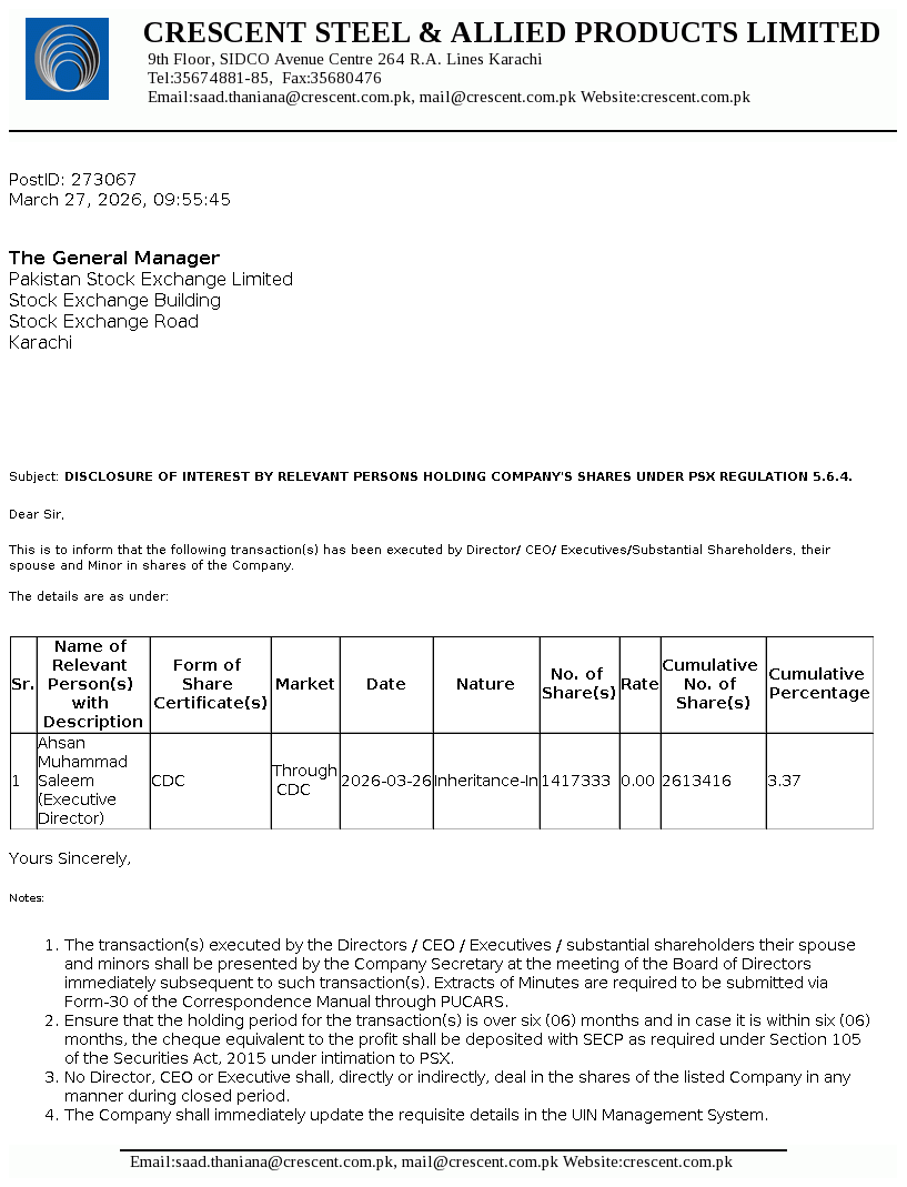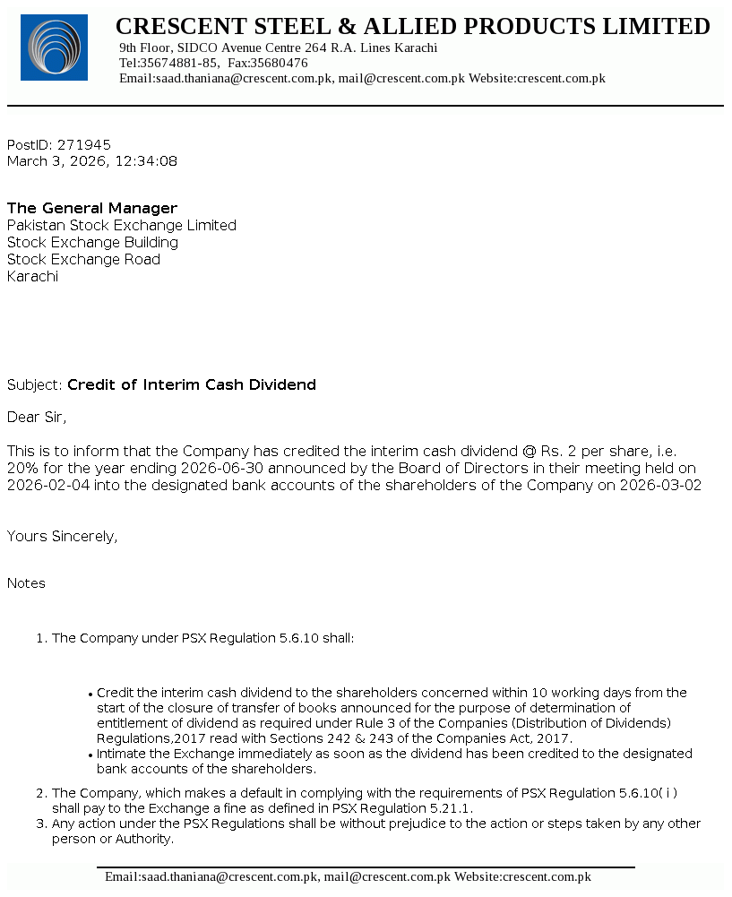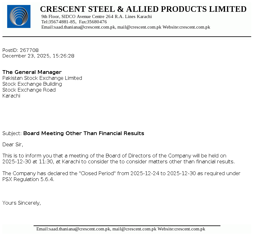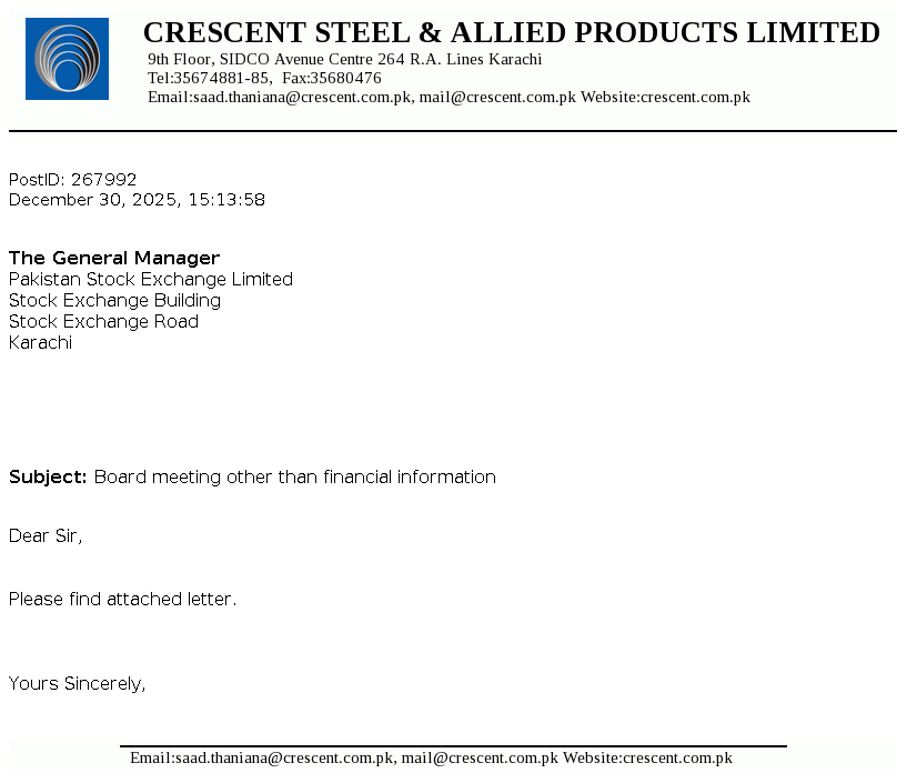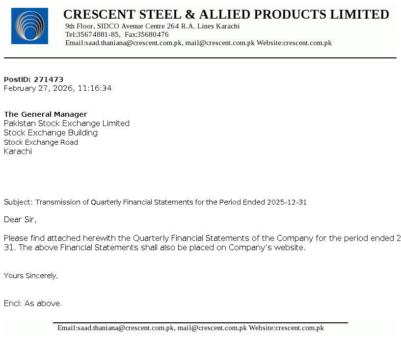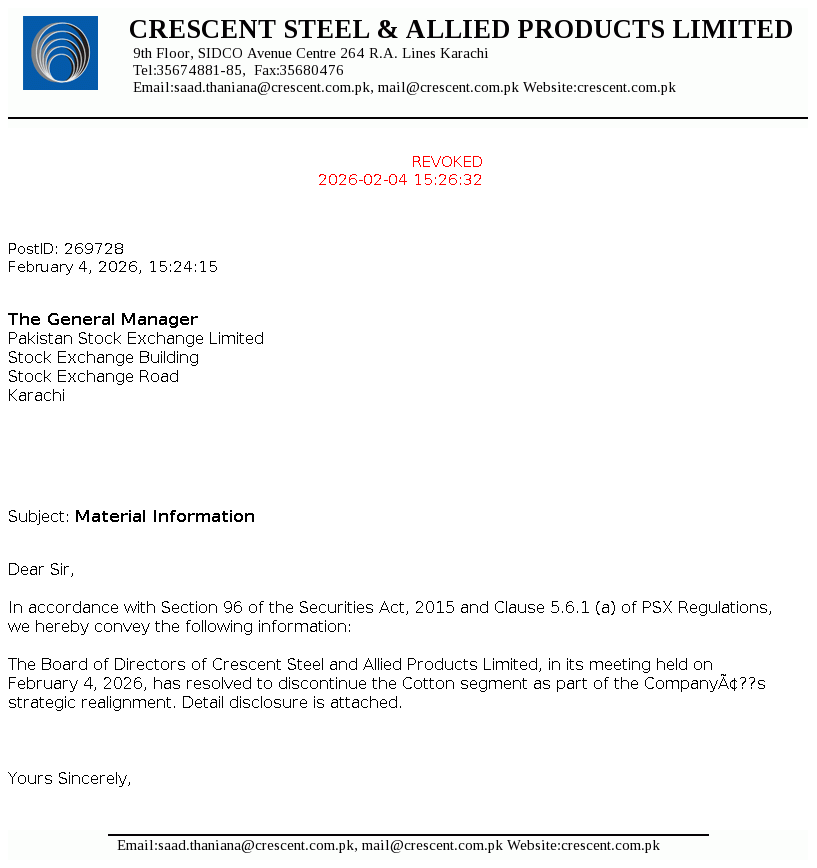 Crescent Steel and Allied Products Limited was incorporated on 1 August 1983 as a public limited company in Pakistan under the Companies Act, 1913 (now Companies Act, 2017). The Company operates five segments Steel, Cotton, Investment and Infrastructure Development (IID), Energy and Hadeed (Billet) segment.