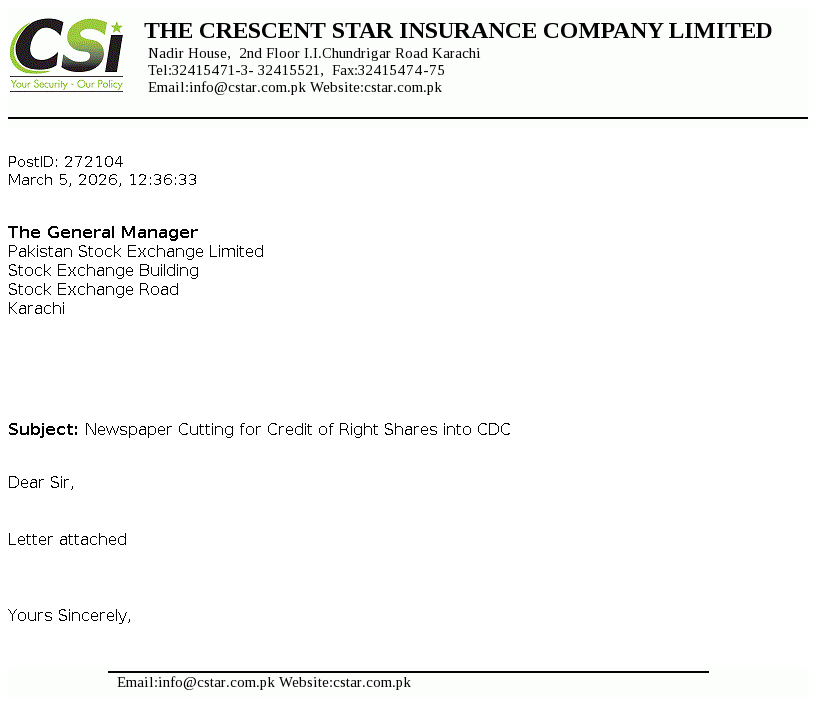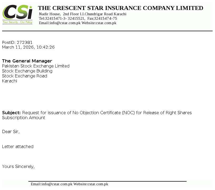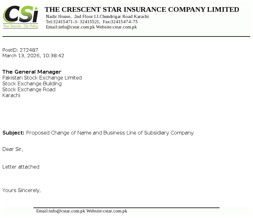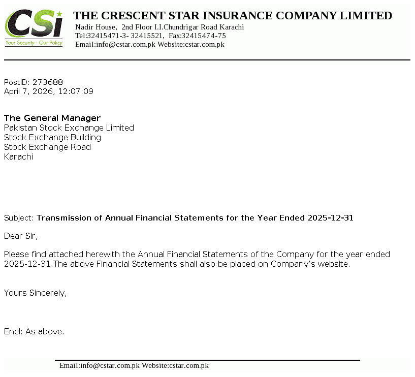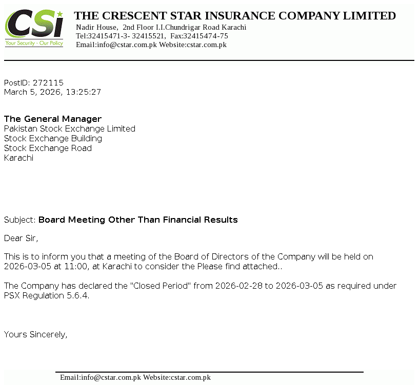Crescent Star Insurance Limited was incorporated in Pakistan as a Public Limited Company in the year 1957 under the Companies Act, 1913 (now the Companies Act, 2017). The Company is engaged in providing non-life general insurance services mainly in spheres of Fire and property damage, Marine, aviation and transport, Motor, Credit & suretyship, Accident & health and Miscellaneous.