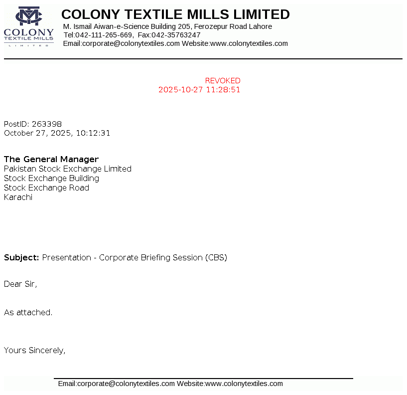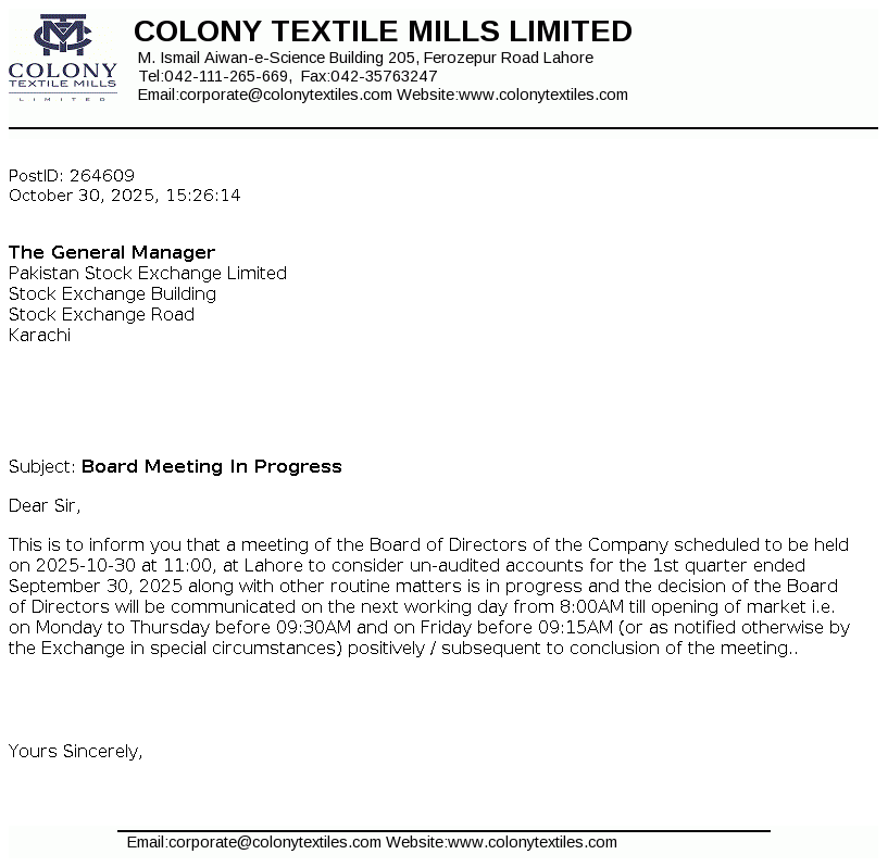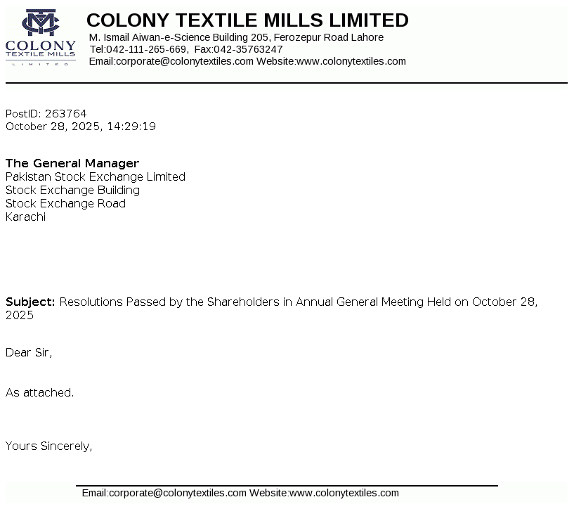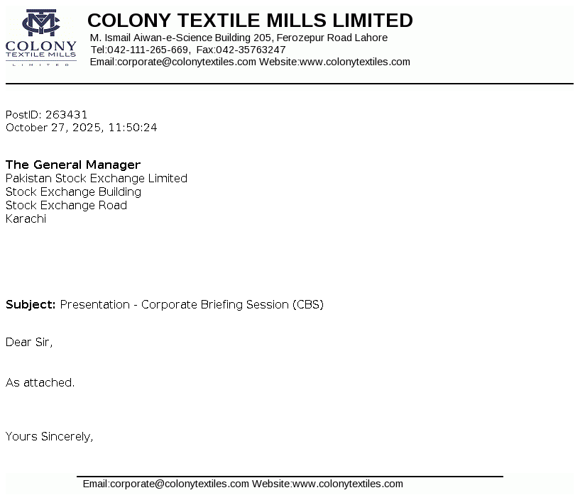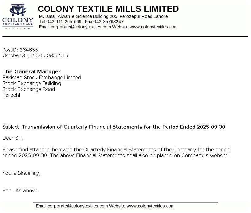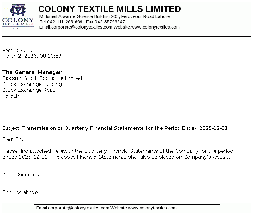 Colony Textile Mills Limited is a Public Company Limited by shares incorporated in Pakistan on 12 January 2011 under the provisions of the repealed Companies Ordinance, 1984 (now The Companies Act 2017). The principal activity of the company is manufacturing and sale of yarn, fabric, garments made ups and trading in real estate