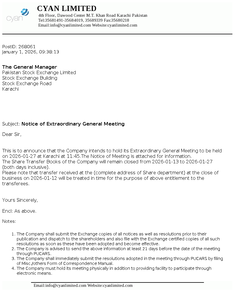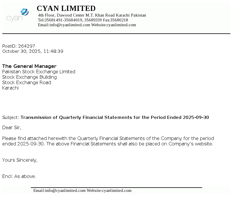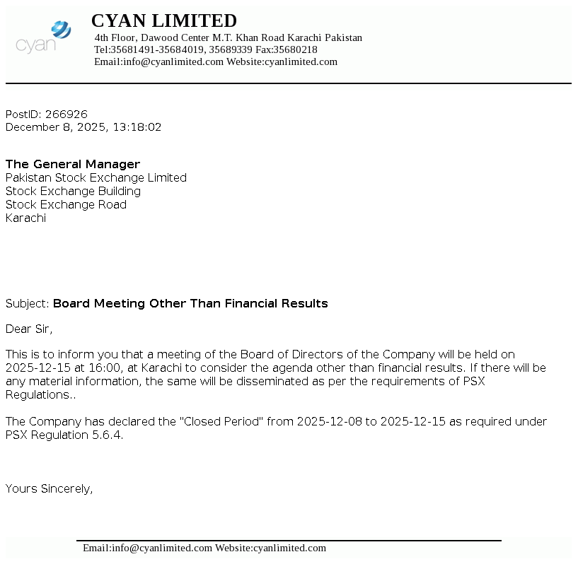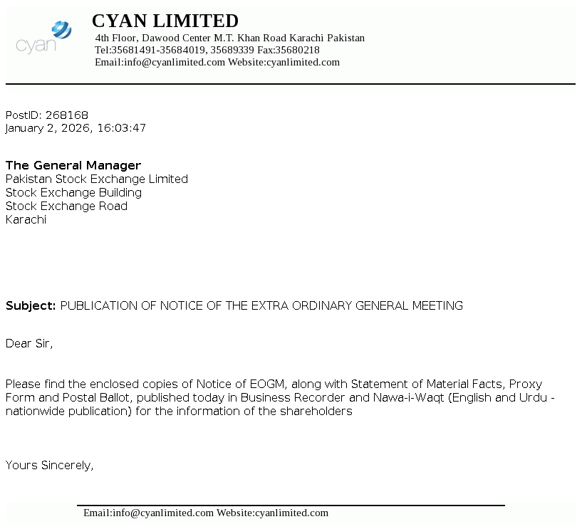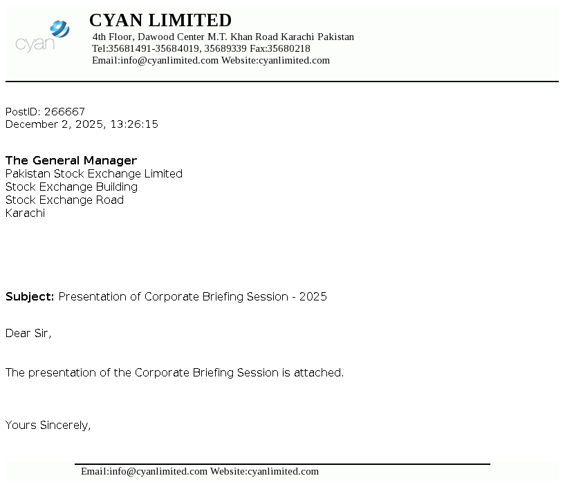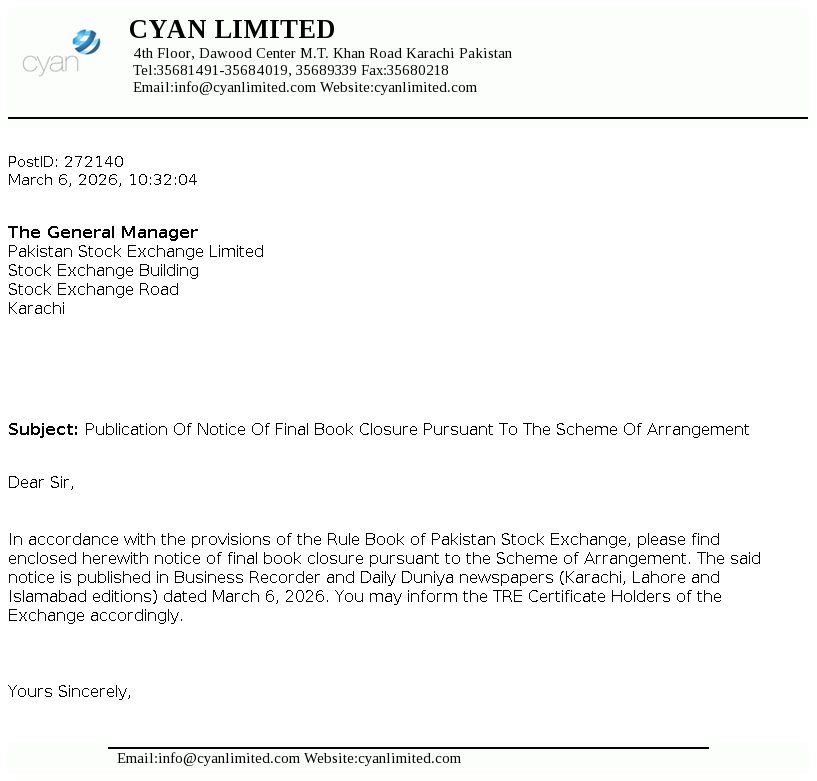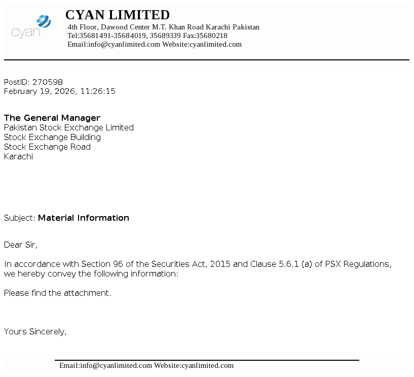 Cyan Limited, a DH Group Company, is a Public Limited Company incorporated in Pakistan on April 23,1960 under the Companies Act, 1913 (now Companies Act, 2017). The Company is a subsidairy of Dawood Corporation (Private) Limited. The company is engaged in making equity investments in companies with high growth potential.