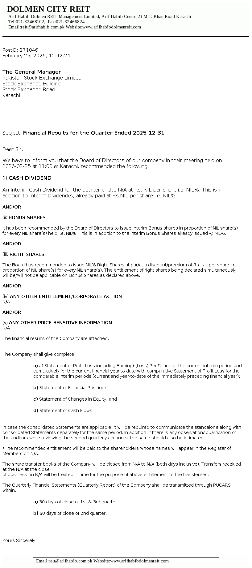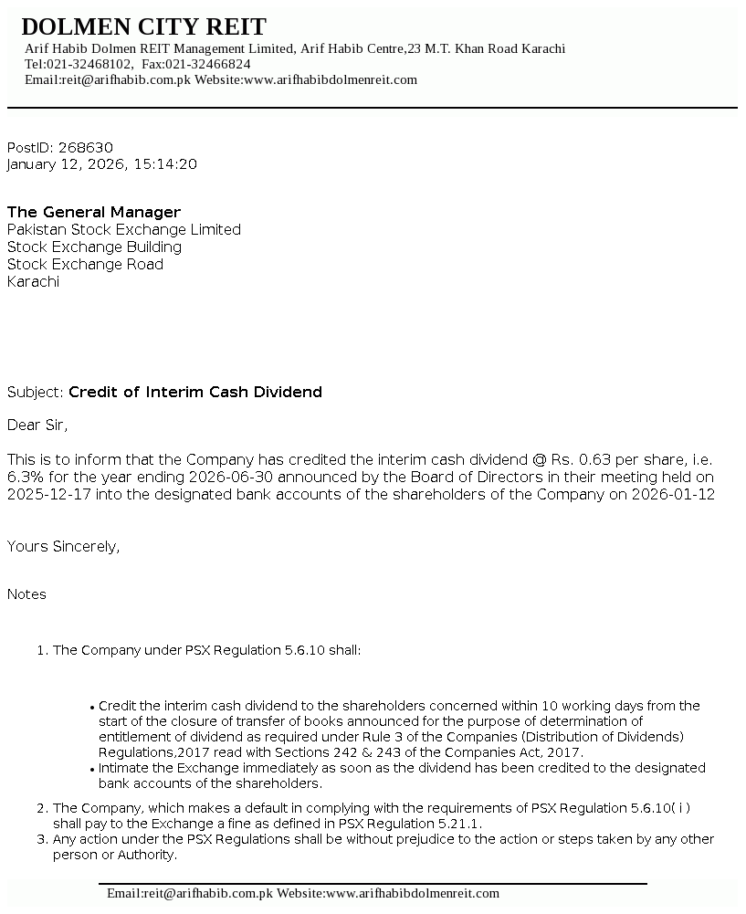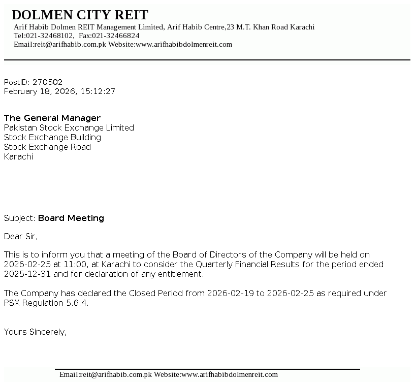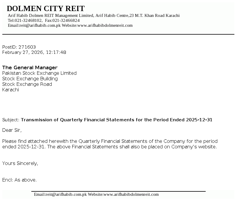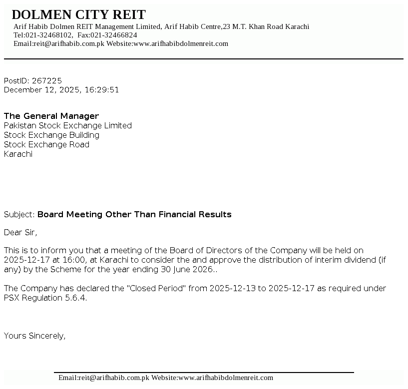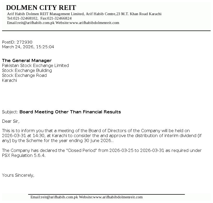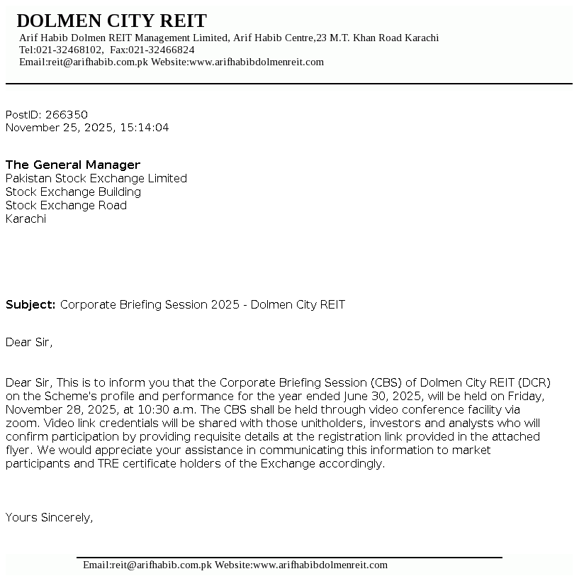 Dolmen City REIT was established under Trust Deed, dated 20 January 2015, executed between Arif Habib Dolmen REIT Management Limited (AHDRML), as the REIT Management Company (RMC) and Central Depositary Company of Pakistan Limited (CDCPL), as the Trustee; and is governed under the the Real Estate Investment Trust Regulations, 2015 (REIT Regulations 2015), promulgated and amended from time to time by the Securities & Exchange Commission of Pakistan (the SECP).