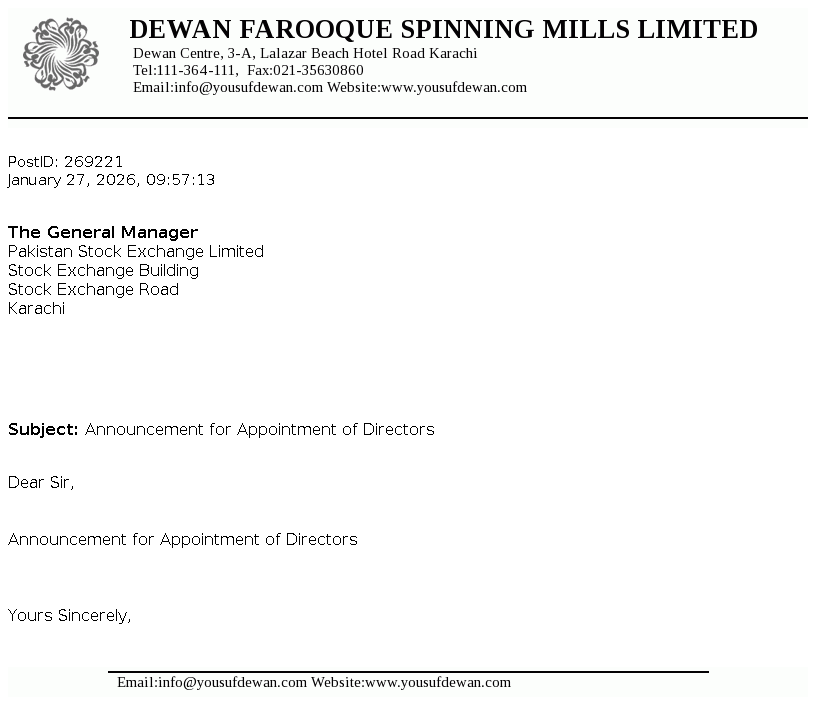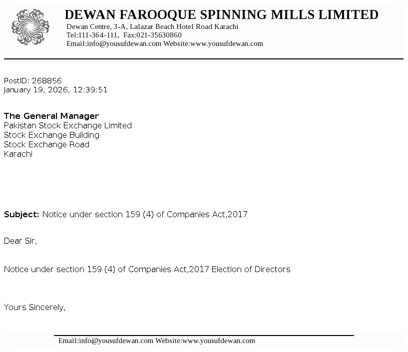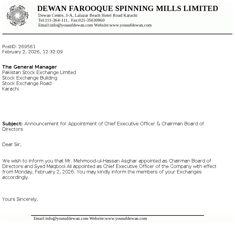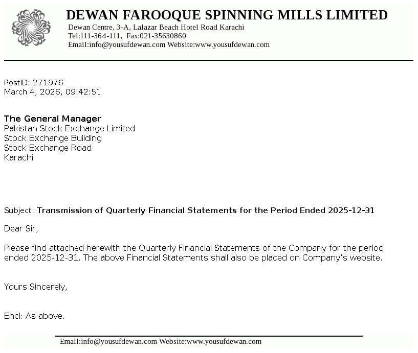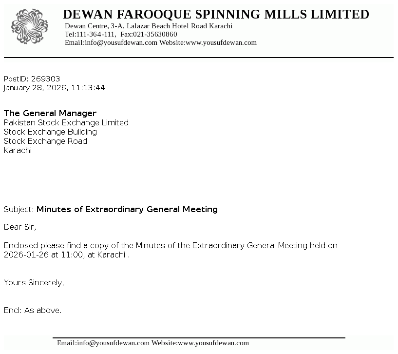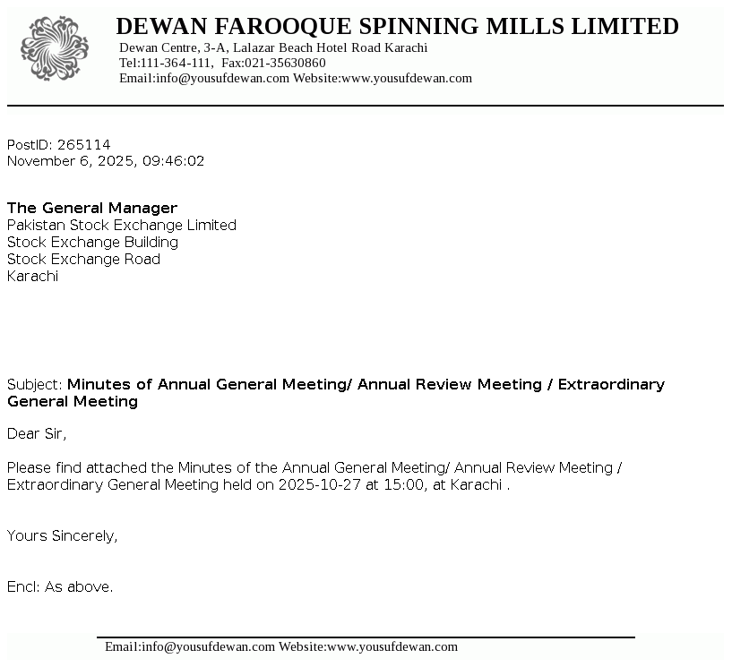 Dewan Farooque Spinning Mills Limited was incorporated in Pakistan on December 22, 2003 as public limited company, under the Companies Ordinance, 1984 (now Companies Act 2017). The principal activity of the company is manufacturing and sale of fine quality yarn. The Company also manufactures yarn on contract basis.