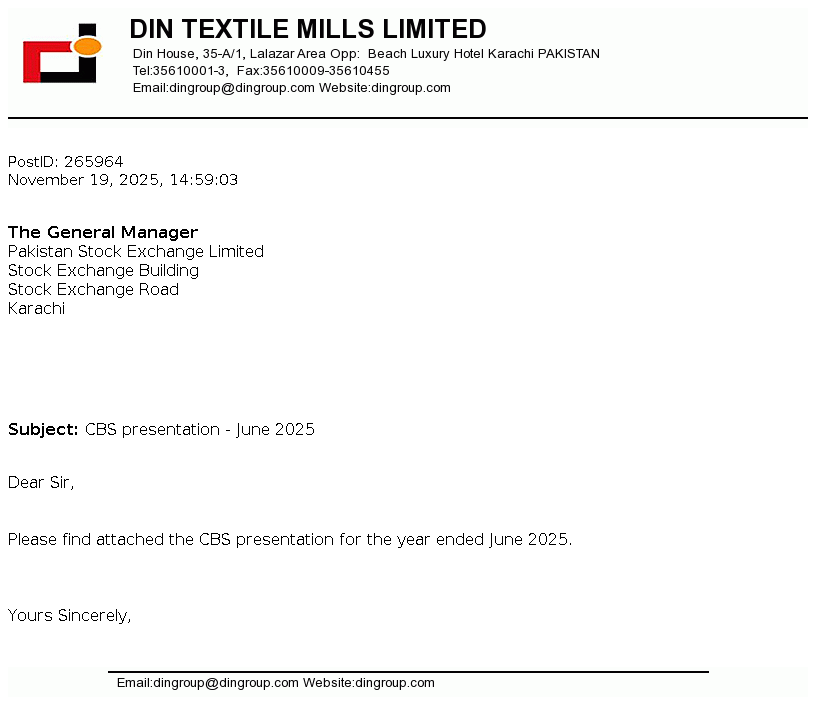 The company is limited by Shares incorporated on Pakistan on June 13, 1988. The principal business of the Company is to manufacture and sale of yarn and fabric.