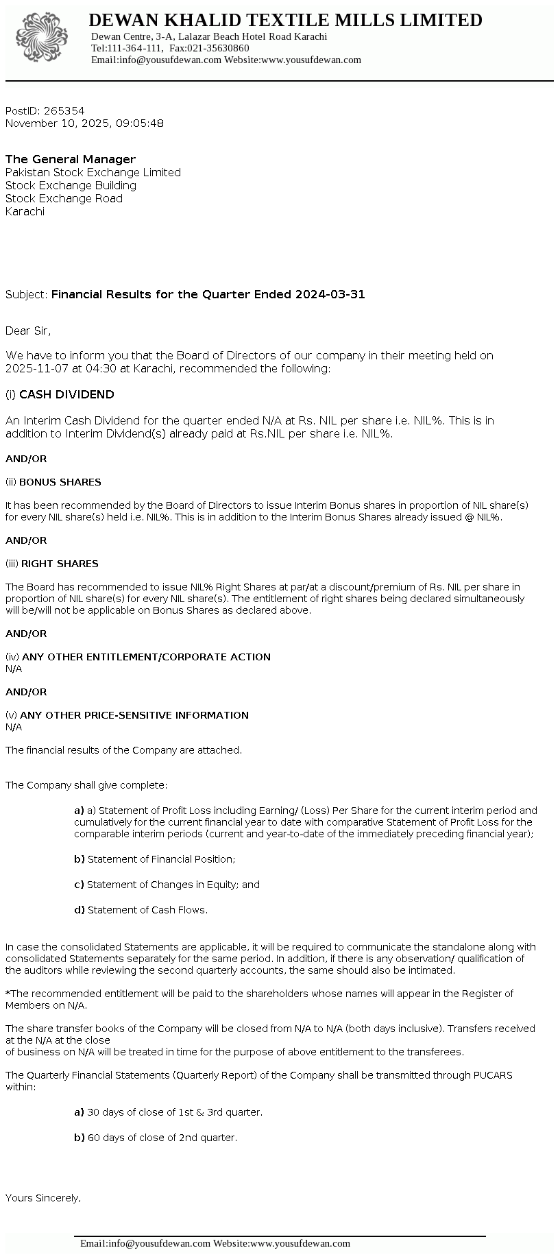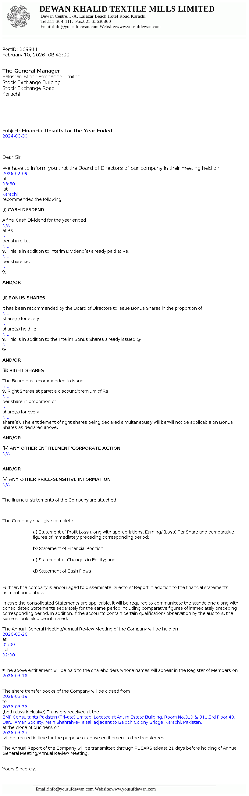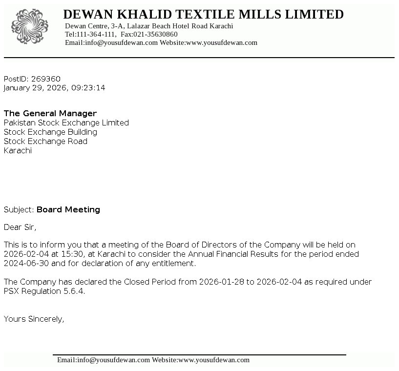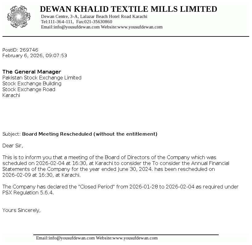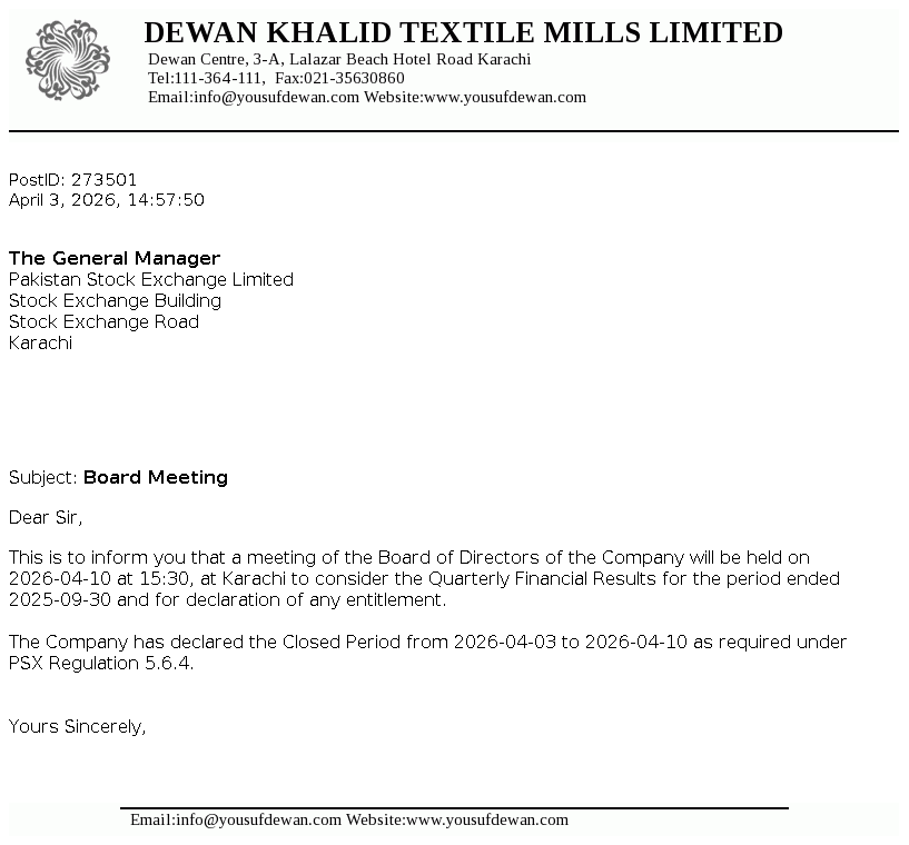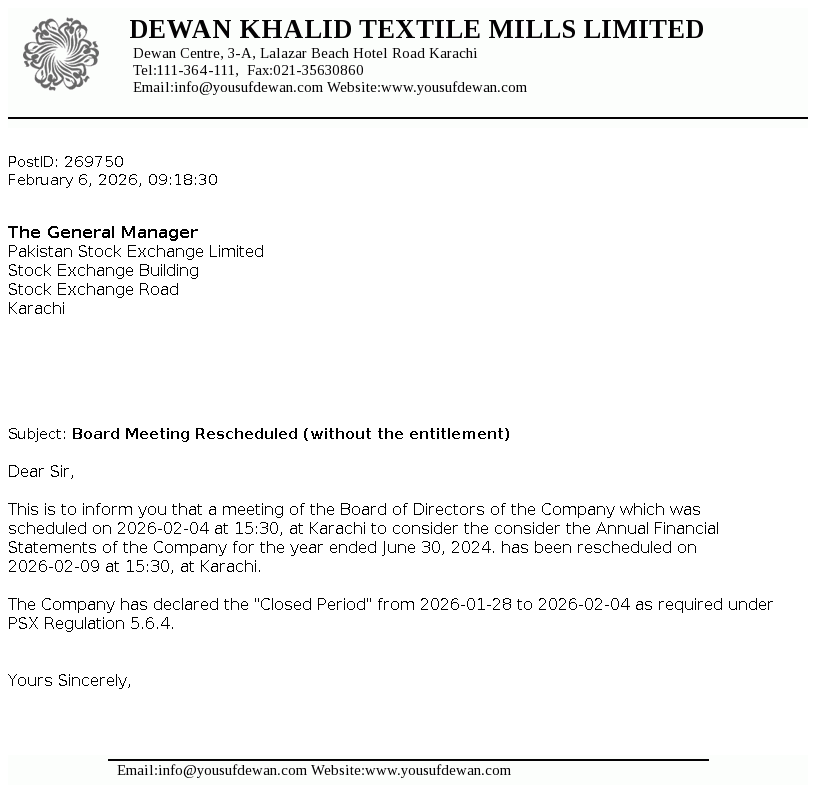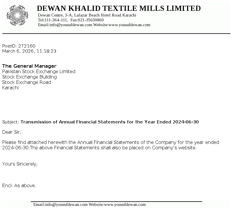Dewan Khalid Textile Mills Limited was incorporated in Pakistan, as a public limited company on April 03, 1978, under the Companies Act, 1913 (Now the Companies Act, 2017). The Principal activity of the Company is trading, manufacturing and sale of yarn. However, the Operations of the company are suspended since August 2016.