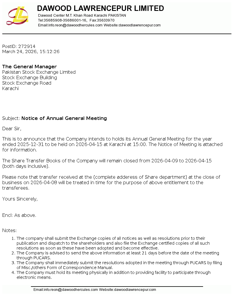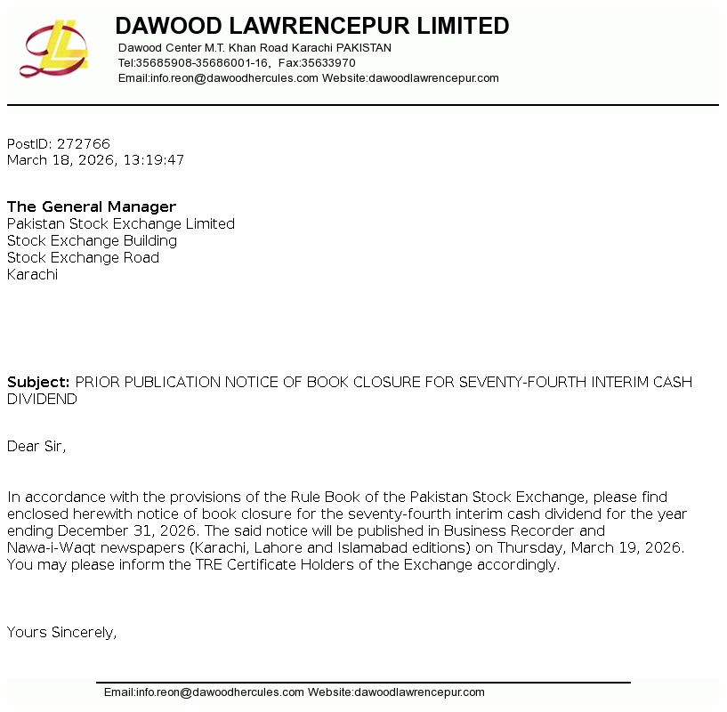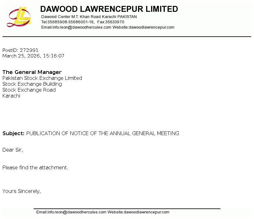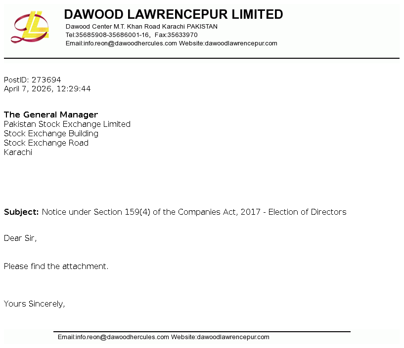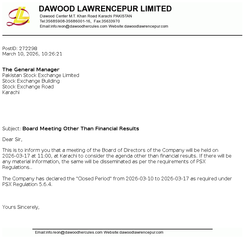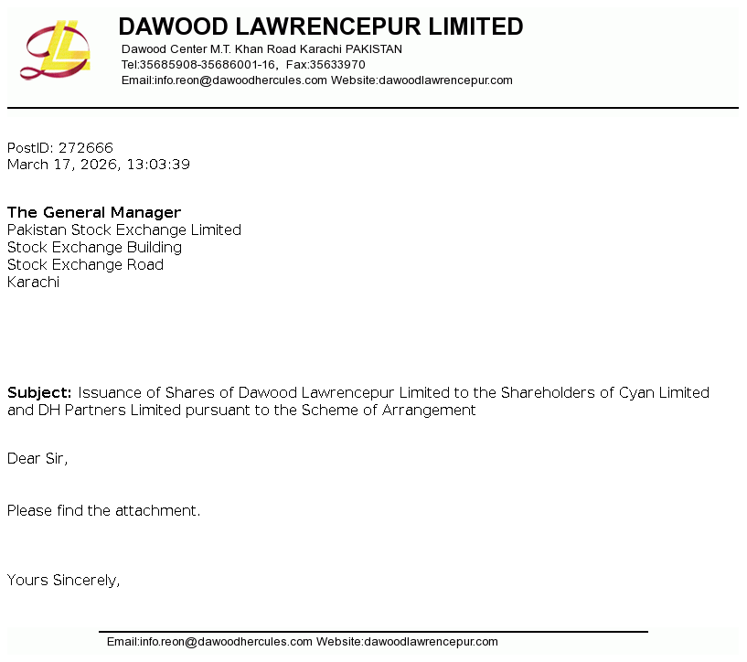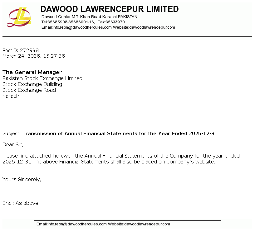 Dawood Lawrencepur Limited was incorporated in Pakistan in the year 2004 as a public listed company. It was formed as a result of a Scheme of Arrangement for Amalgamation in terms of the provisions of the (now repealed) Companies Ordinance, 1984 between Dawood Cotton Mills Limited (DCM), Dilon Limited (DL), Burewala Textile Mills Limited (BTM) and Lawrencepur Woollen and Textile Mills Limited (LWTM). The Company manages investment in its subsidiaries and associated companies and is engaged in the business of trading and marketing of renewable energy solutions, mainly solar, to commercial and industrial consumers, along with the legacy textile business.